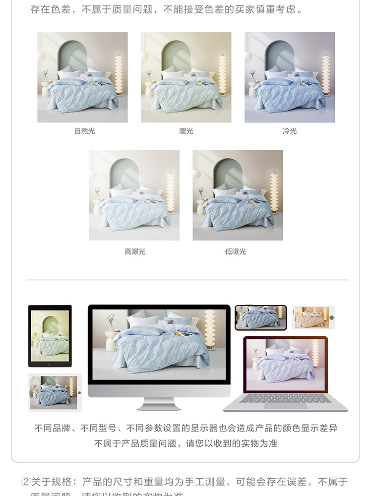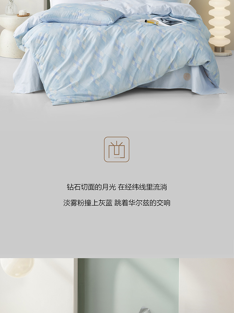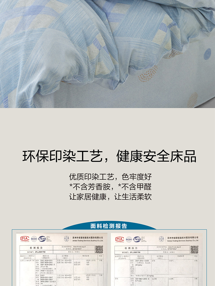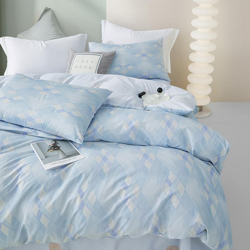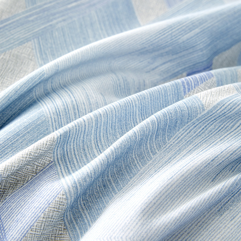 规格尺寸:枕套:48*74cmX2 被套:200*230cmX1 床单:230*240cmX1 外箱尺寸:54*42*38 cm 采用简约现代设计,淡蓝色调搭配几何图案,营造出宁静舒适的睡眠环境。选用优质面料,柔软亲肤,适合各种季节使用。 全棉面料亲肤舒适,柔软、吸湿透气。 采用简约现代设计,淡蓝色调搭配几何图案,营造出宁静舒适的睡眠环境。选用优质面料,柔软亲肤,适合各种季节使用。 全棉面料亲肤舒适,柔软、吸湿透气。