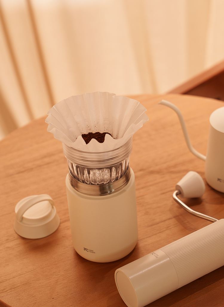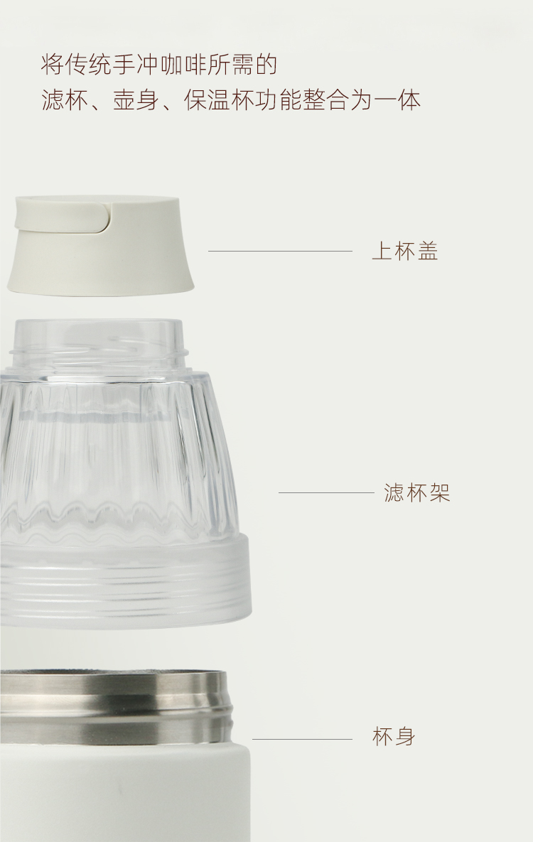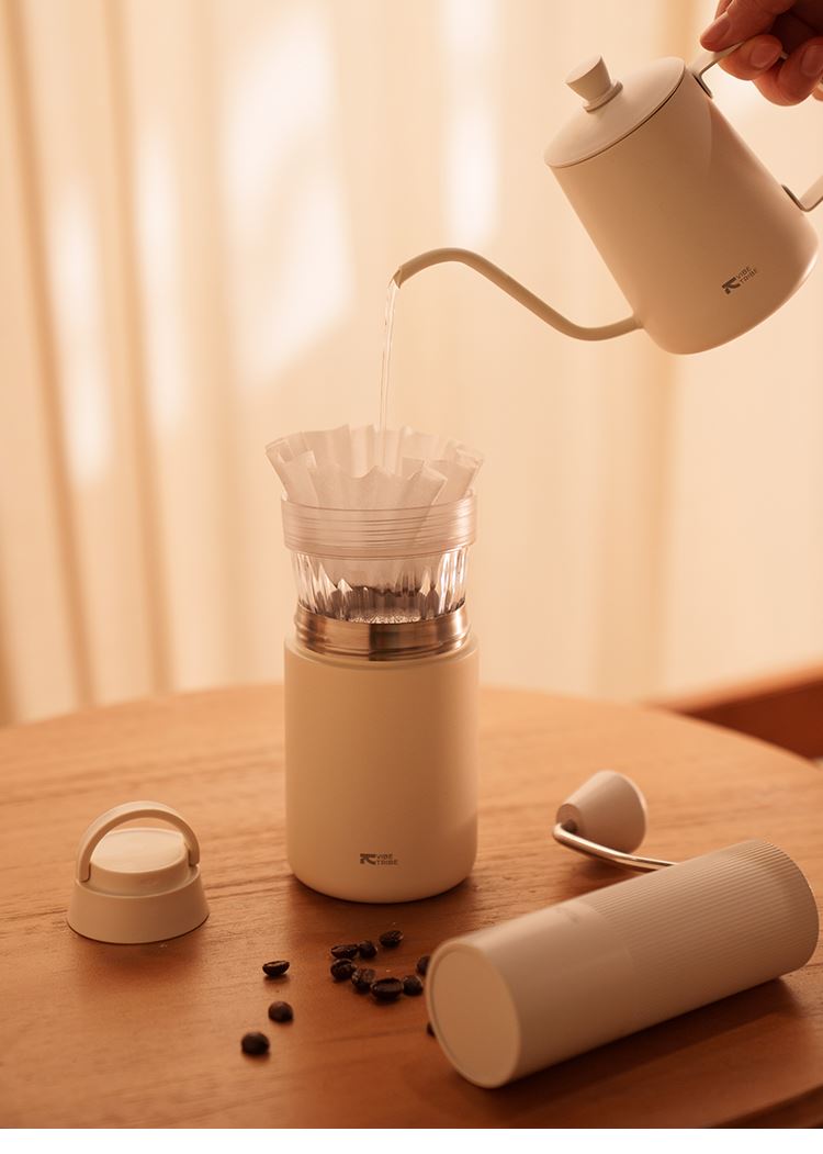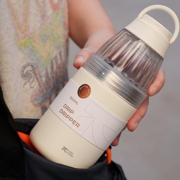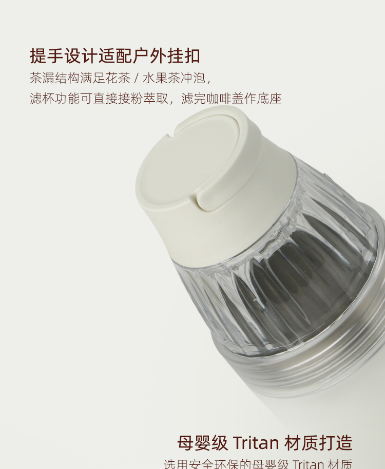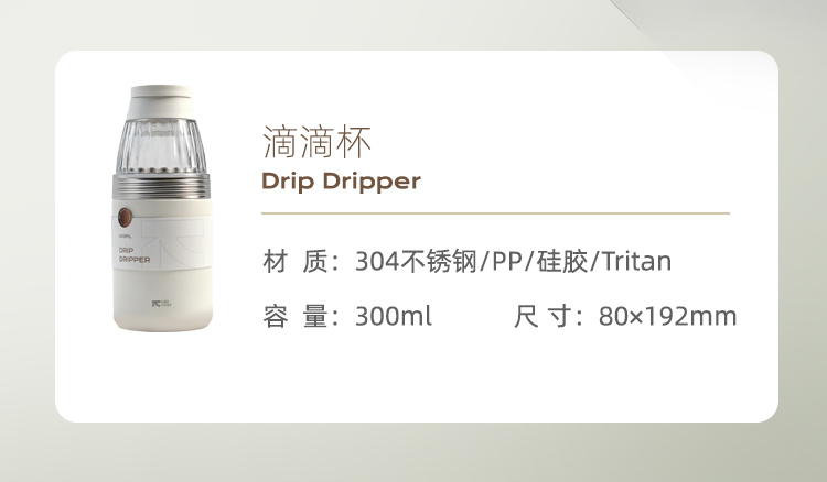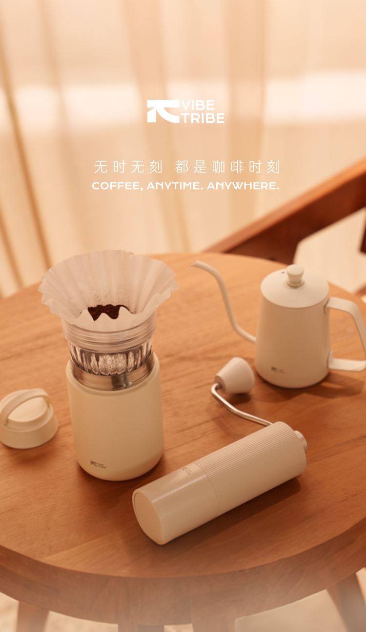 产品:VIBE-TRIBE滴滴杯 产品尺寸:80*192 mm 彩盒尺寸:85*85*195 mm 产品材质:304不锈钢、PP、Tritan、硅胶 核心卖点: 1. 提手设计适配户外挂扣,茶漏结构满足花茶 / 水果茶冲泡,滤杯功能可直接接粉萃取,滤完咖啡盖作底座,一杯覆盖「冲 - 滤 - 饮 - 存」全流程; 2. 双层不锈钢保温保冷(6 小时温差≤10℃),Tritan 滤杯耐摔透亮度高; 3.单手可握,居家、办公、户外一杯解锁全场景,分享咖啡。