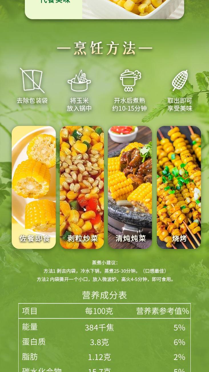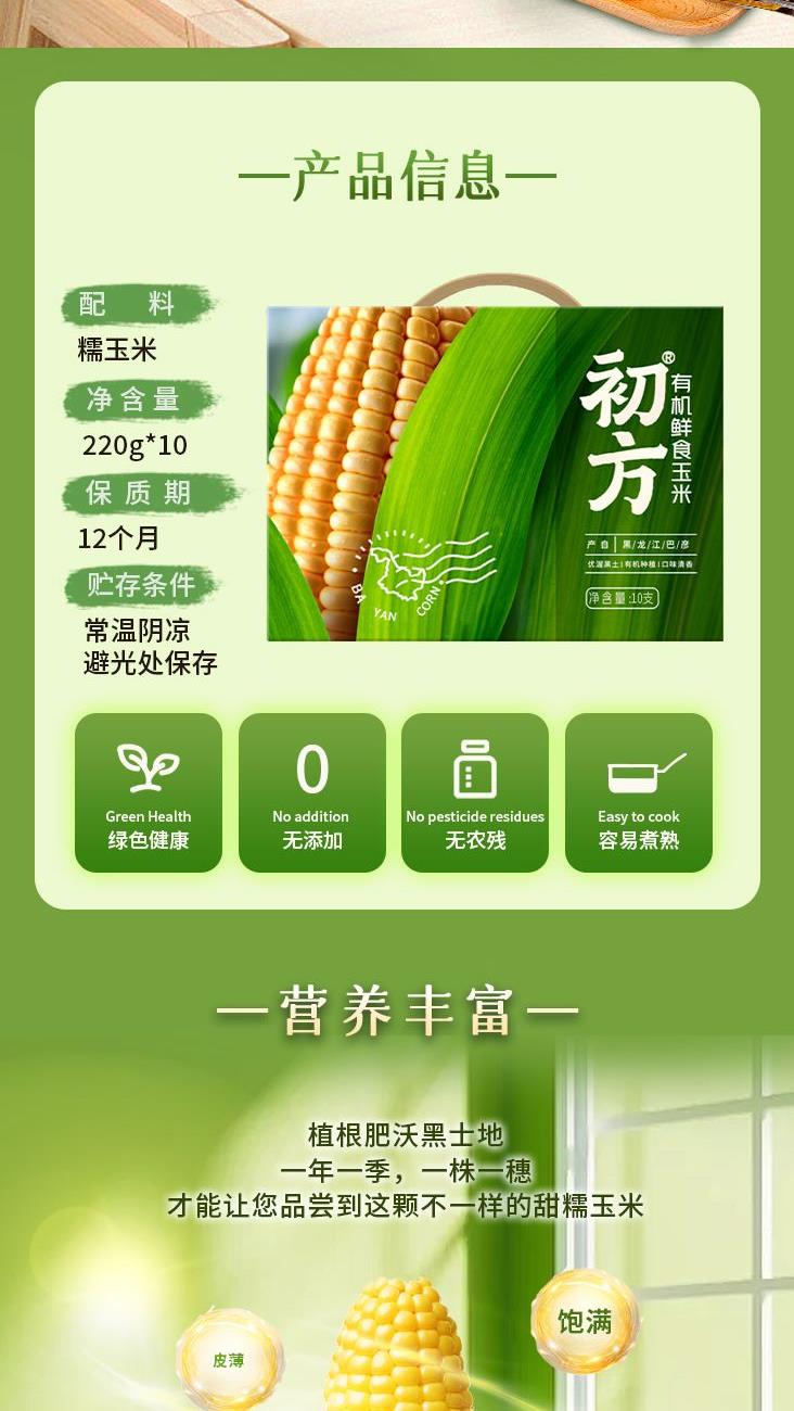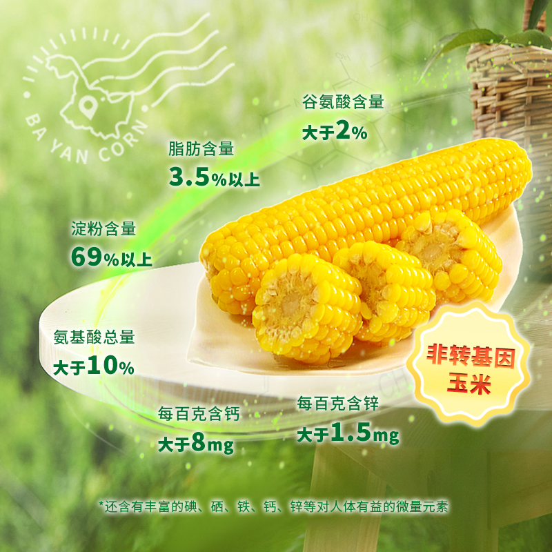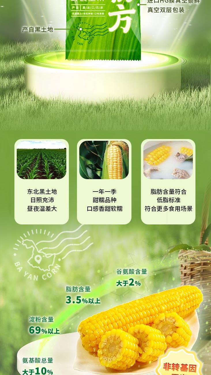①产地:巴彦县 ②包装规格: 220g*10穗 ③保质期:12个月 ④贮存条件:常温保存 ⑤产品指标:蛋白质3.8g/100g; ⑥产品卖点: 来自全国农产品地理标志的巴彦县肥沃有机黑土地 生长环境独特,气候适宜,土地肥沃,使得巴彦熟食玉米粒大、饱满、口感鲜美、营养丰富 每百克含硒量大于1.5毫克、含钙量大于8毫克,富含铁、锌等微量元素; 进口HG膜真空锁鲜,真空双层包装 在东北、四川、内蒙等优质玉米产区48种鲜食玉米中,选中巴彦玉米的香甜嫩滑、糯度适中。