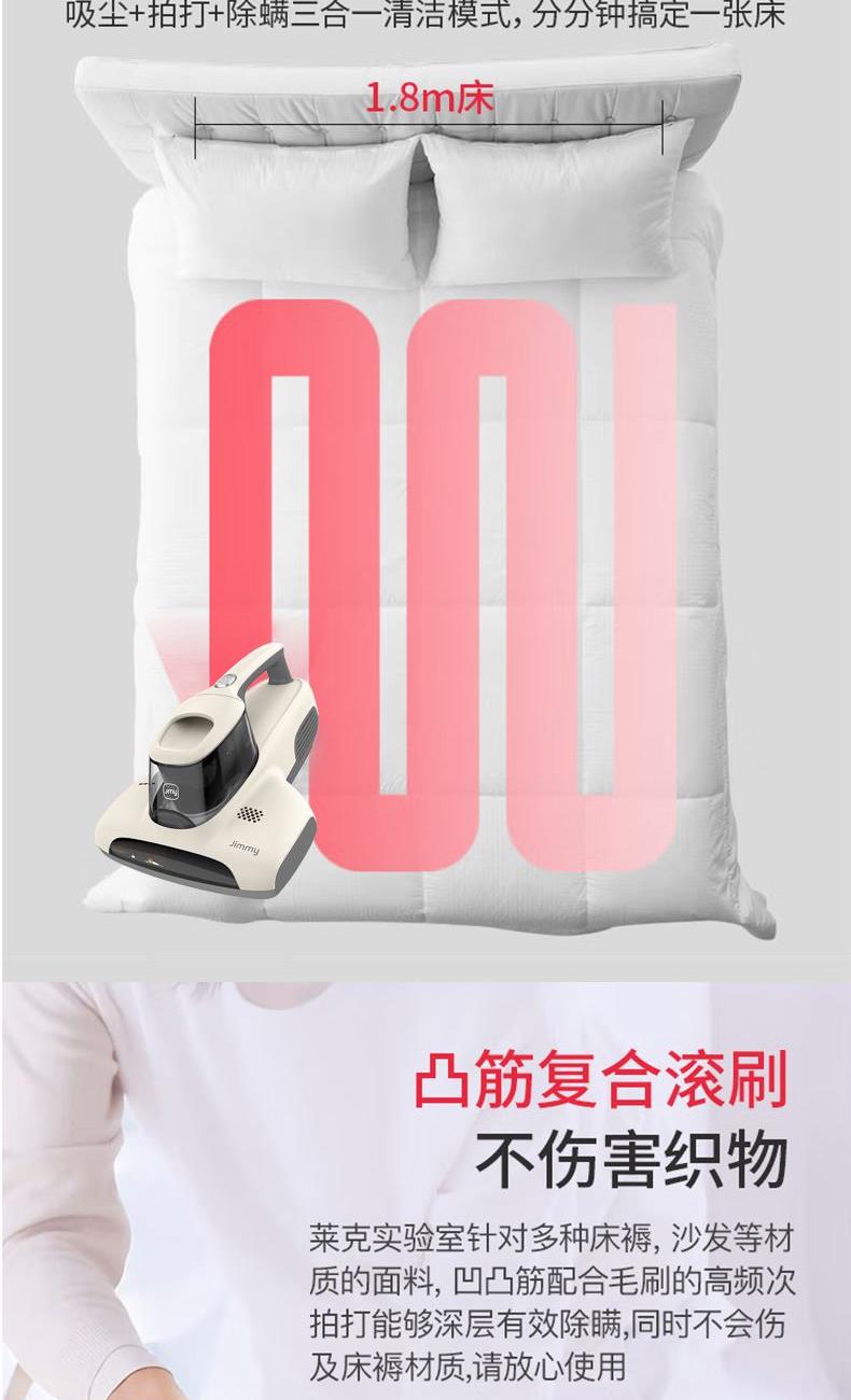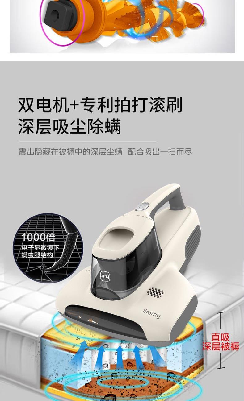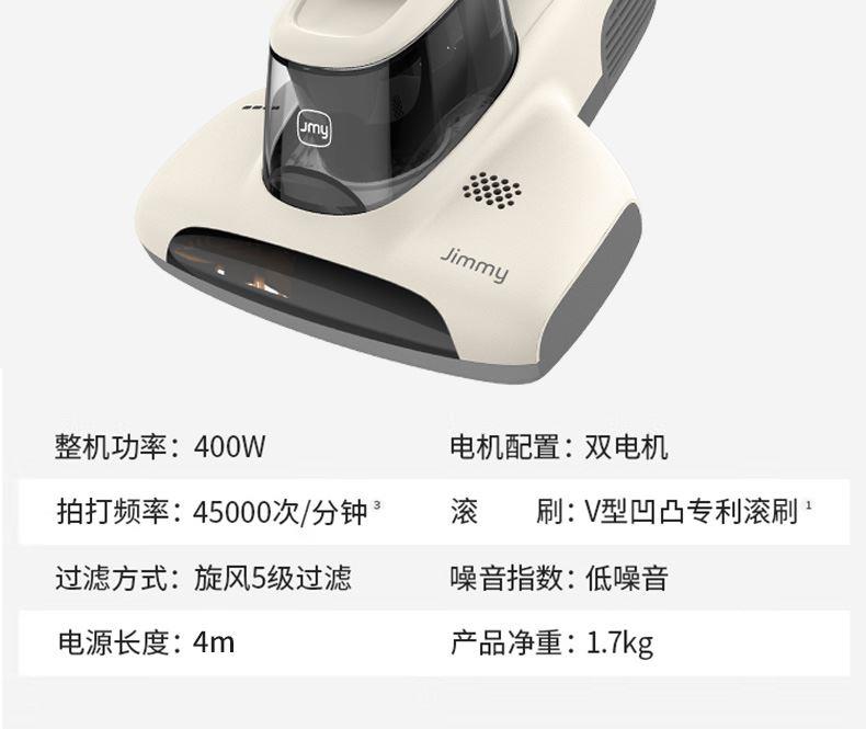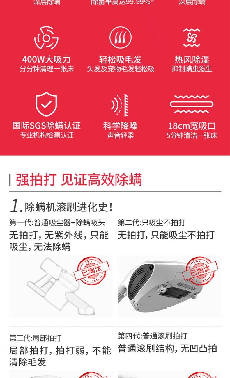 额定功率:500W 尘杯容积:0.3-0.4L 额定电压:220V 拍打方式:滚刷拍打 吸力:15kpa 电源线长:5m 产品尺寸:长337*宽267*高178mm 产品净重:2.15kg 包装清单:除螨机× 1 说明书× 1 保修卡× 1 合格证× 1 新升级复合滚刷,强拍打不伤被褥 吸毛不缠绕,宠物毛发轻松吸 英国抗过敏认证,除螨率99.9% 升级过滤,持久耐用不堵塞 热风除湿,保持床铺干爽