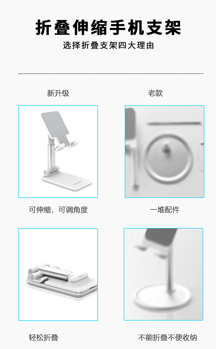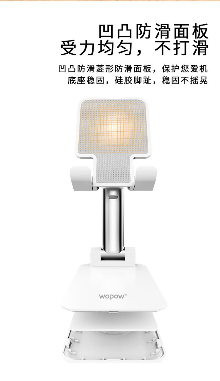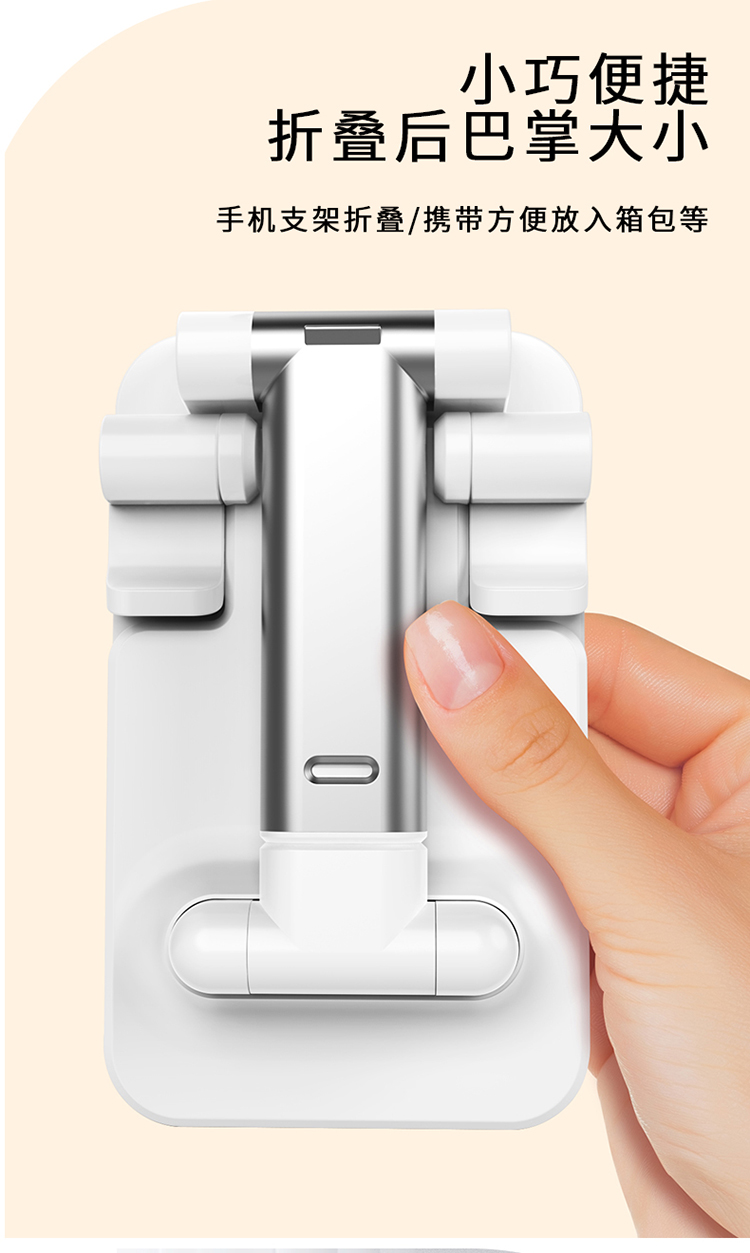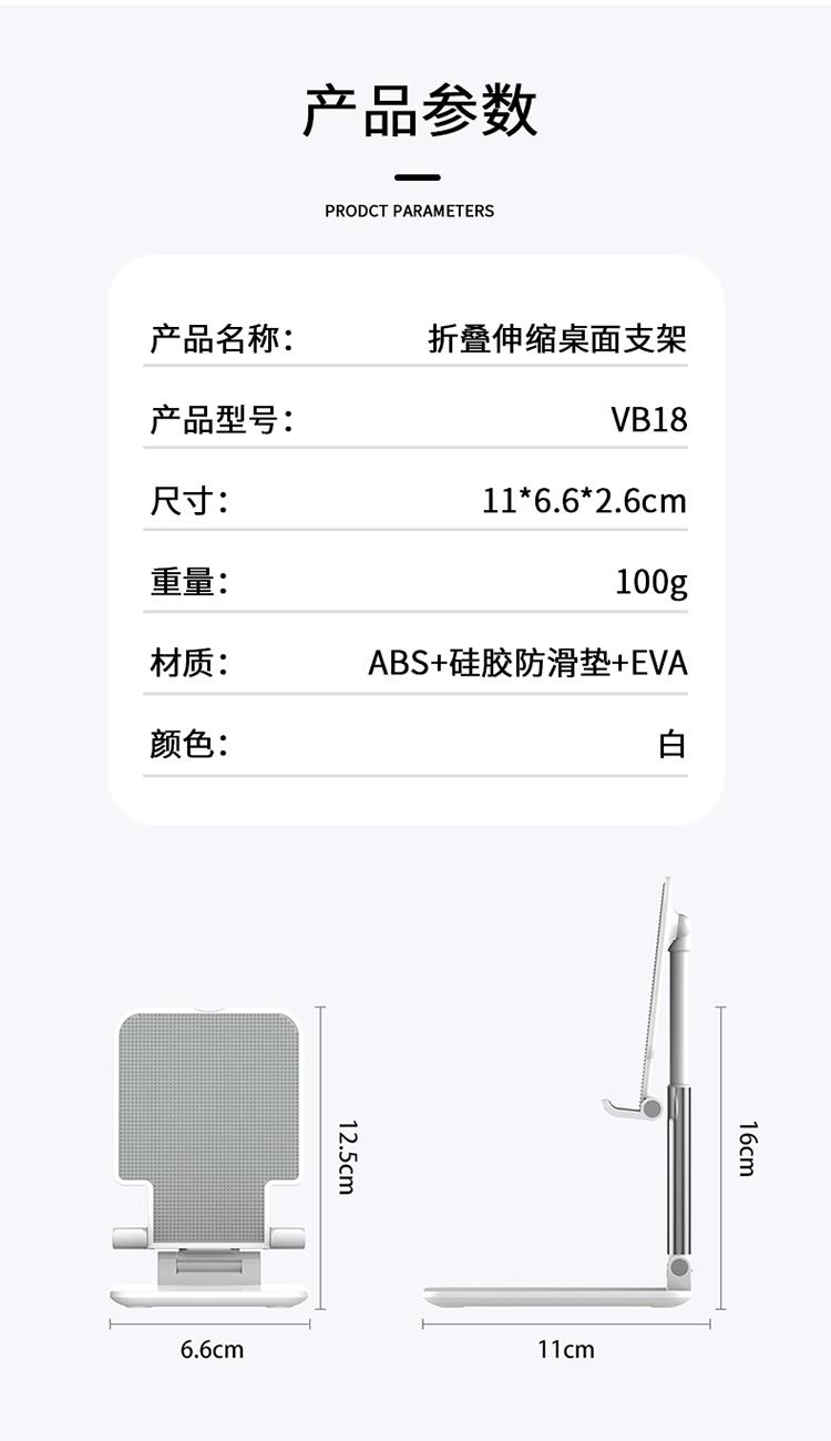 产品尺寸:11*6.6*2.6cm 包装尺寸:27.4*111.5*69mm 产品重量:100g 颜色:白色 材质:ABS+硅胶防滑垫+EVA 可折叠方便携带 多角度调节 自由升降 支撑力大,金属质感 硅胶垫防滑垫