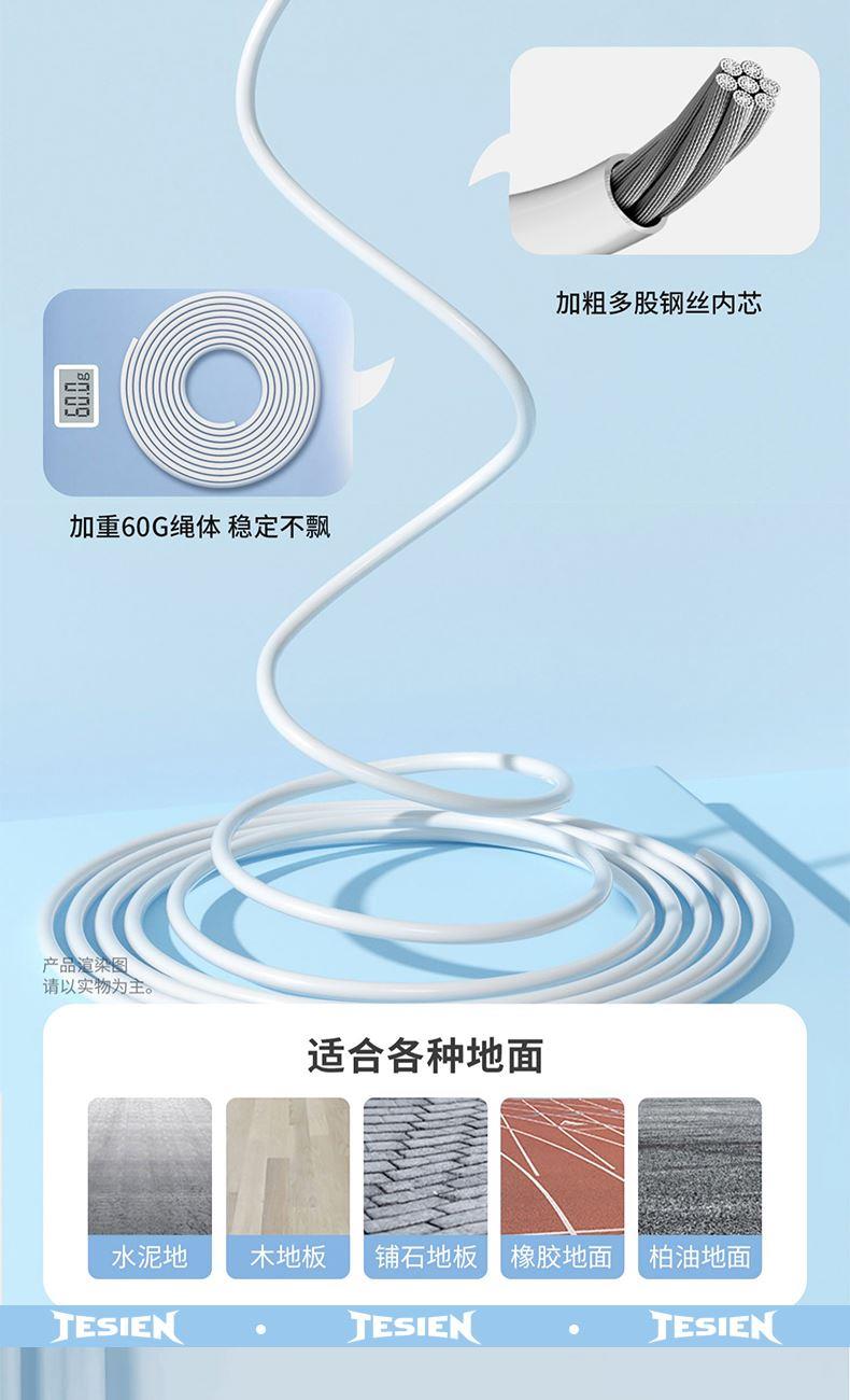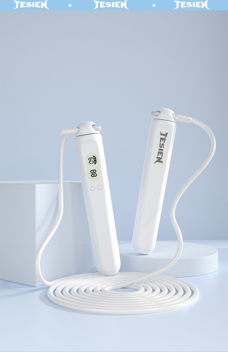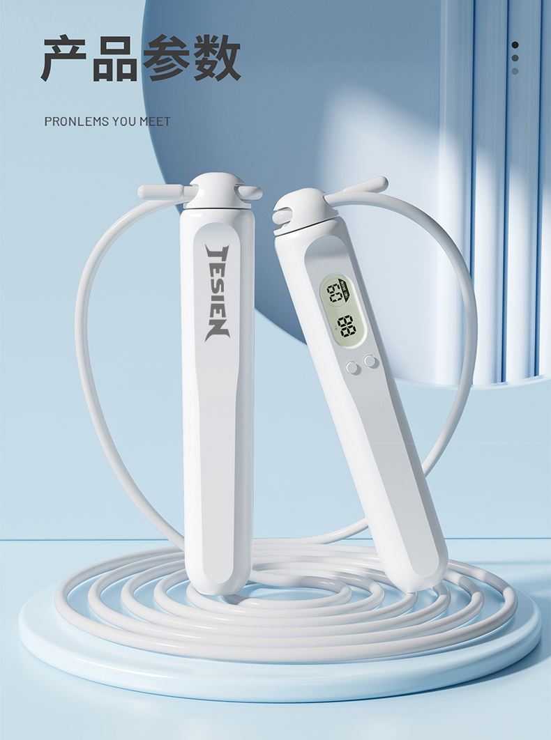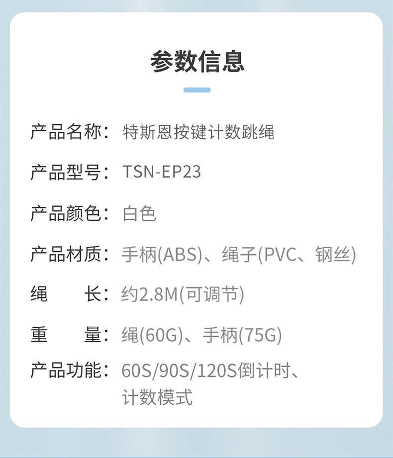 型号 TSN-EP23 材质 手柄:ABS 绳子:PVC+钢丝 颜色 白色 产品尺寸 绳长约2.8m 手柄2.5*17cm 包装尺寸:13*3.5*18cm 计数跳绳 人体工程学与便携性 流畅与耐用设计