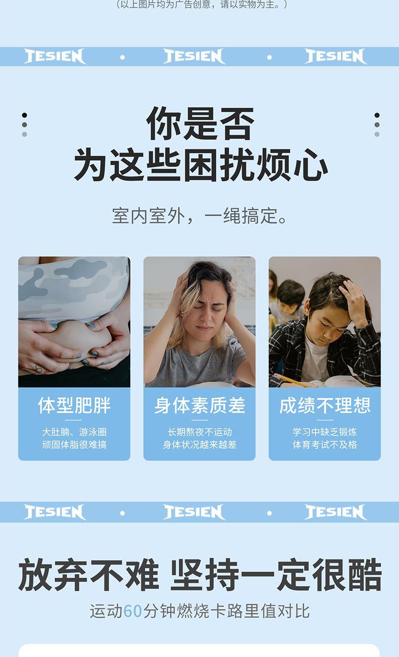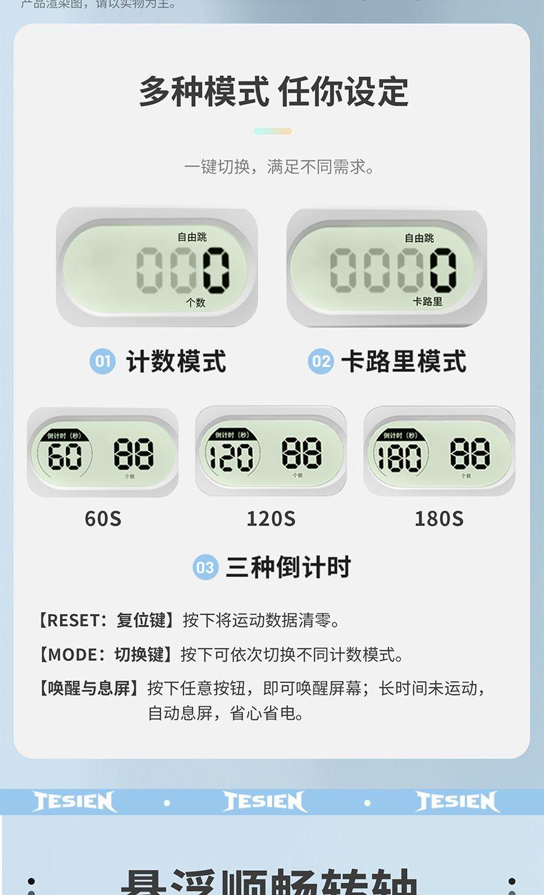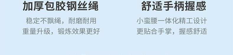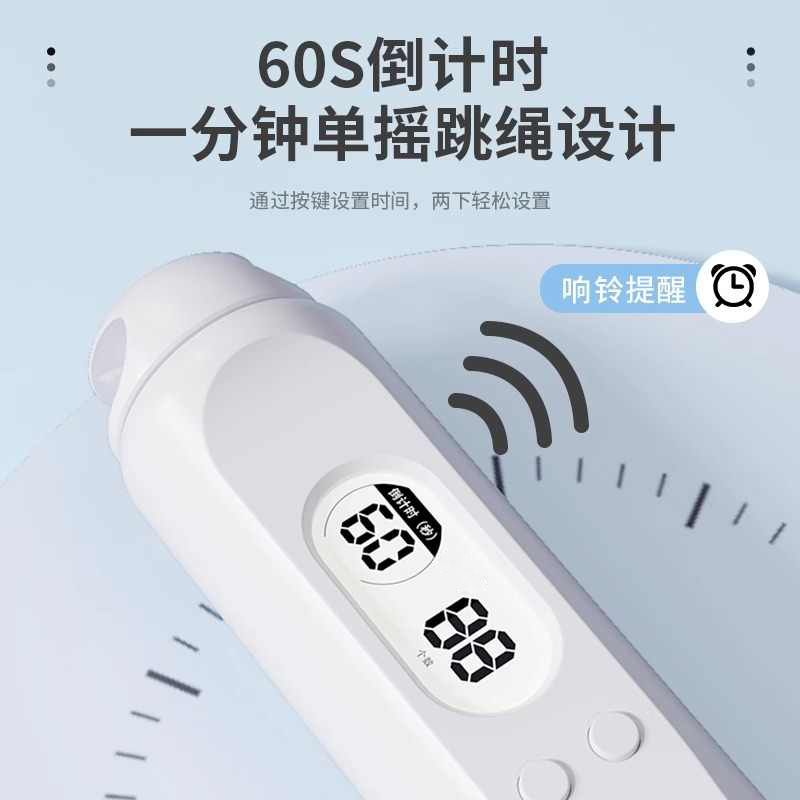 型号 TSN-EP23 材质 手柄:ABS 绳子:PVC+钢丝 颜色 白色 产品尺寸 绳长约2.8m 手柄2.5*17cm 包装尺寸:13*3.5*18cm 计数跳绳 人体工程学与便携性 流畅与耐用设计