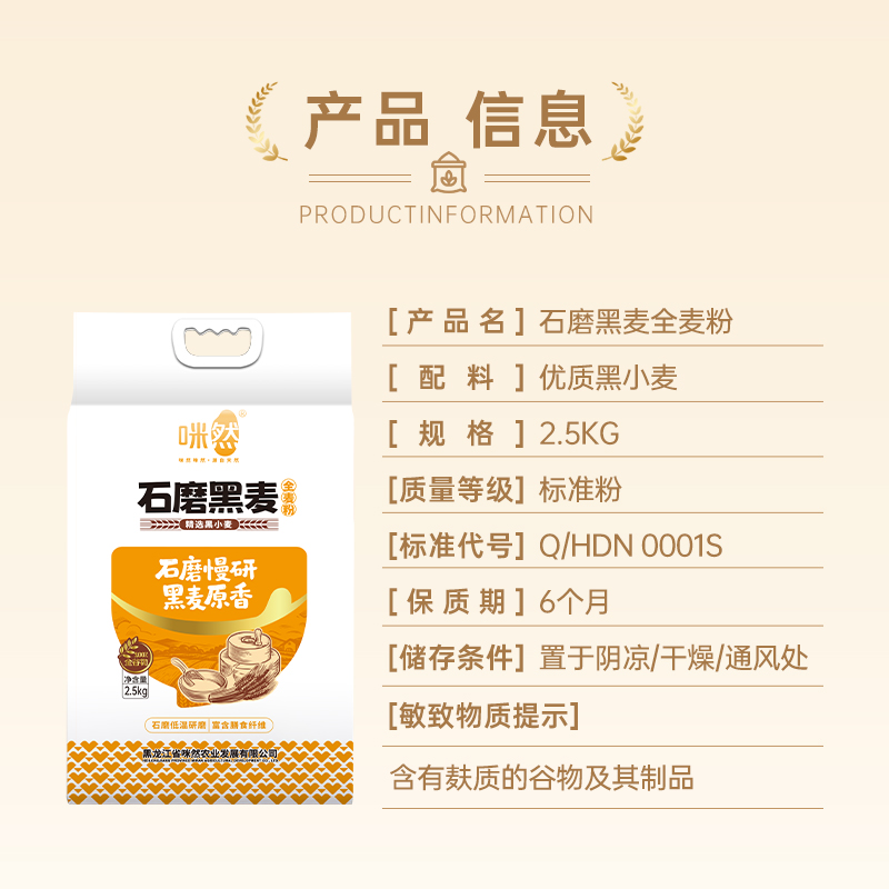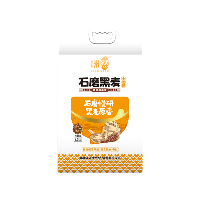 产 品 : 咪然石墨黑麦全麦面2.5kg 执行标准 : Q/HDN 0001S 保 质 期 :6个月 产 地 : 河南省濮阳市 箱 规 :10*2.5kg