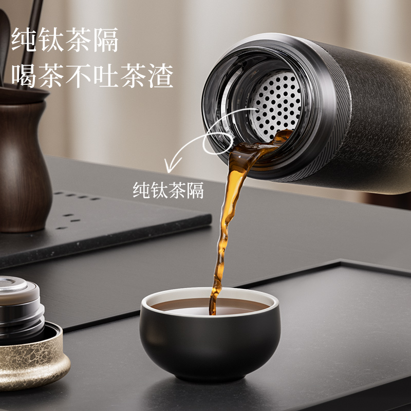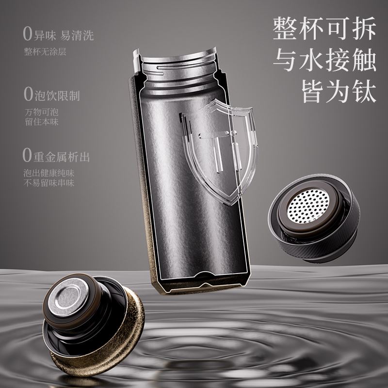 容量:400ml 产品尺寸:6.4*7.1*19.8cm 礼盒尺寸:22.5*18.5*10mm 内胆:纯钛 外胆:纯钛 密封圈:德国瓦克软硅胶 杯盖:PP聚丙烯 镜面内胆钛磁悬抛光技术 健康纯钛 茶水分离保鲜 0异味易清洗 0泡饮限制 万物可泡留住本味 0重金属析出 泡出健康纯味不易留味串味