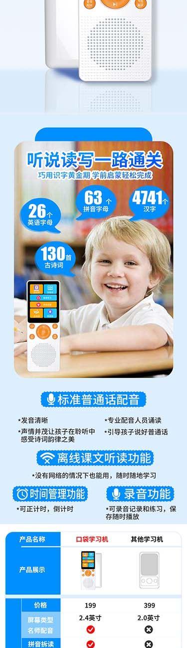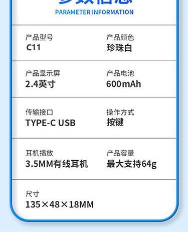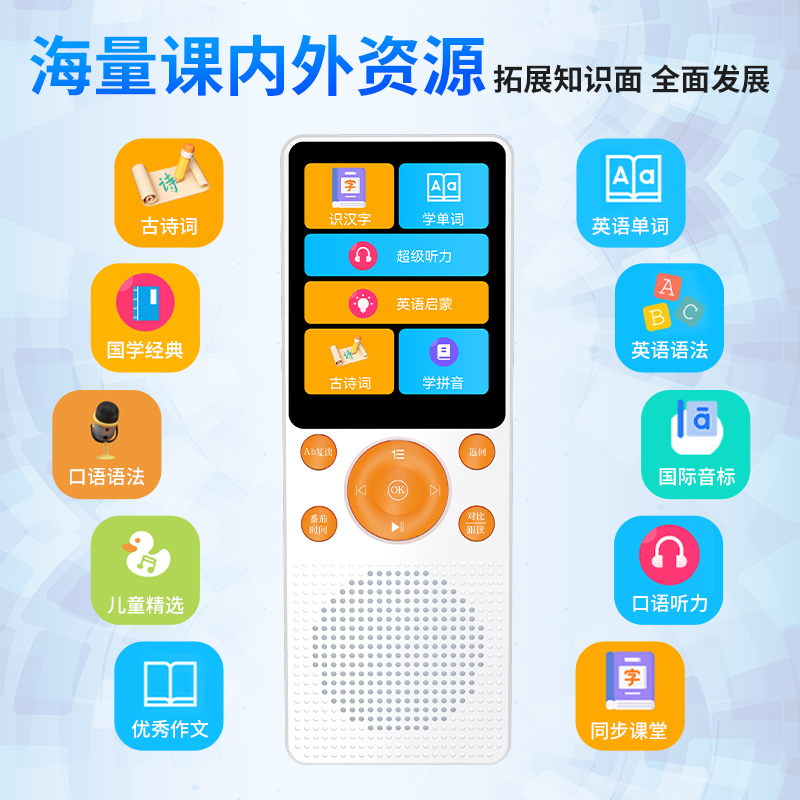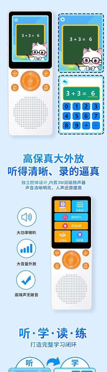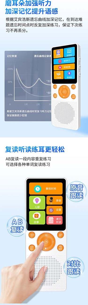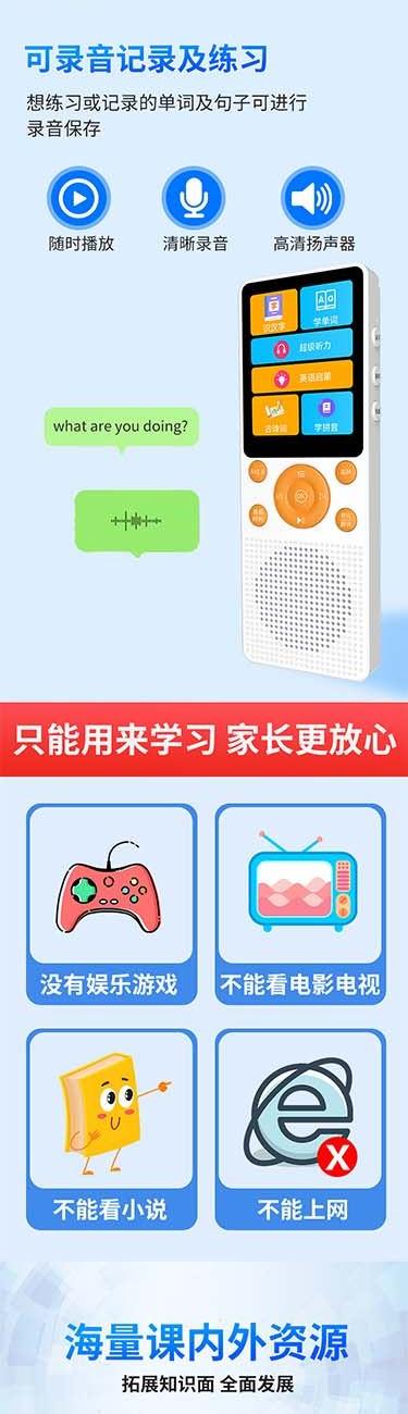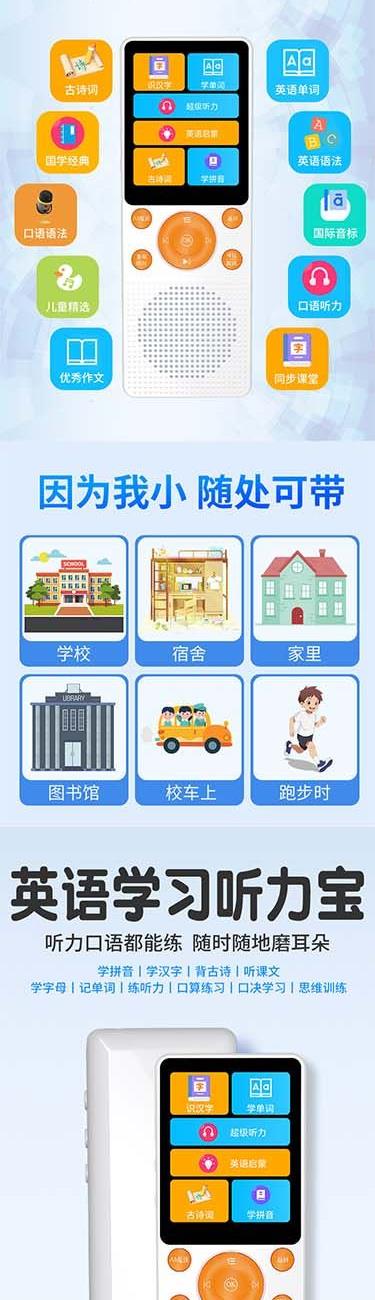产品重量:85g/190g 产品尺寸:119*50*11mm 彩盒尺寸:166*96*45mm 产品特点: 英语听力复读,支持录音跟读、复读、变速播放 同步小学-初中英语/语文教材,支持课文听读 内置词典,英汉翻译,查单词、词汇分析 内置国学故事,支持蓝牙连接播放、扩展卡播放 2.4吋高清显示屏,内置电池支持便携使用,长时间续航