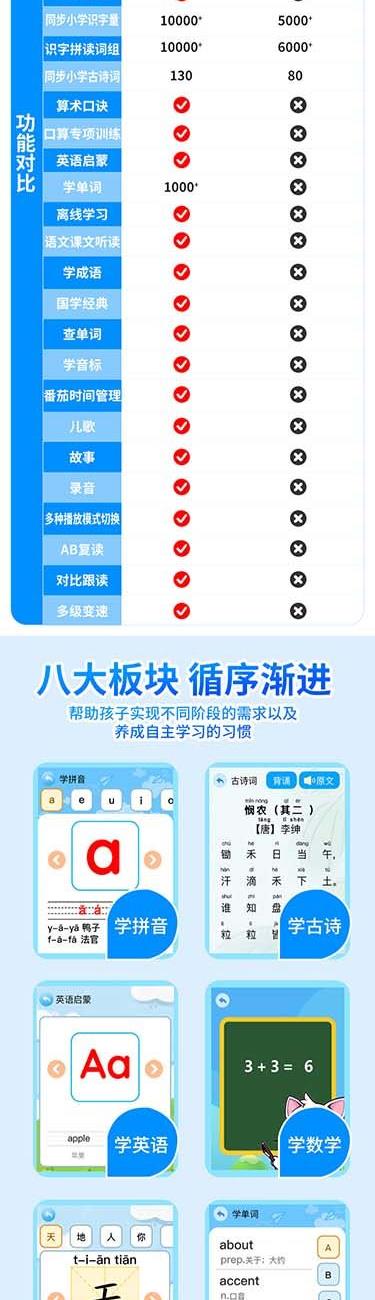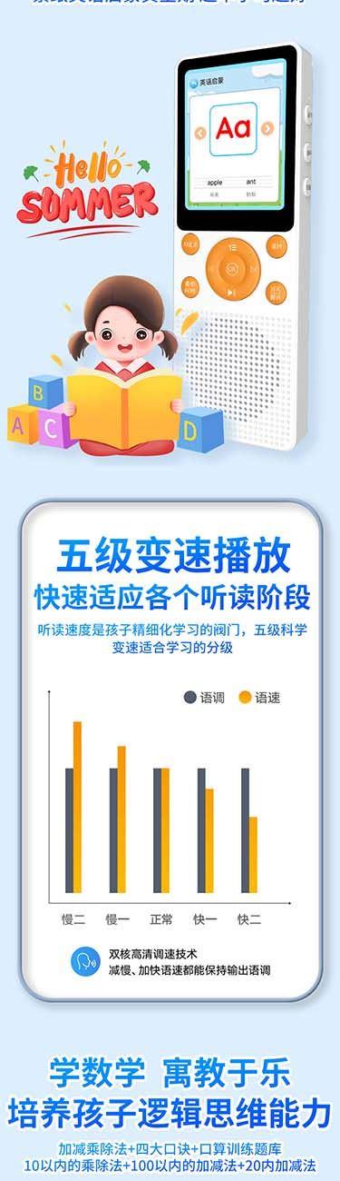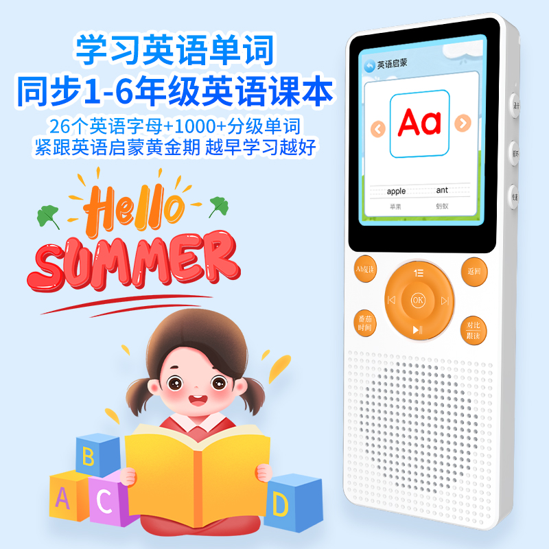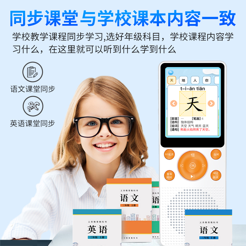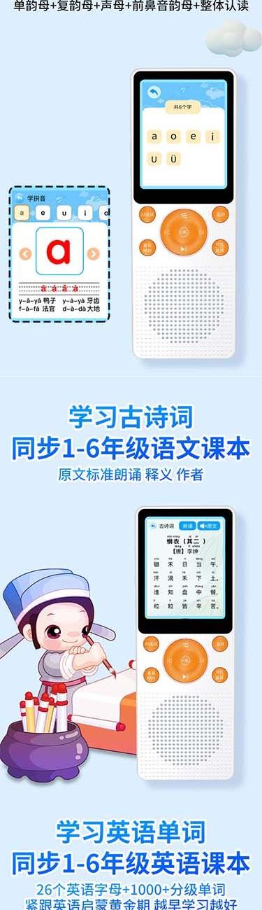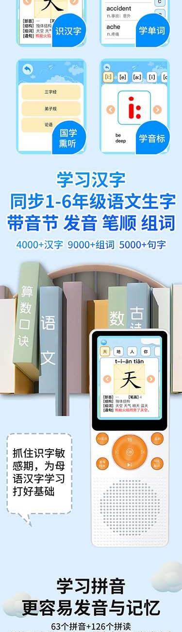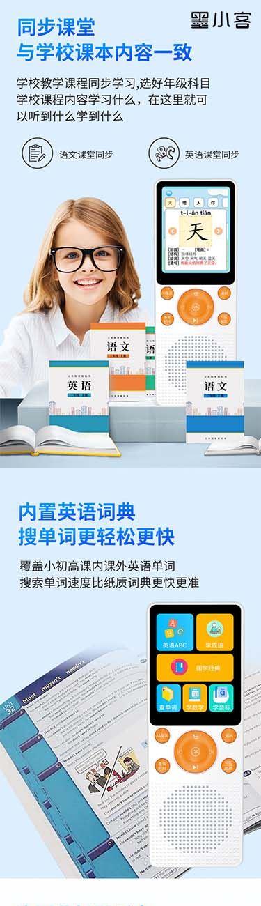 产品重量:85g/190g 产品尺寸:119*50*11mm 彩盒尺寸:166*96*45mm 产品特点: 英语听力复读,支持录音跟读、复读、变速播放 同步小学-初中英语/语文教材,支持课文听读 内置词典,英汉翻译,查单词、词汇分析 内置国学故事,支持蓝牙连接播放、扩展卡播放 2.4吋高清显示屏,内置电池支持便携使用,长时间续航