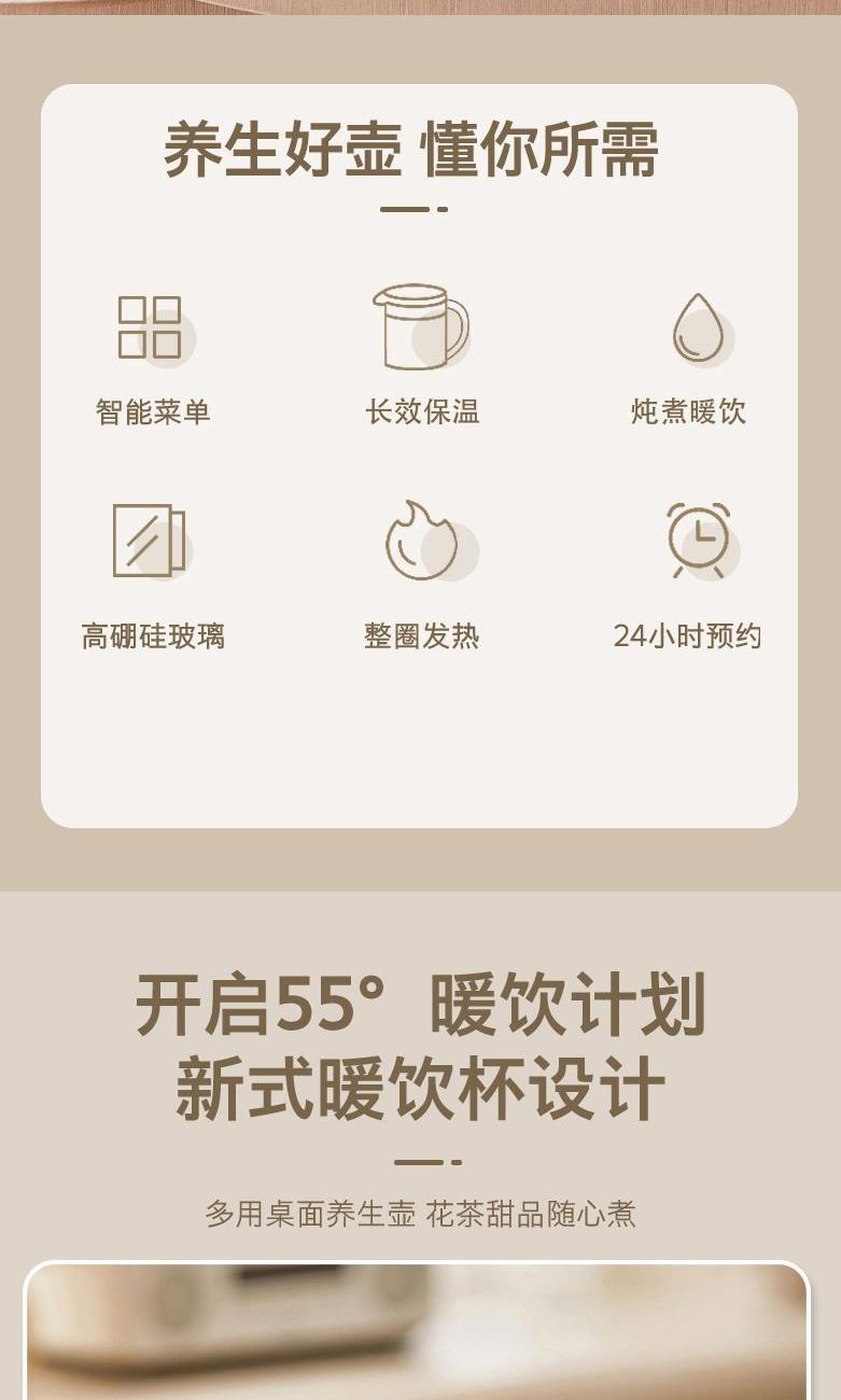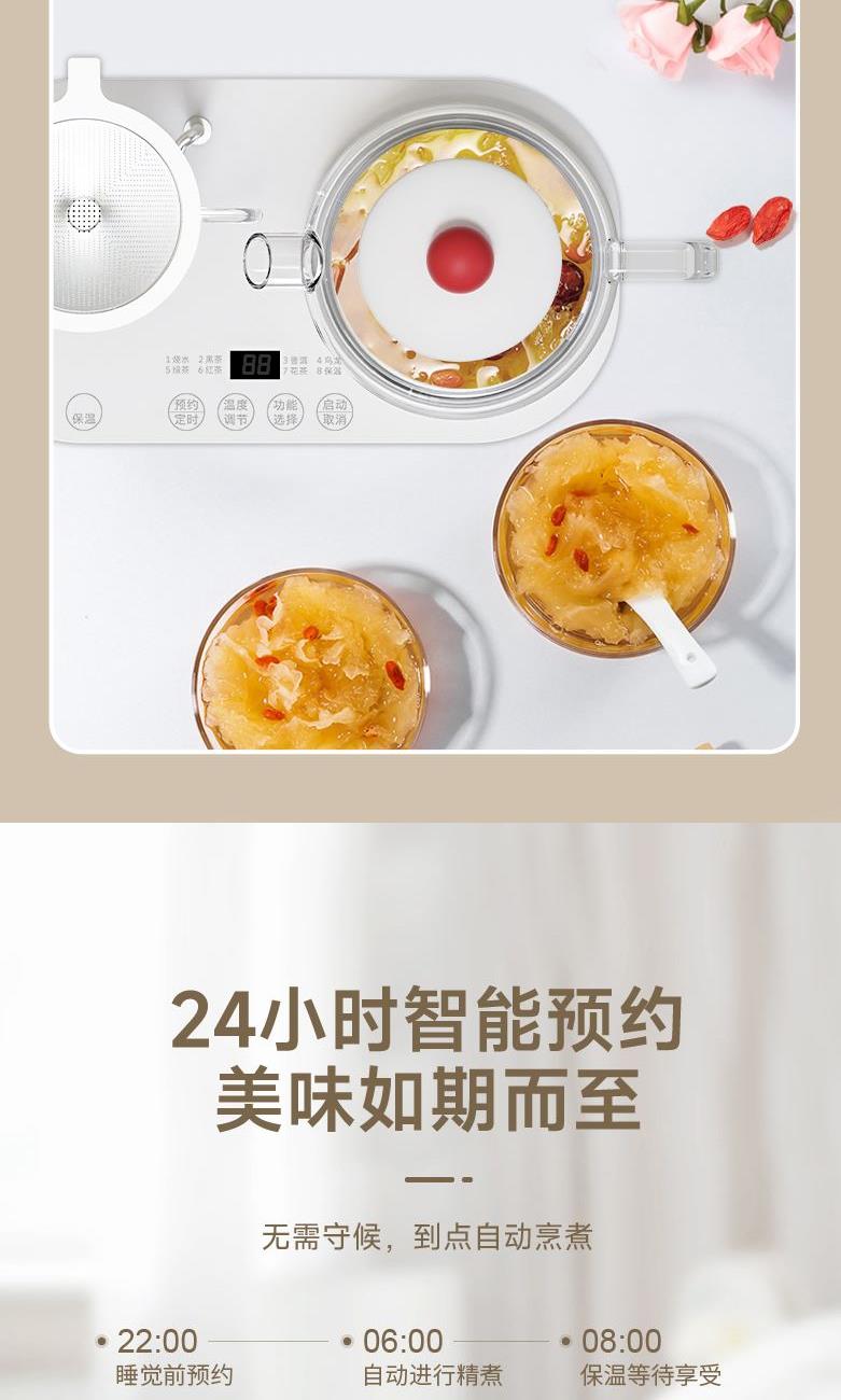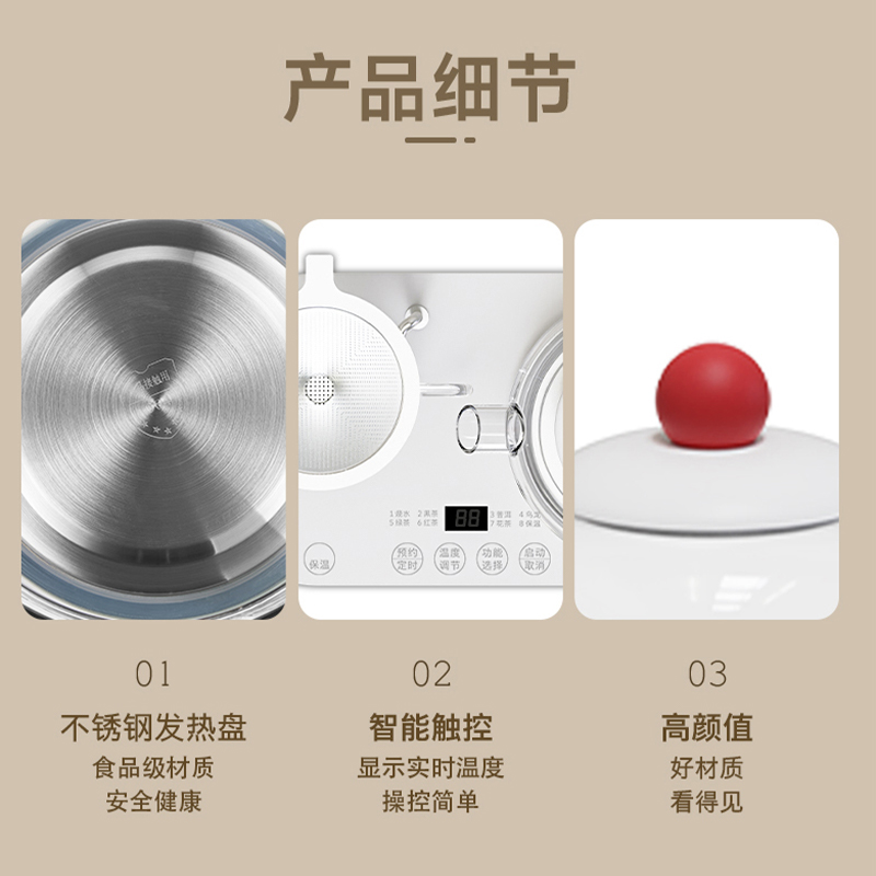 额定电压:220V~ 额定功率:800W 额定频率:50Hz 容 量:0.9L 功能:烧水、黑茶、普洱、乌龙、绿茶、红茶花茶、保温 多档控温、8种模式、暖杯设计,触控面板控温,多种模式满足不同需求 加厚高硼硅玻璃,耐高温耐冷热交替,经久耐用 不锈钢滤茶网,无异味,不易生锈 食品级PP塑料,无毒无味,安心使用