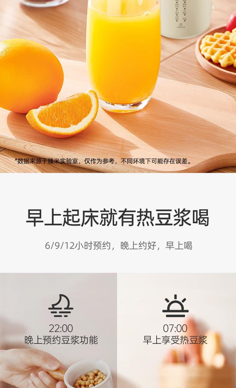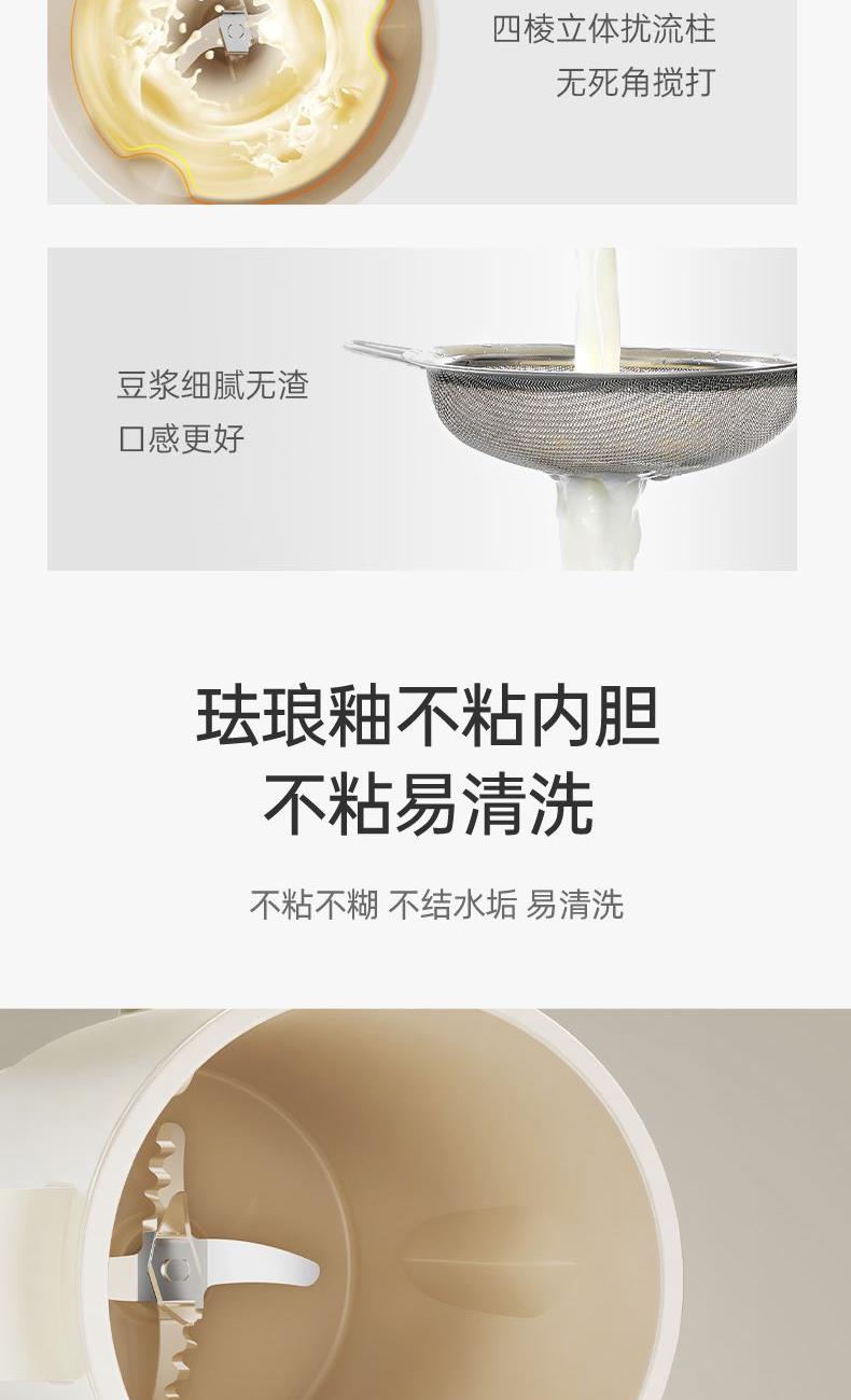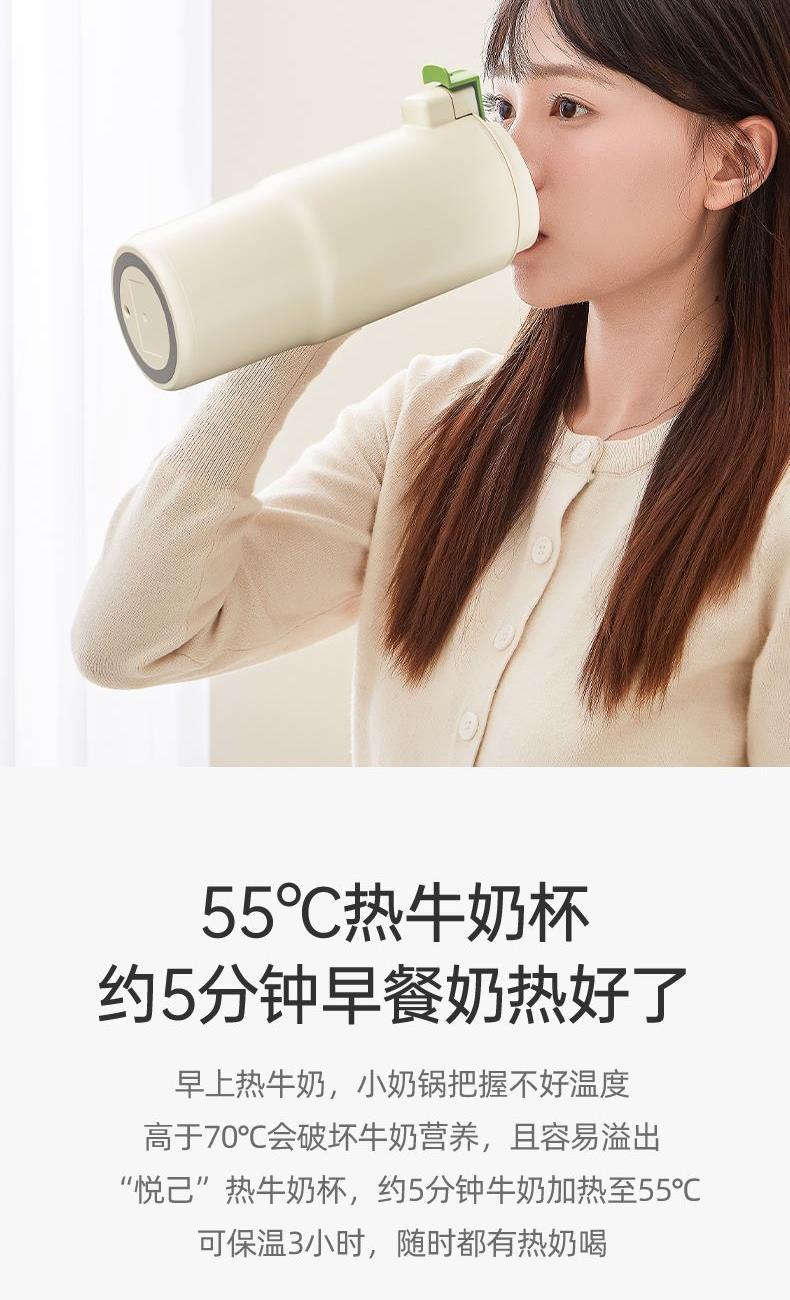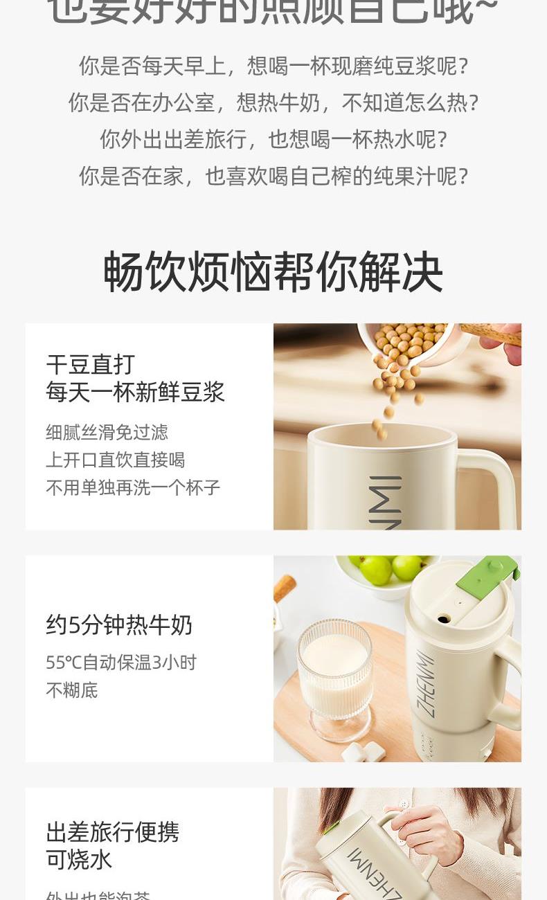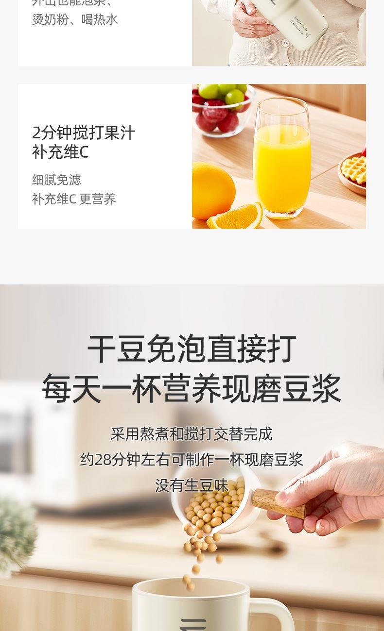 1.55度温牛奶,低温搅拌,可做燕麦奶,快乐翻倍; 2.100度烧水, 3.一键豆浆,免泡豆,高温直打免过滤; 4.营养果汁,多种营养DIY自由搭配; 5.9H小时一键预约,元气早餐,无需早起; 360ML精致容量,一人食,不浪费; 4.6H、55度保温,不怕放凉 5.轻巧放便。出行易带; 6.升级版(珐琅釉不粘内胆)配置;
