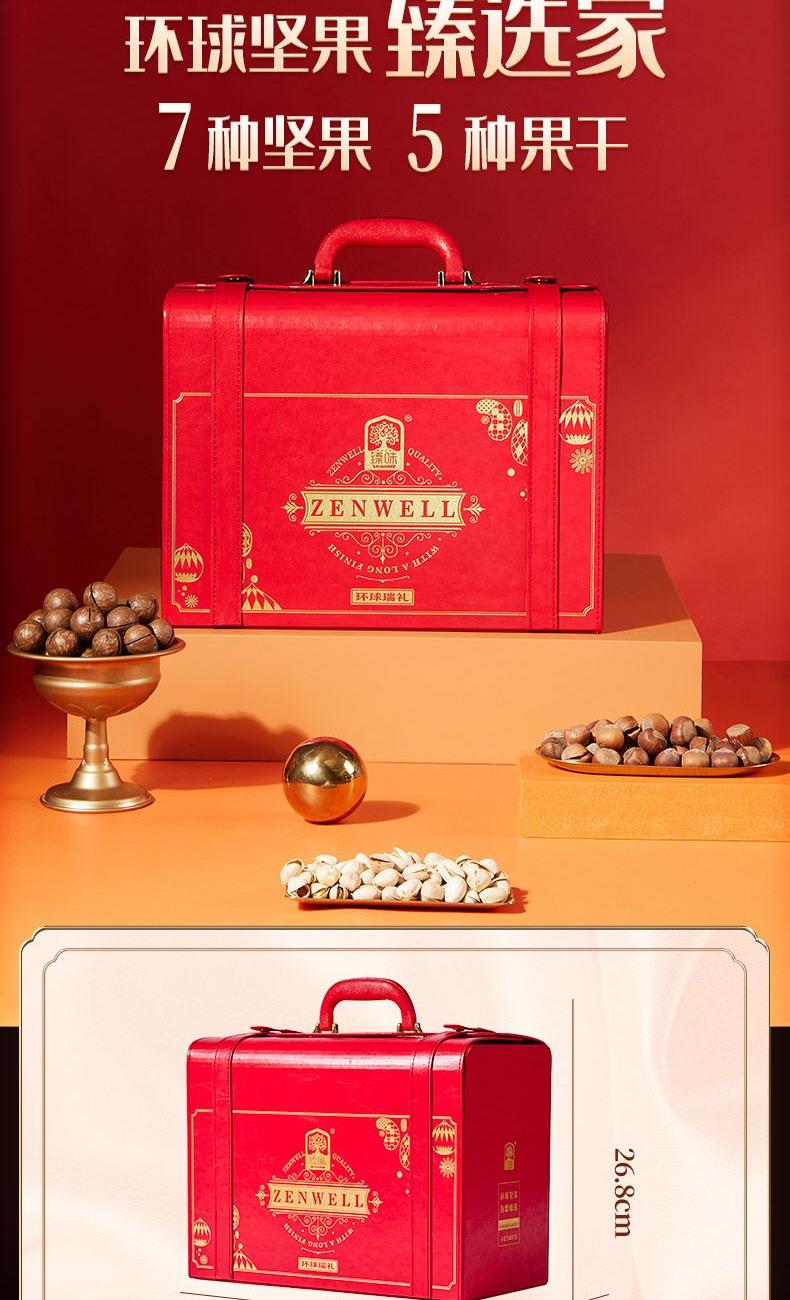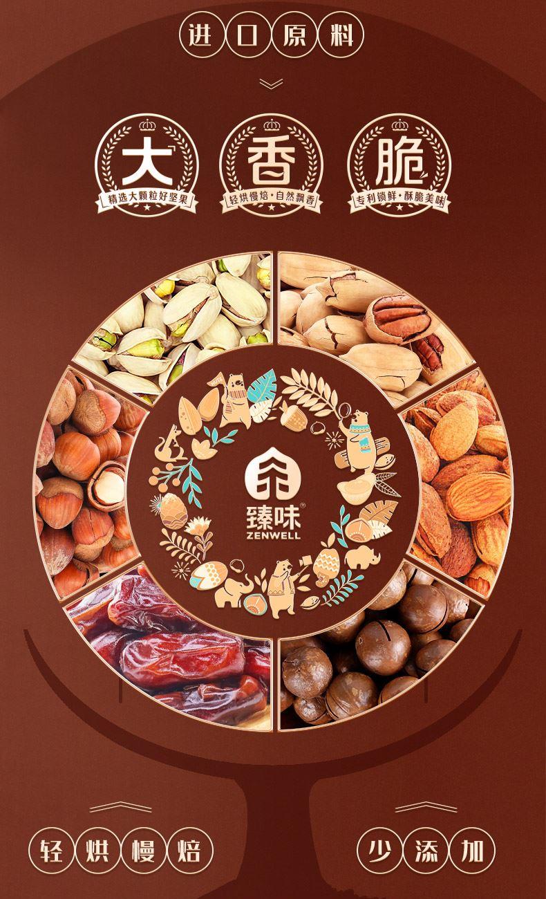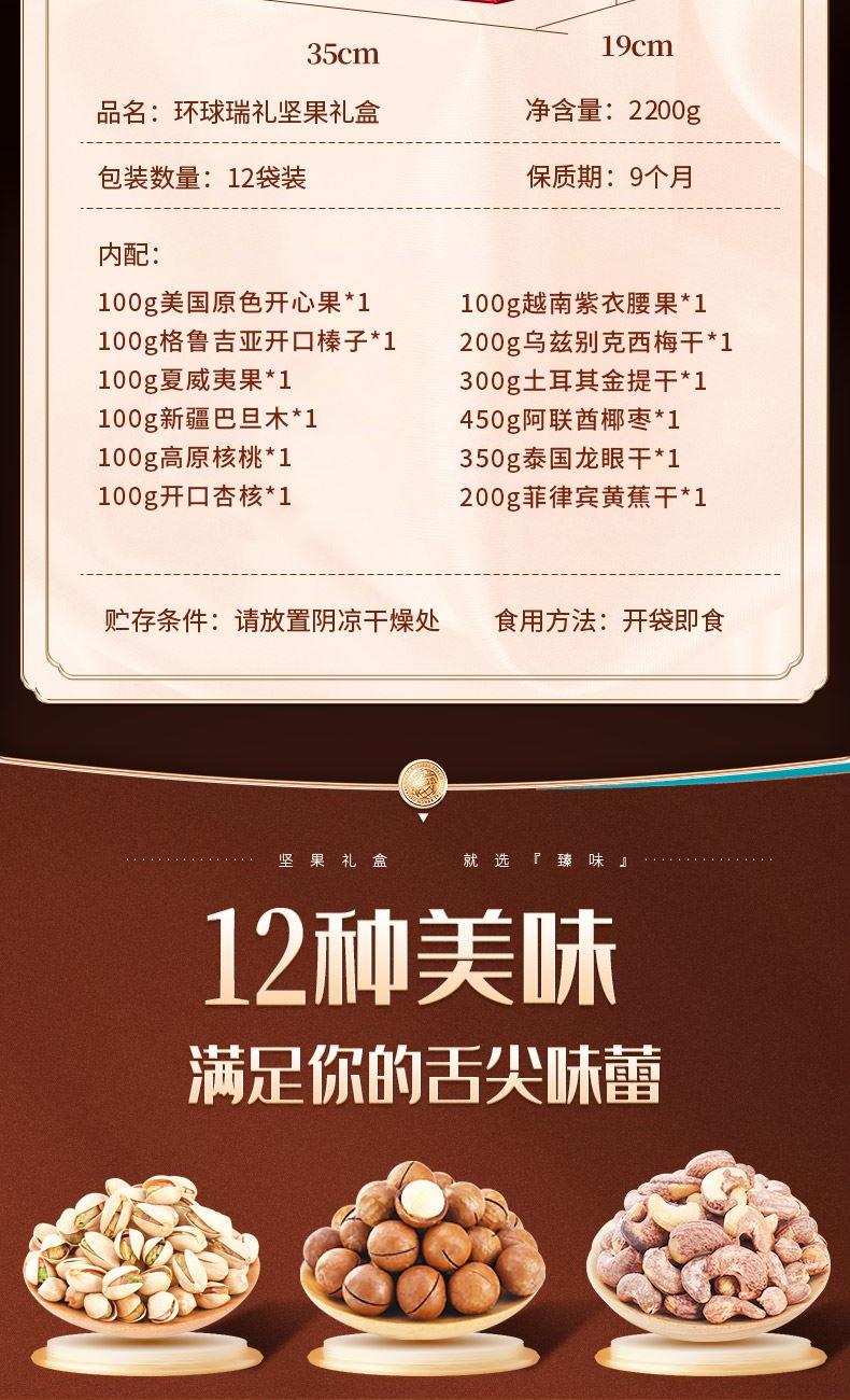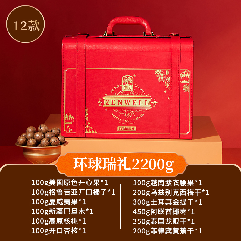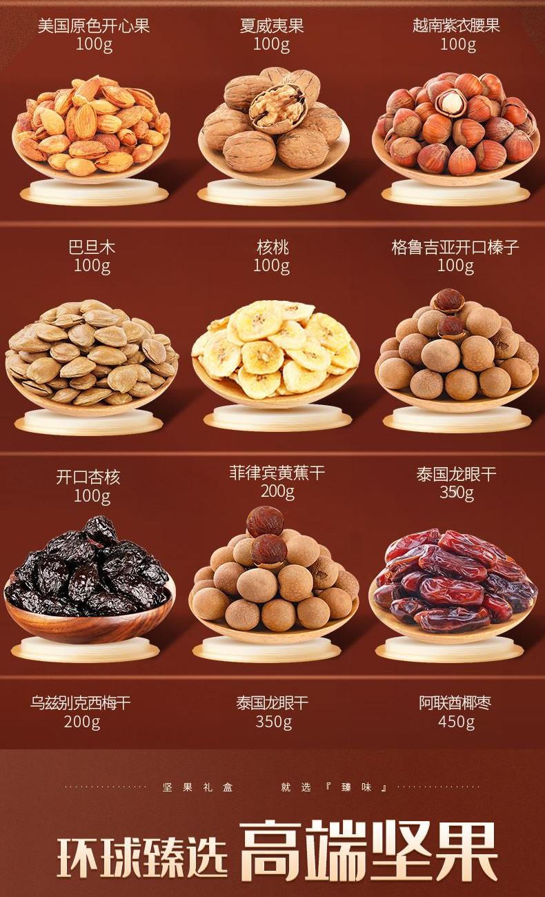 100g美国原色开心果*1 100g格鲁吉亚开口榛子*1 100g夏威夷果*1 100g新疆巴旦木*1 100g高原核桃*1 100g开口杏核*1 100g越南紫衣腰果*1 200g乌兹别克西梅干*1 300g土耳其金提干*1 450g阿联酋椰枣*1 350g泰国龙眼干*1 200g菲律宾黄蕉干*1