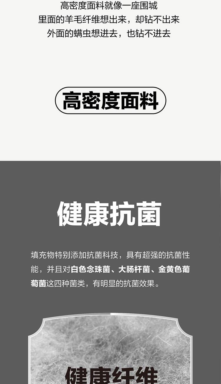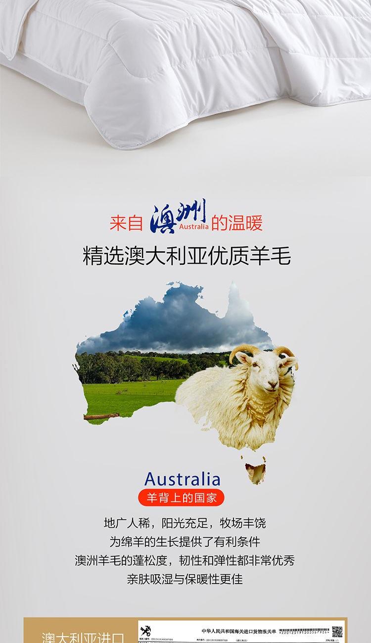 填充物精选澳大利亚羊毛填充,澳毛是国际公认的高质羊毛,羊毛的长度,白度以及重量、柔软度、强度、耐用性和外观持久性方面均较为出色,毛质柔软细腻,吸湿能力强,恒温保暖,天然回弹性佳;并对白色念珠菌、大肠杆菌、金黄色葡萄球菌,有明显的抑制效果。