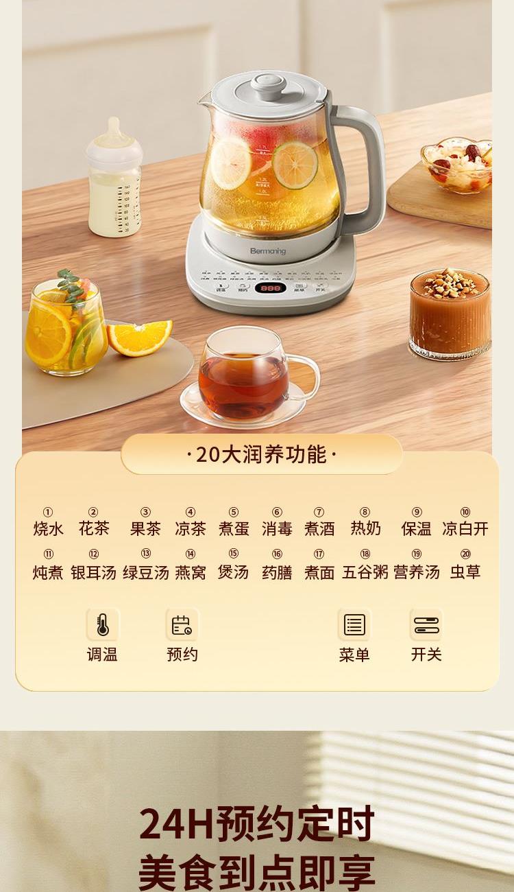 功 率:1000W 容 量:1700ML 材 质:高硼硅玻璃 净 重:1.3kg 毛 重:1.7kg 操作模式:按键版 1000W大功率 热力强劲,煮得快,美味不等待 1.7L黄金容量 容量刚刚好,养生自在,全家畅饮无压力 20大润养功能,一味一程序,道道都专业 304不锈钢发热盘,食品级材质,安心每一口 智能变频温控,火候自动适配 NTC灵敏温控 实时测温,防干烧,防糊底,防溢锅,安全加倍 24H长效预约,美味准时赴约,无需苦等。
