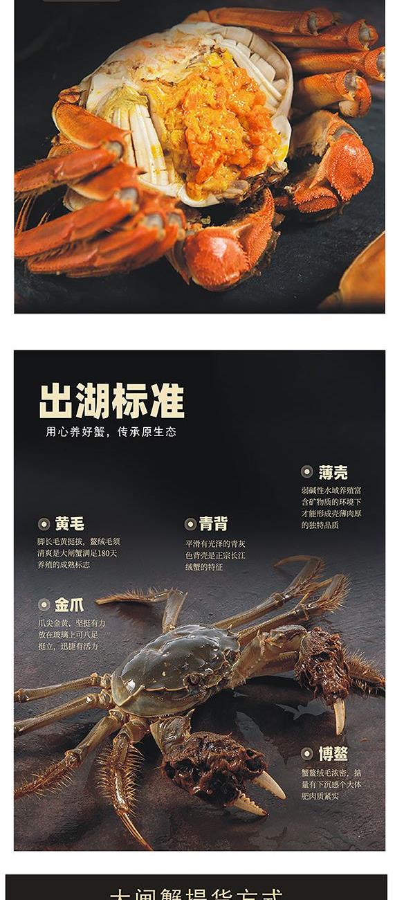 产品规格: 公蟹:5.5两*6只 母蟹:4.5两*6只 卡套形式:精美提货卡+品蟹工具八件套+精美礼盒 实物附赠:食蟹工具、蟹醋、姜茶、紫苏、保温冰袋。 售后承诺:阳澄湖空运直达,死蟹、残蟹包赔。 简介: 贝师傅大闸蟹其创始人贝建国先生是阳澄湖蟹传统养蟹人,从事养蟹近四十年。坚持以玉米、小鱼、田螺等传统饲料喂养保证大闸蟹能够拥有良好的生长环境。在苏州市阳澄湖核心水域拥有广阔的养殖基地。因此真正实现了原产地发货。把美味的大闸蟹从阳澄湖直接送到美食者的餐桌。