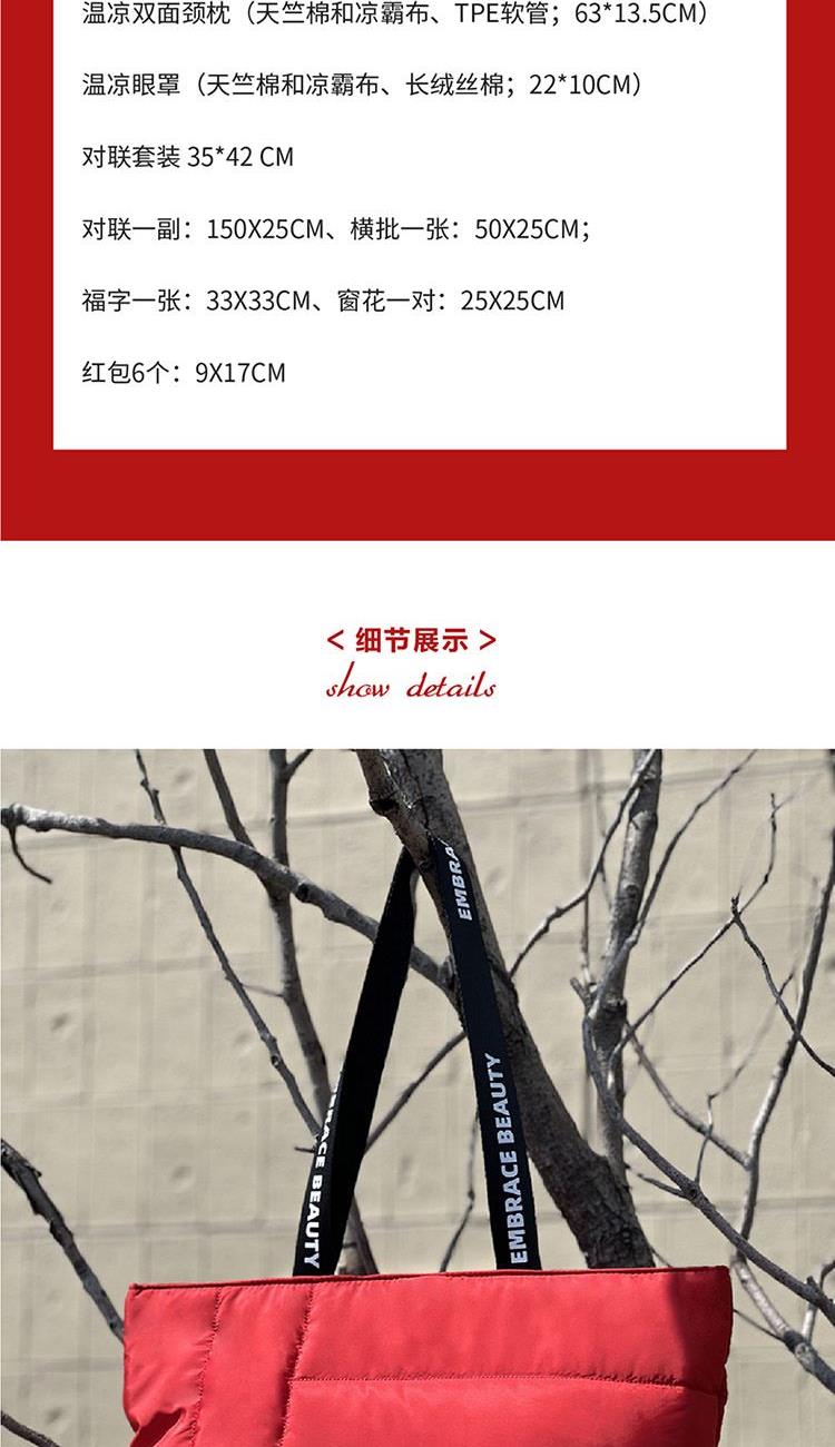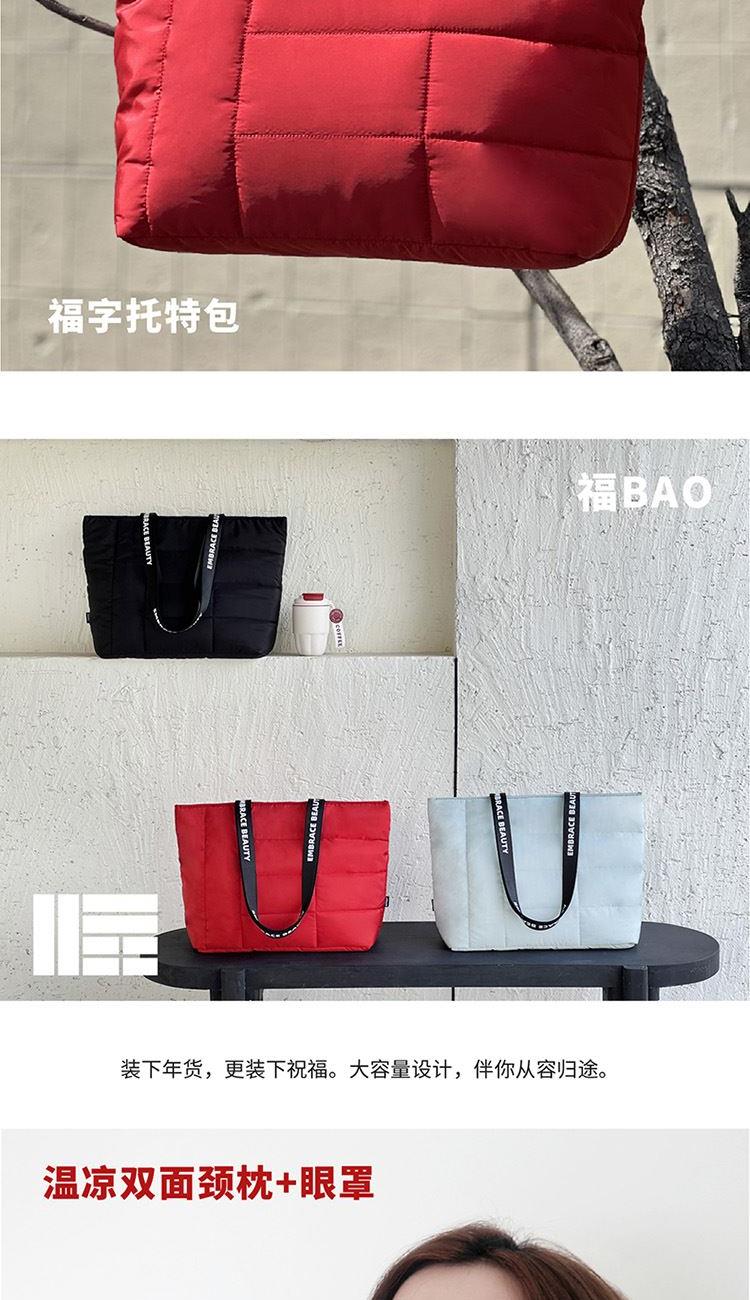 “福”字,作为中国传统文化具代表性的吉祥符号之一,承载着人们对美好生活的向往与期盼。福包以“福”字为核心图案,通过几何抽象的方式重新诠释,既保留了传统福字的精髓,又赋予了其现代时尚的美感。 福字托特包: 装下年货,更装下祝福。大容量设计,伴你从容归途。 颈枕眼罩: 隔绝喧嚣,拥抱酣眠。柔软支撑,让每一程都是安心休憩。 对联福字红包: 传统年味,即刻鲜活。无论身在何方,仪式感从不缺席。