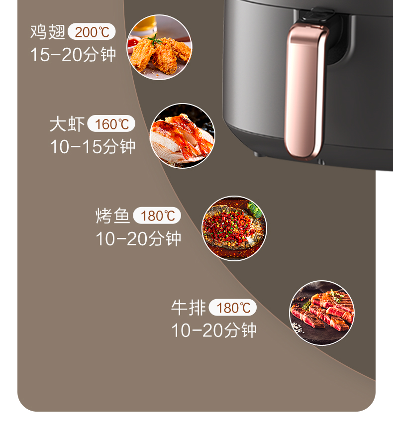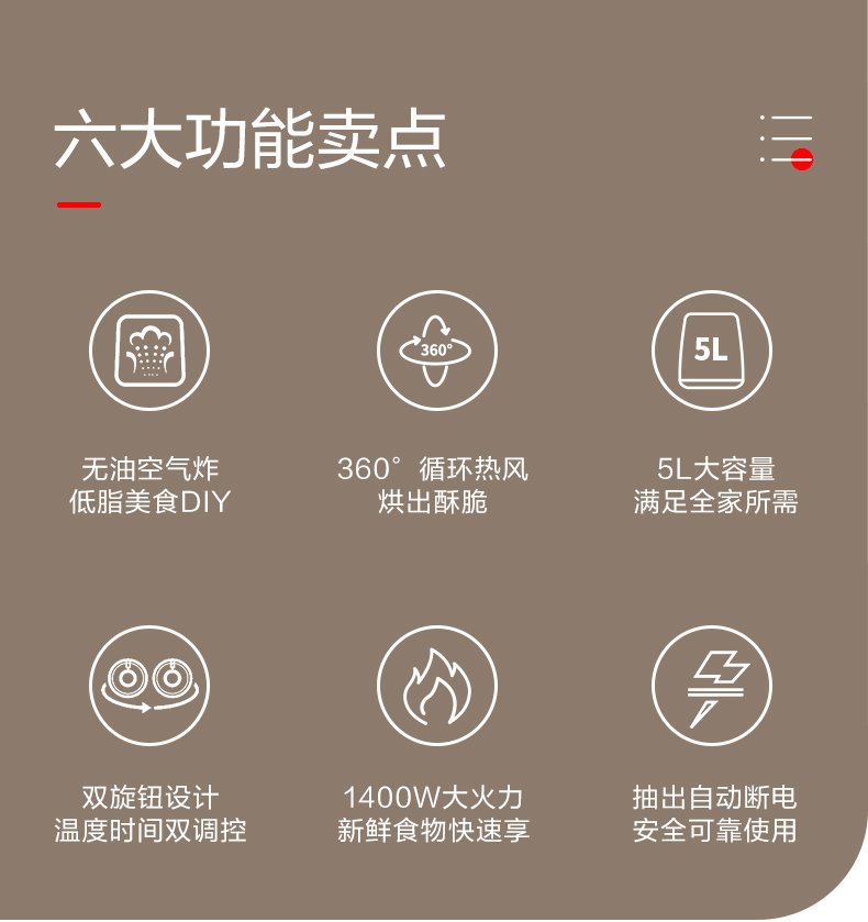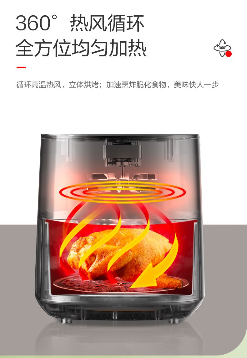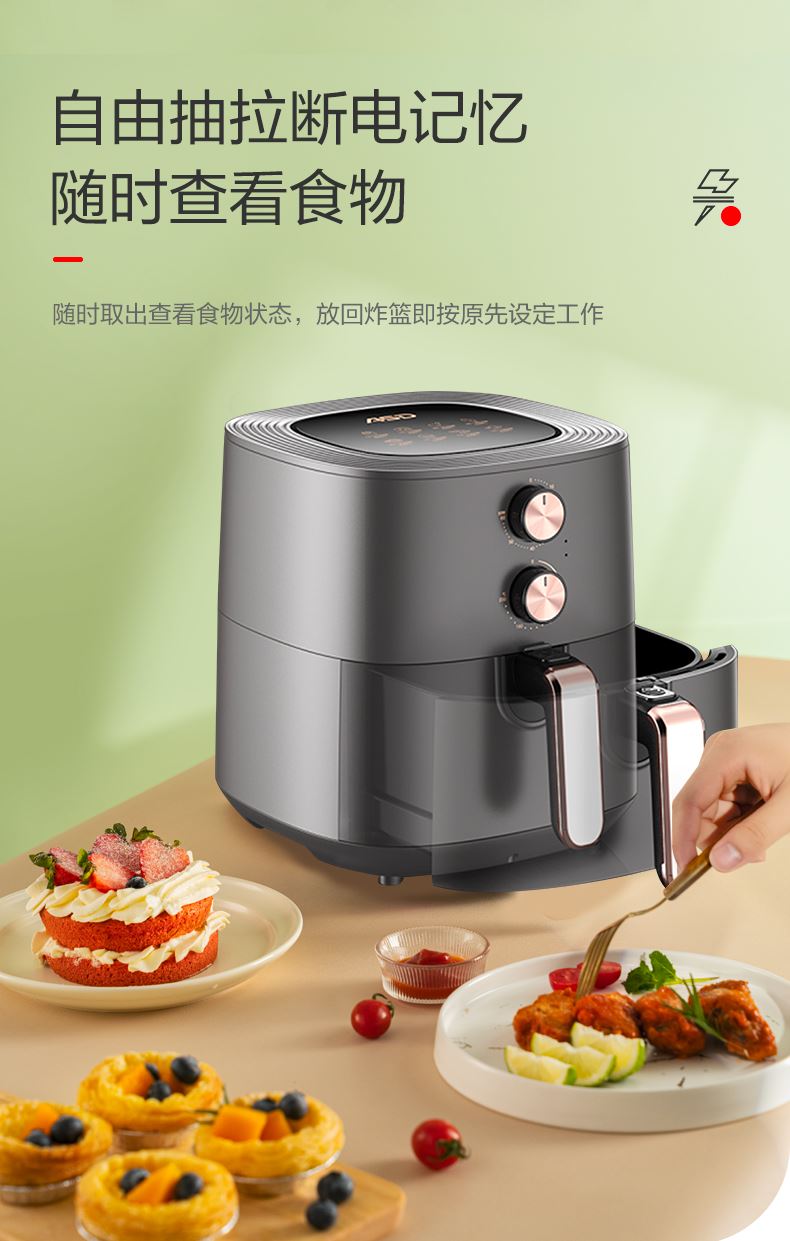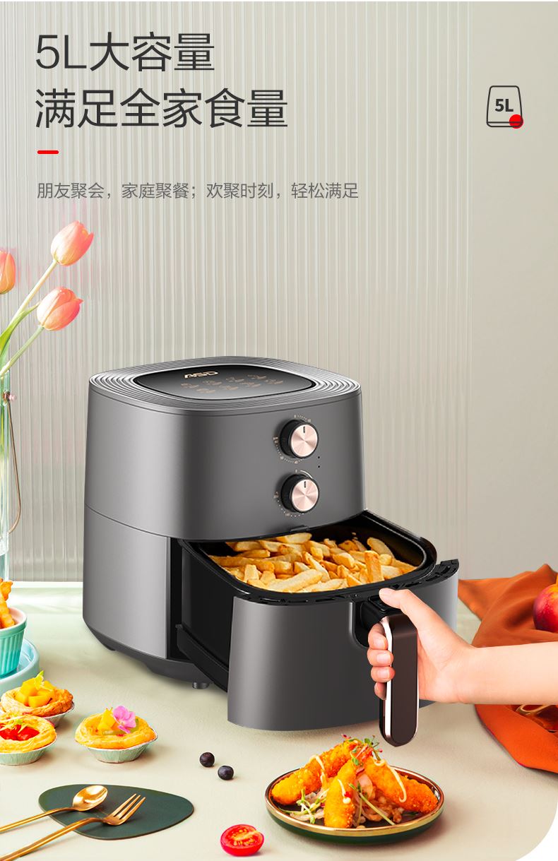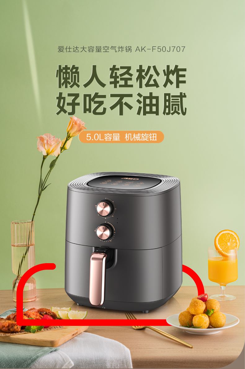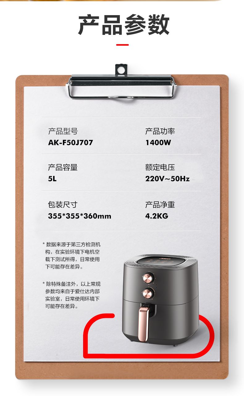 产品型号:AK-F50J707 产品功率:1400W 产品容量: 5L 包装尺寸355*355*360mm 额定电压220V~50Hz 产品净重:4.2KG 1、无油空气炸低脂美食DIY,360°循环热风。 2、烘出酥脆,5L大容量,满足全家所需。 3、双旋钮设计,温度时间双调控。 4、1400W大火力新鲜食物快速享。 5、抽出自动断电安全可靠使用。