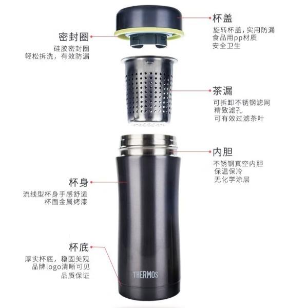 颜 色:GL金色 CGY灰色 PL紫色 BK黑色 容 量:380ml 保温效力:63C以上(6小时) 保冷效力:10C以下(6小时) 外管材质:304不锈钢 内管材质:304不锈钢 密封圈:食品级硅胶 茶漏材质:304不锈钢