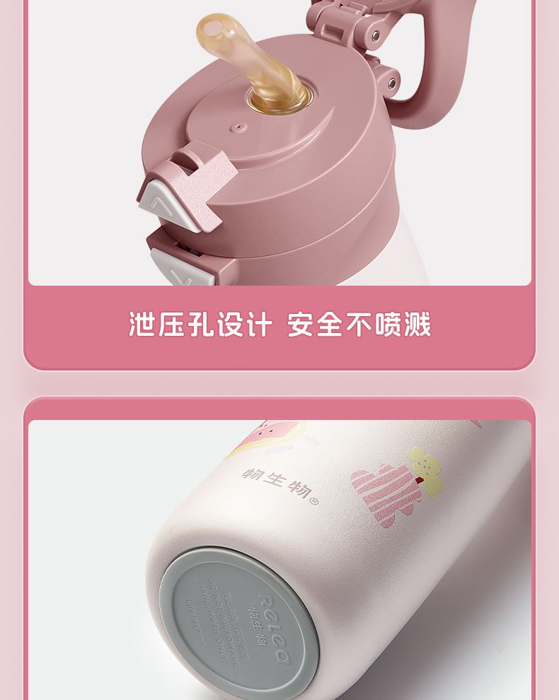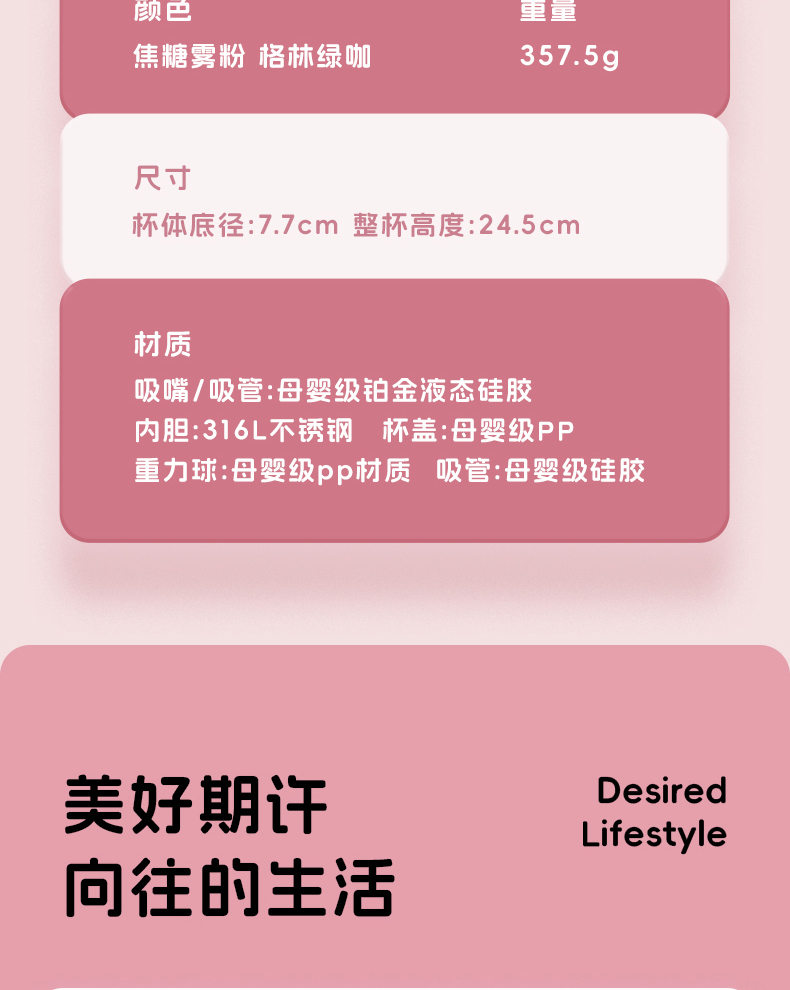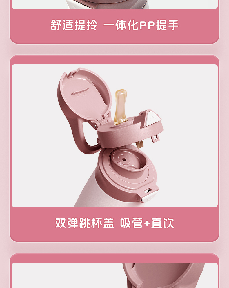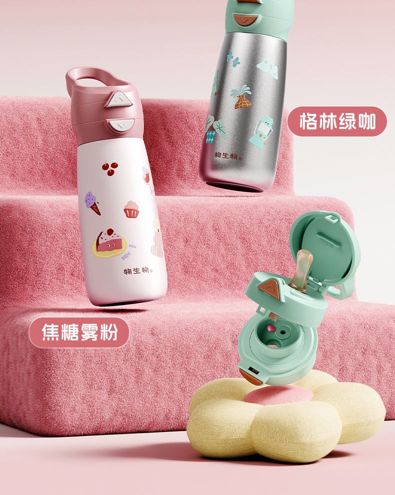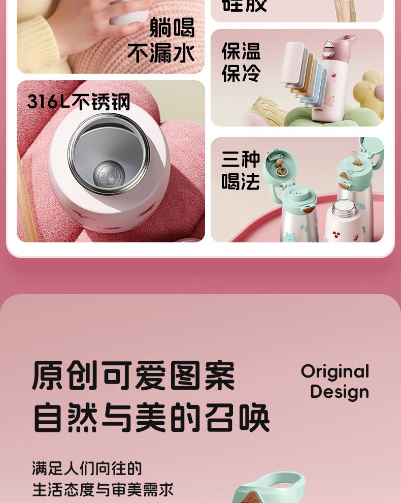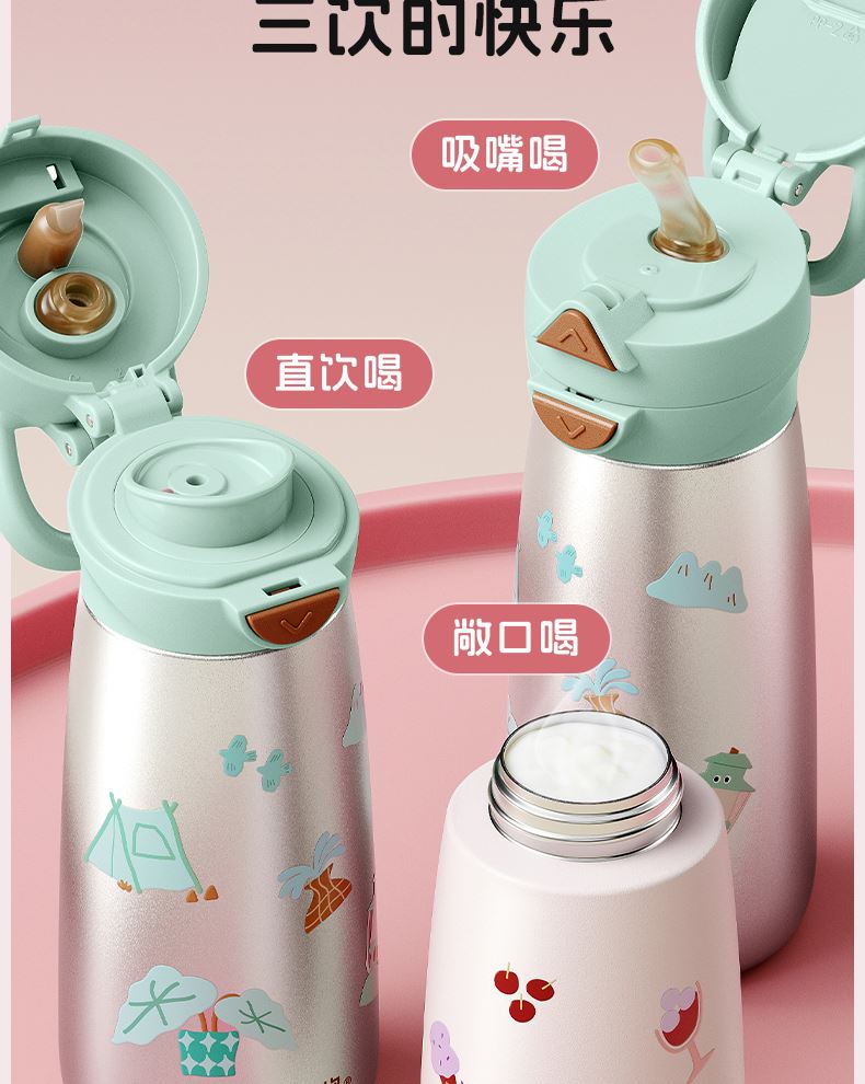 型号:JV012529-0500 颜色:焦糖雾粉 格林绿咖 材质:316不锈钢 容量:500ml 1:躺喝不漏水,三种喝法 2:316L不锈钢内胆易清洗,耐酸碱,无异味 3:母婴级硅胶吸嘴耐啃咬不易呛喝水更轻松