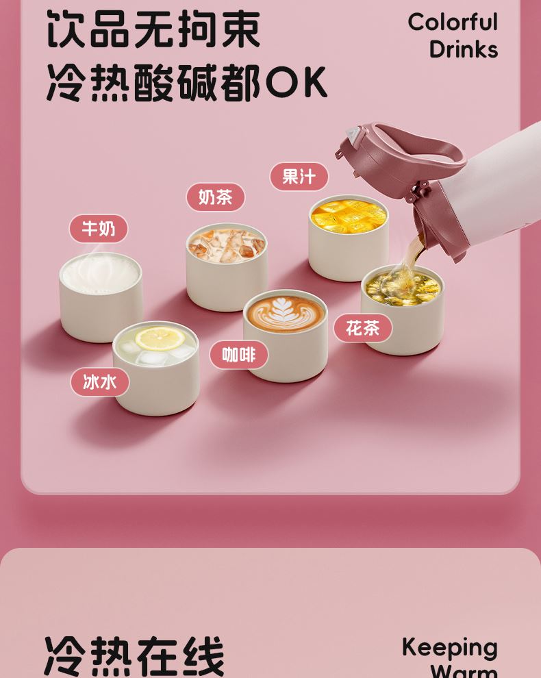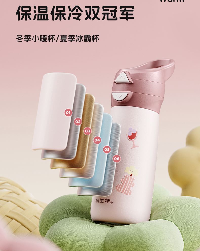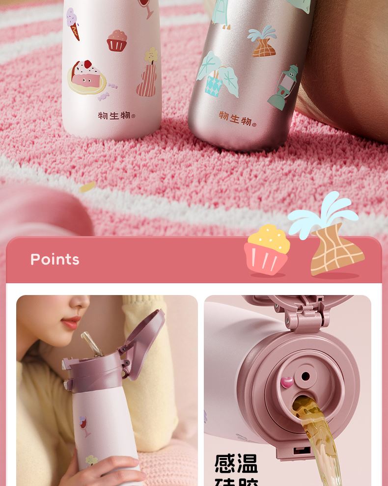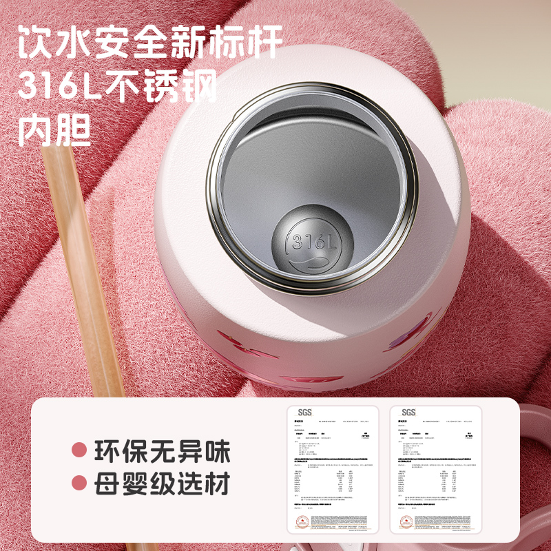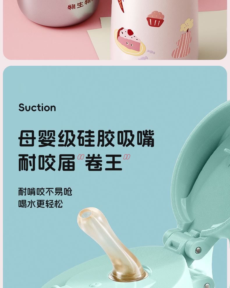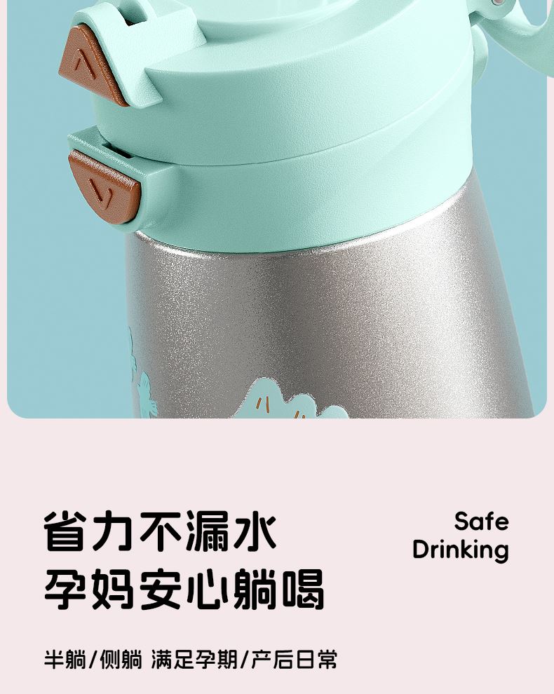 型号:JV012529-0500 颜色:焦糖雾粉 格林绿咖 材质:316不锈钢 容量:500ml 1:躺喝不漏水,三种喝法 2:316L不锈钢内胆易清洗,耐酸碱,无异味 3:母婴级硅胶吸嘴耐啃咬不易呛喝水更轻松
