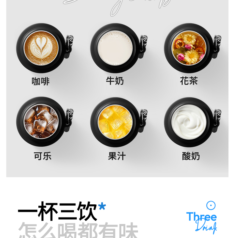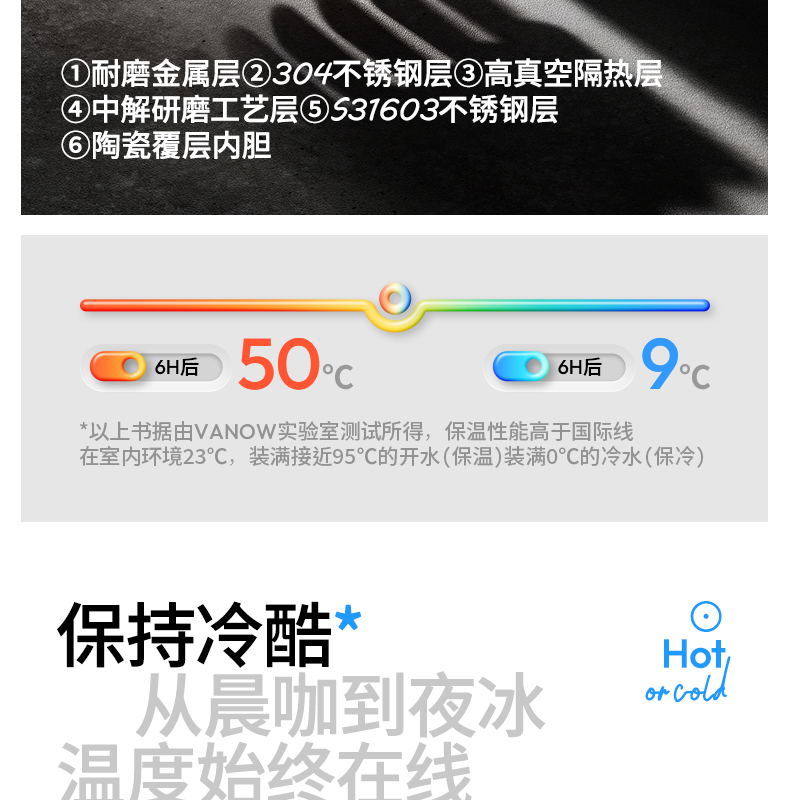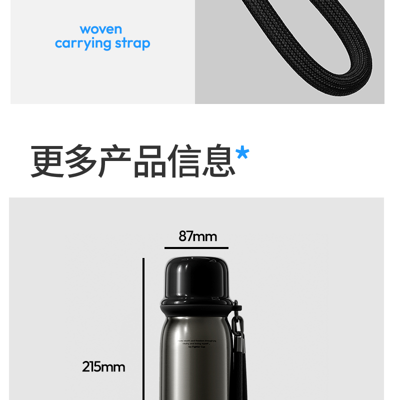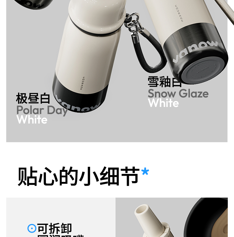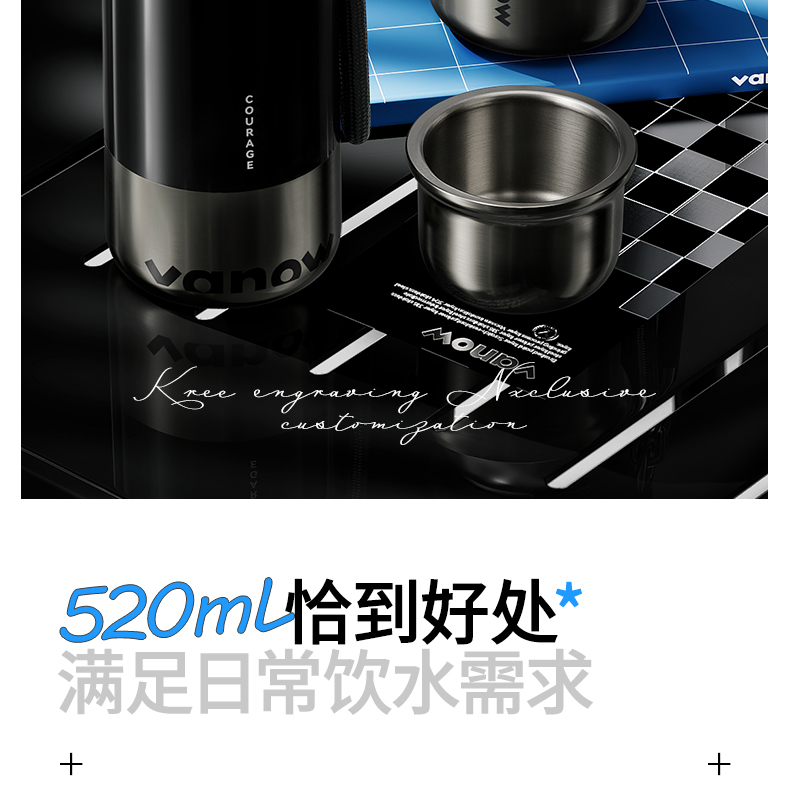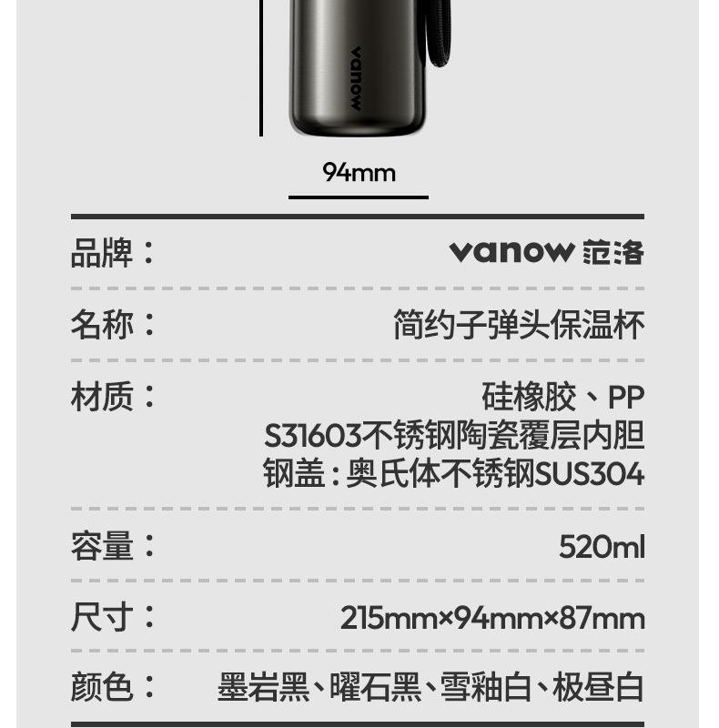 型号:VO-JY52ZD 颜色:曜石黑, 雪釉白, 墨岩黑, 极昼白 容量:520ml 尺寸:215*94*87mm 材质:316L不锈钢内胆/pp材质/硅橡胶