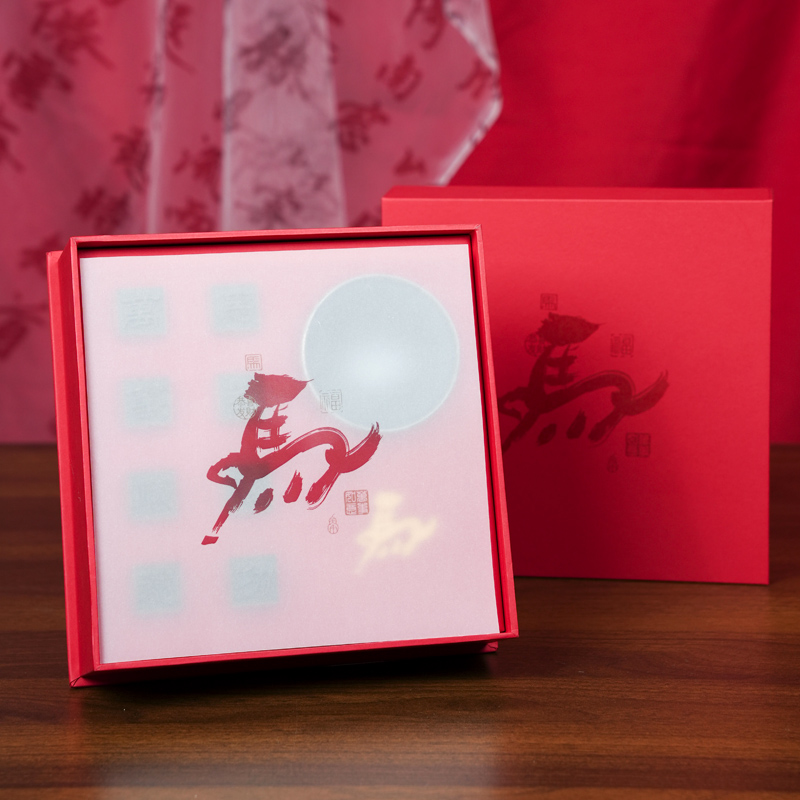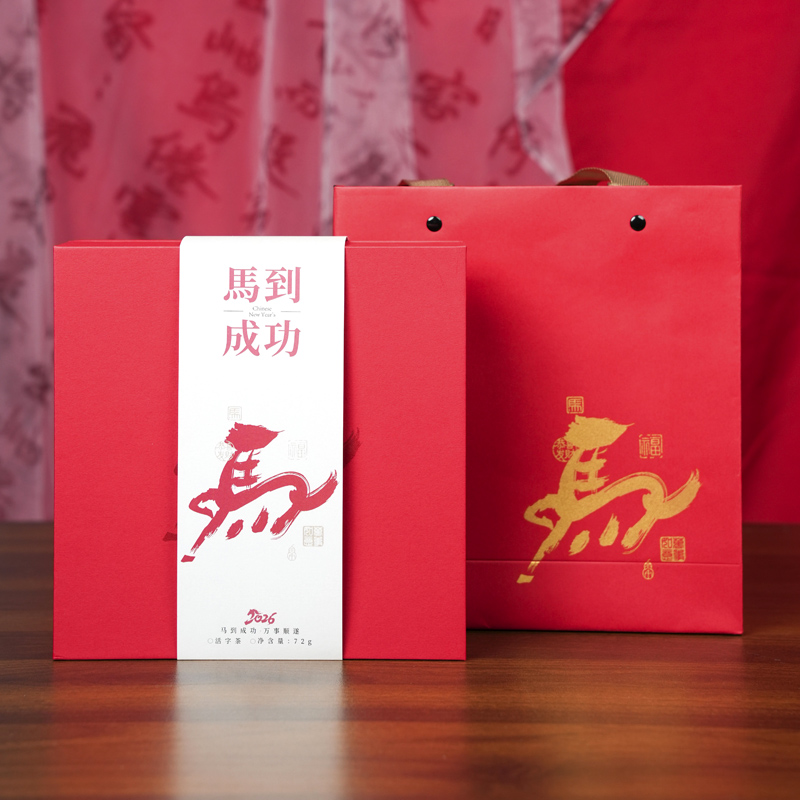 马到成功(活字茶) 产品配置:活字茶8颗 建盏茶杯1个 茶叶品种:活字紧压茶 礼盒尺寸:200*200*60mm 整个礼盒的设计以红色为主色调,将成语“马到成功”中的“馬”字,进行创意变形,使其形态如同一匹正在奔跑的骏马。整体设计融合中国书法的笔触与现代设计的简洁线条,传达出速度、力量与成功的信念。