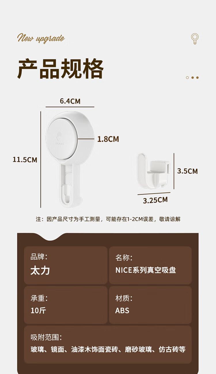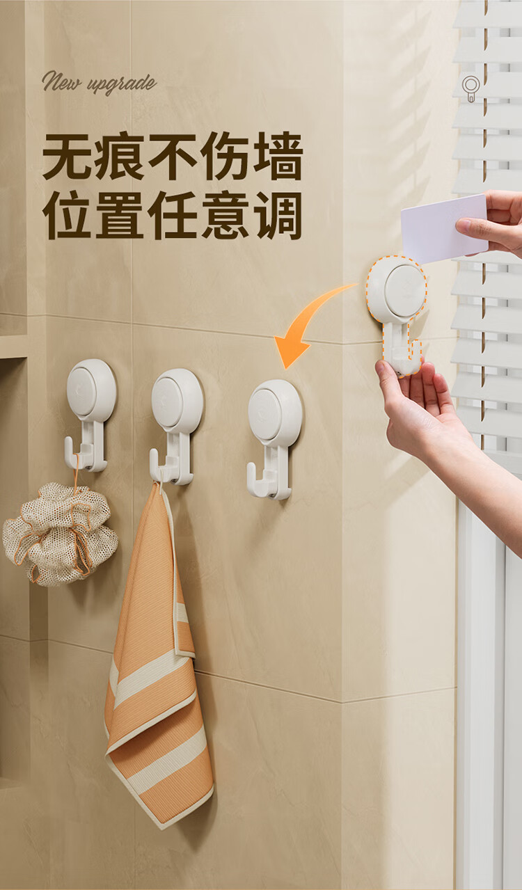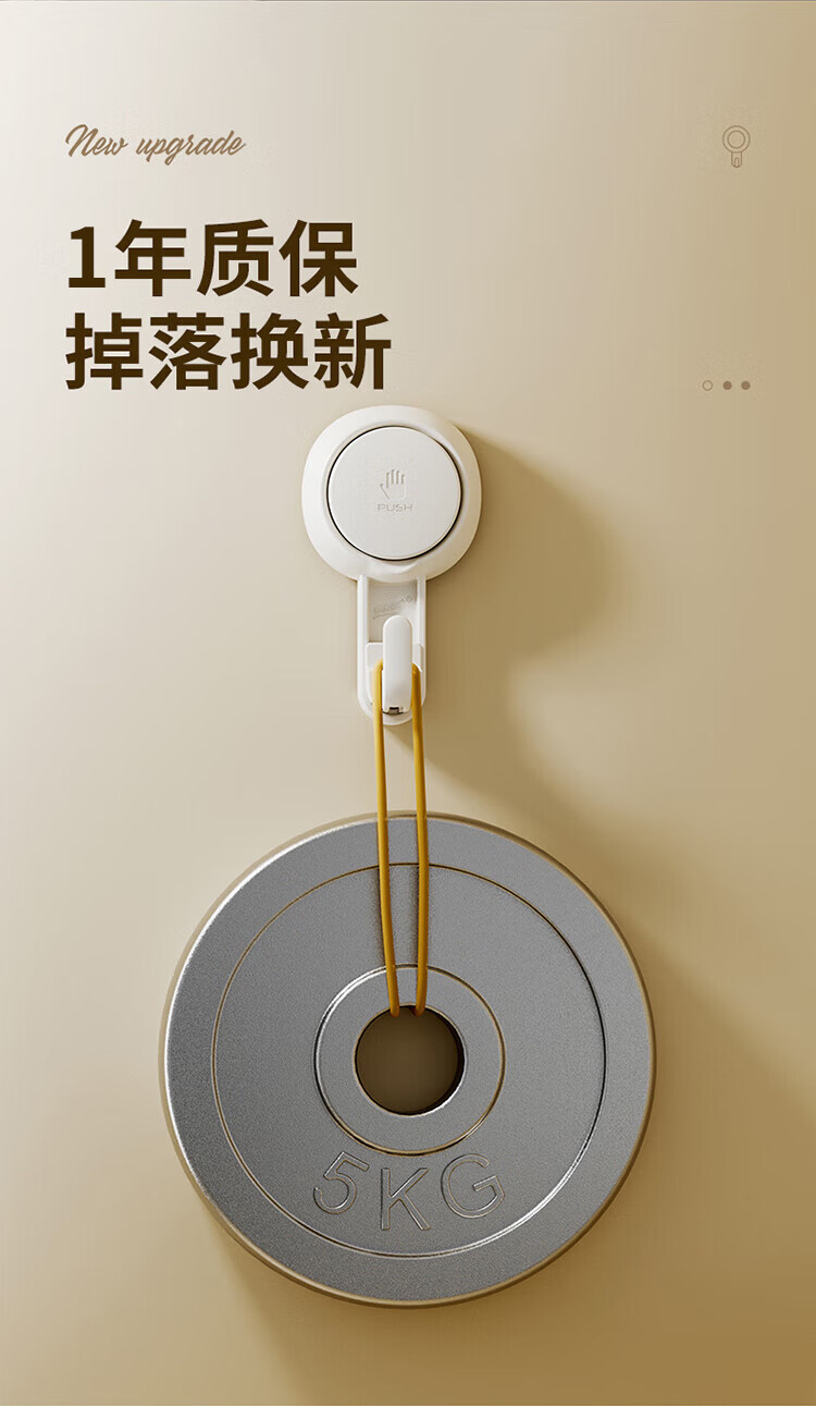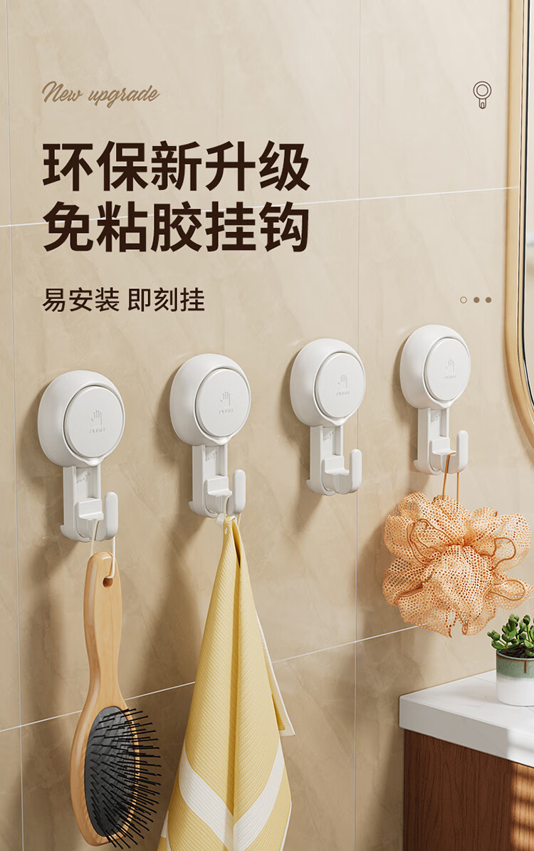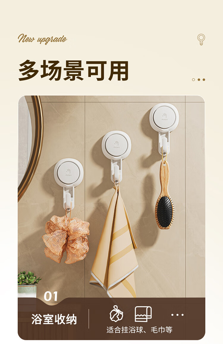 产品尺寸:11.5*6.4*4.2cm(4个) 承重:5KG 材质:真空吸盘TPE 适用墙面:光滑瓷砖,光滑玻璃,人工大理石,亚克力板 类别:挂钩 适用场景:卧室,厨房,浴室 图案:纯色 功能:易操作,防水,真空吸附, 产品描述:环保新升级,免粘胶,循环用,真空吸附可移动,浴室使用防水,安装简单。