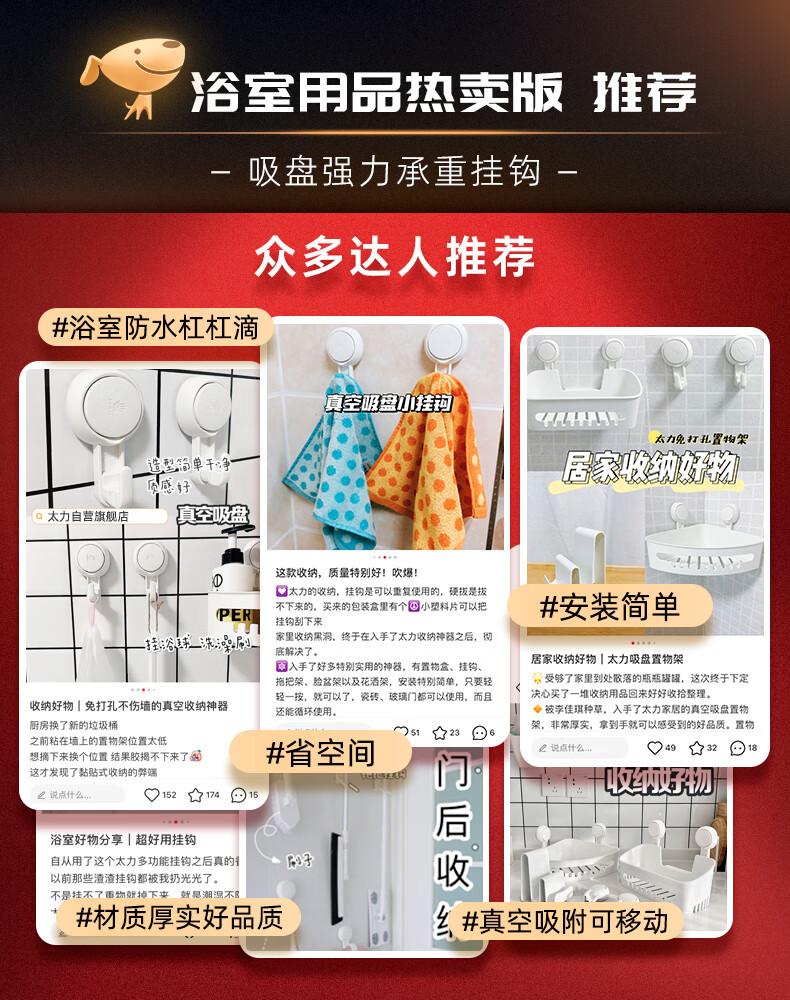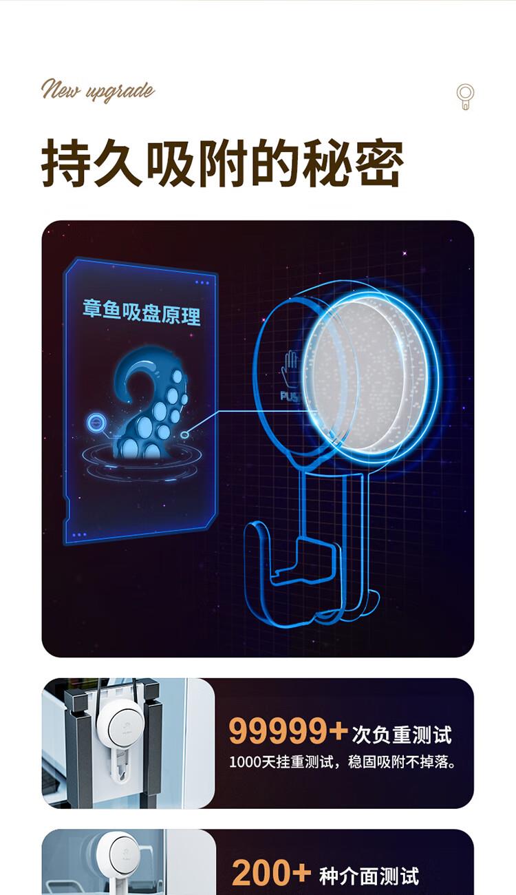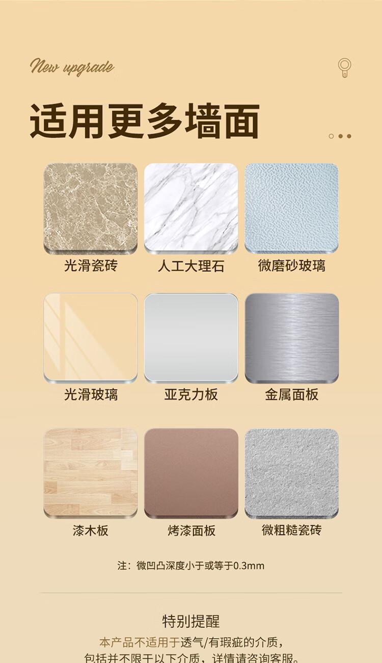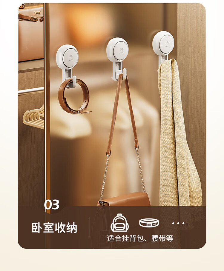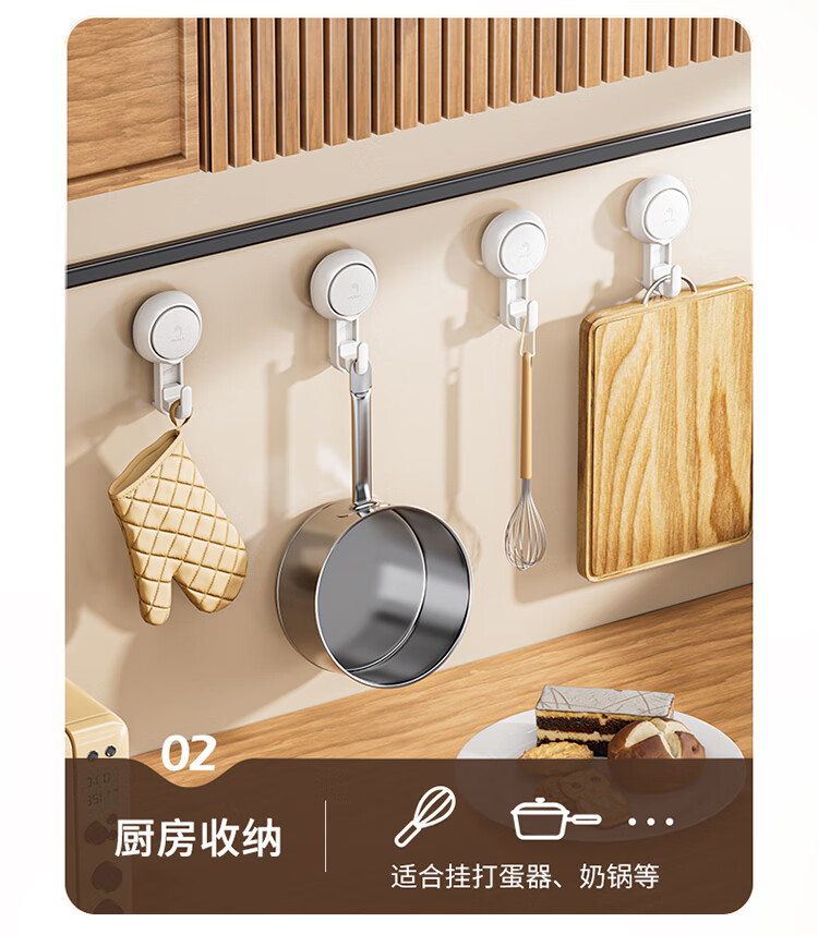 产品尺寸:11.5*6.4*4.2cm(4个) 承重:5KG 材质:真空吸盘TPE 适用墙面:光滑瓷砖,光滑玻璃,人工大理石,亚克力板 类别:挂钩 适用场景:卧室,厨房,浴室 图案:纯色 功能:易操作,防水,真空吸附, 产品描述:环保新升级,免粘胶,循环用,真空吸附可移动,浴室使用防水,安装简单。