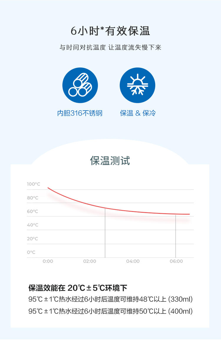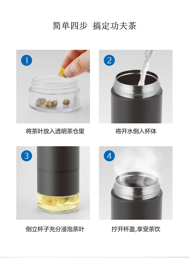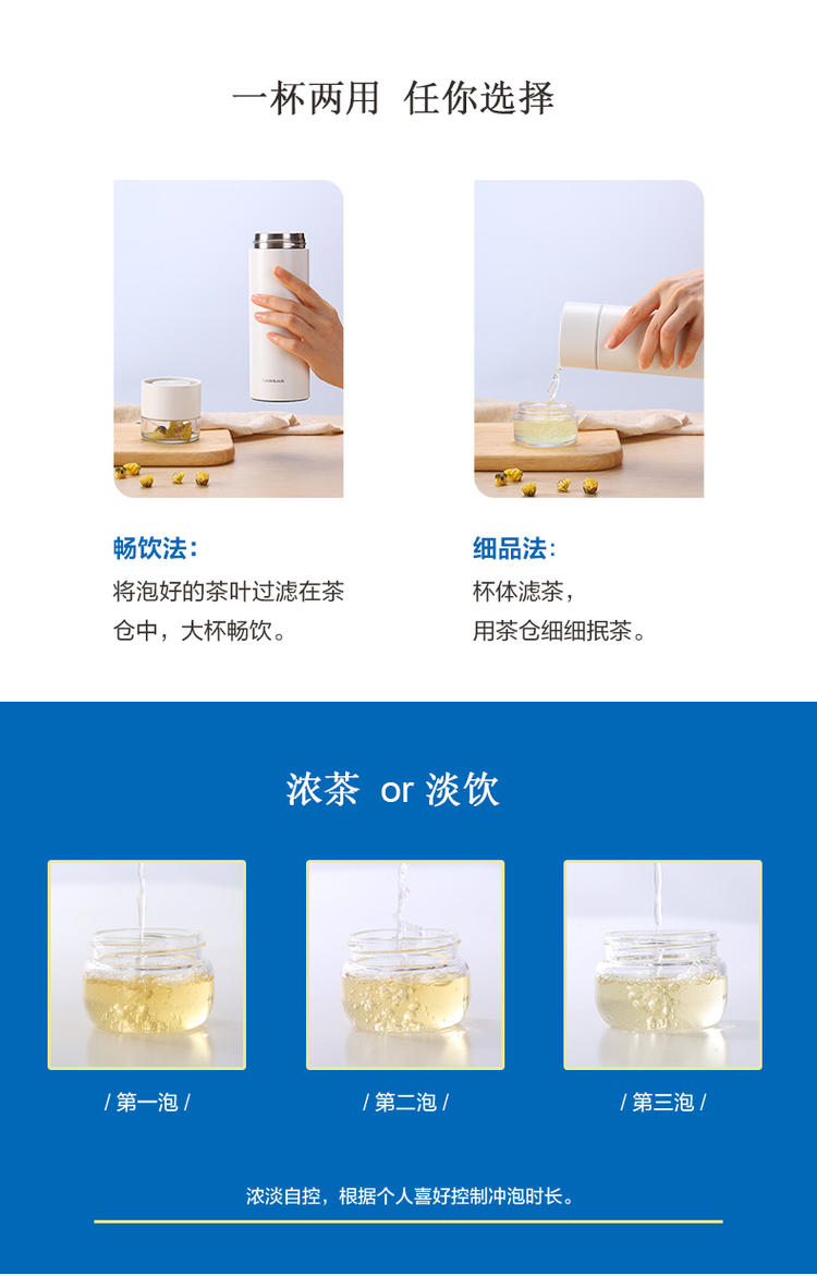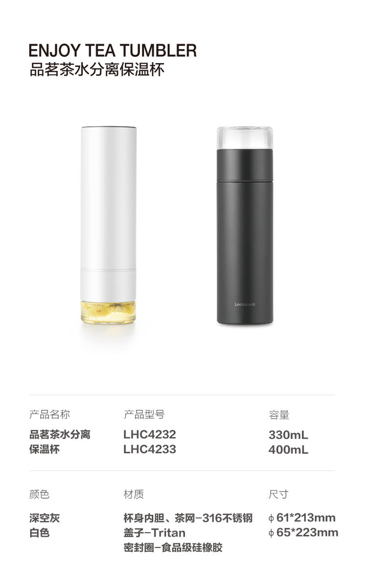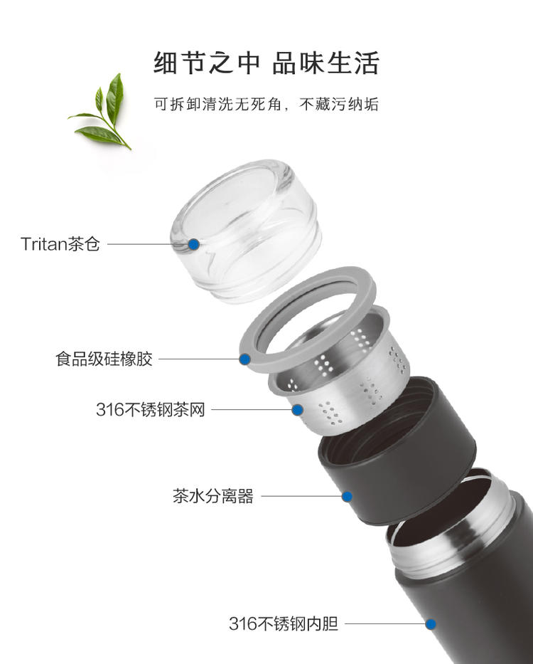 材质:316不锈钢 容量:400ml 产品颜色:白 独立茶仓,用时分离,告别吐茶烦恼 杯盖采用Tritan材质,不含双酚A使用更安全 该材料广泛应用于婴儿奶瓶的材质 316不锈钢内胆,材质稳定,不易生锈,饮水更安全