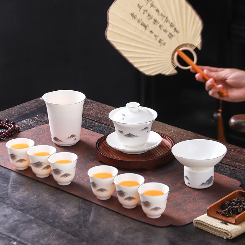 云博陶瓷羊脂玉山水墨远山见山皮盒套装中国风茶具商务礼品伴手礼