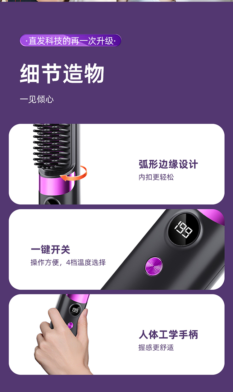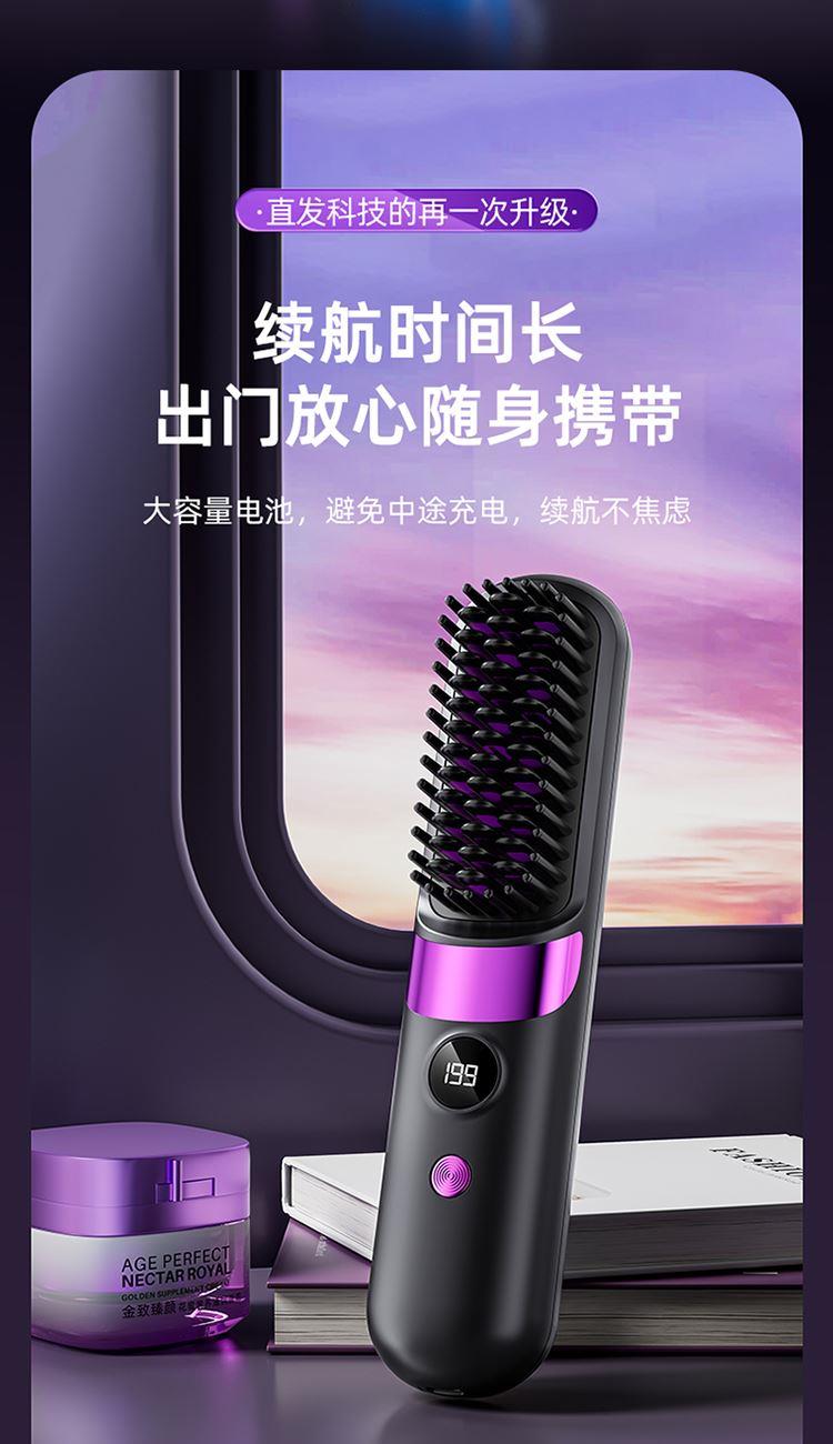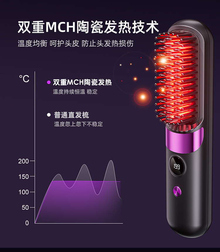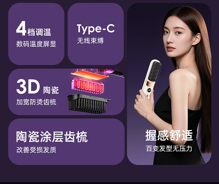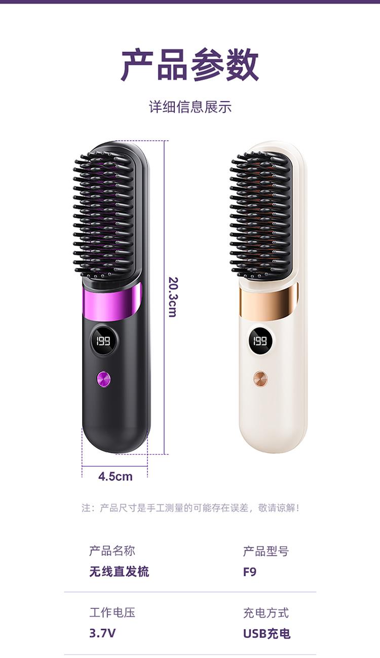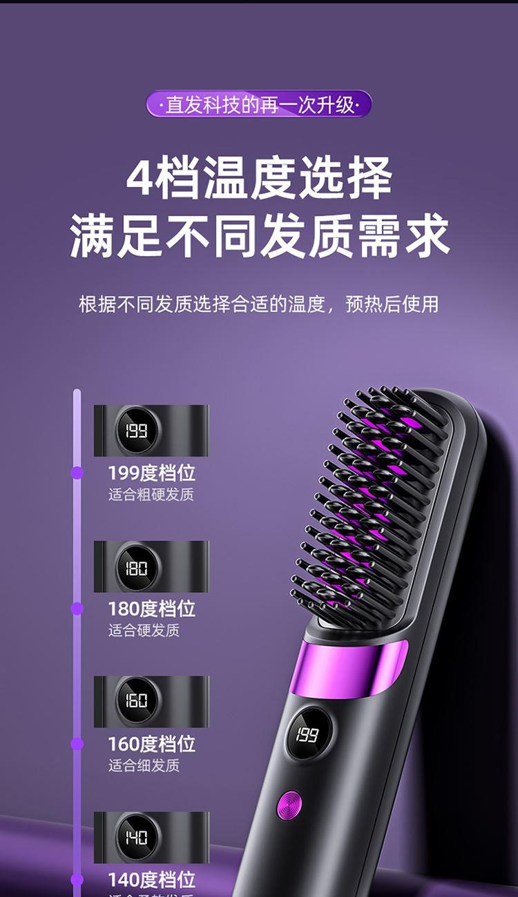 额定电压:3.7V 额定功率:35W 温度范围:35W 产品温度: 140℃-199℃ 重 量:0.28kg 颜 色:黑紫色 米白色 包装尺寸:490*445*365mm 包装清单:直发梳、说明书、充电线 主要材质:ABC+PA 1.4档调温数码温度屏显 2.3D陶瓷加宽防烫齿梳 3.陶瓷涂层齿梳改善受损发质 4.无线无束缚