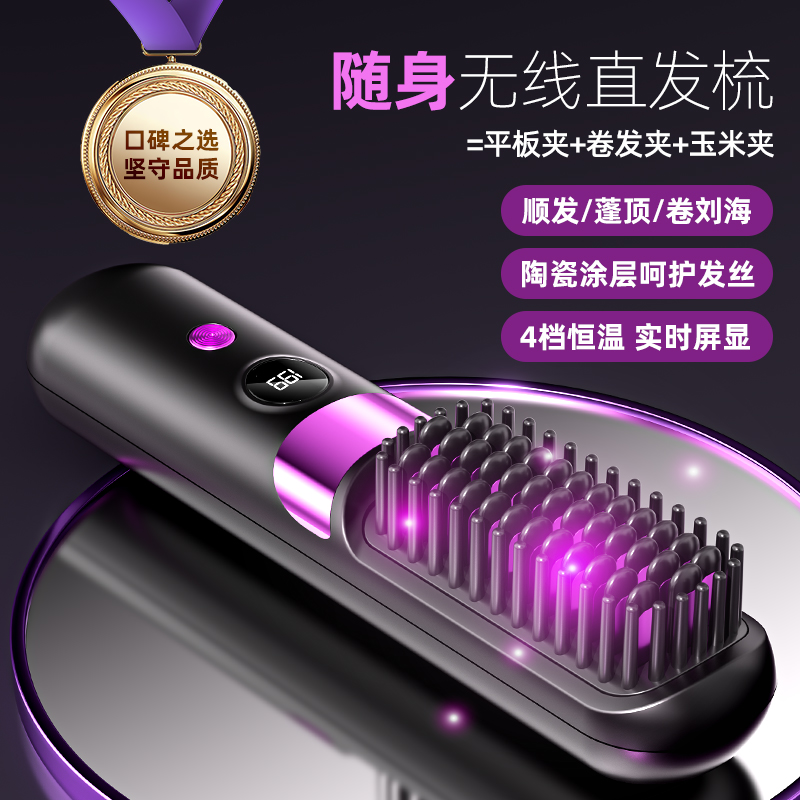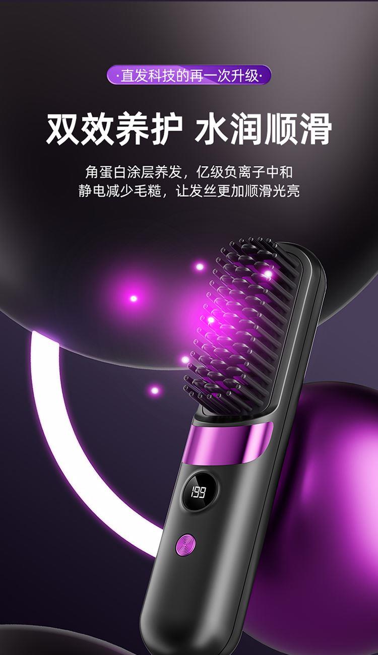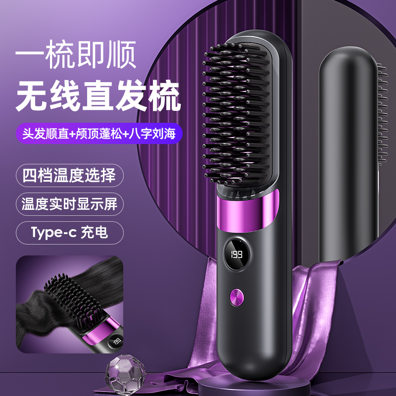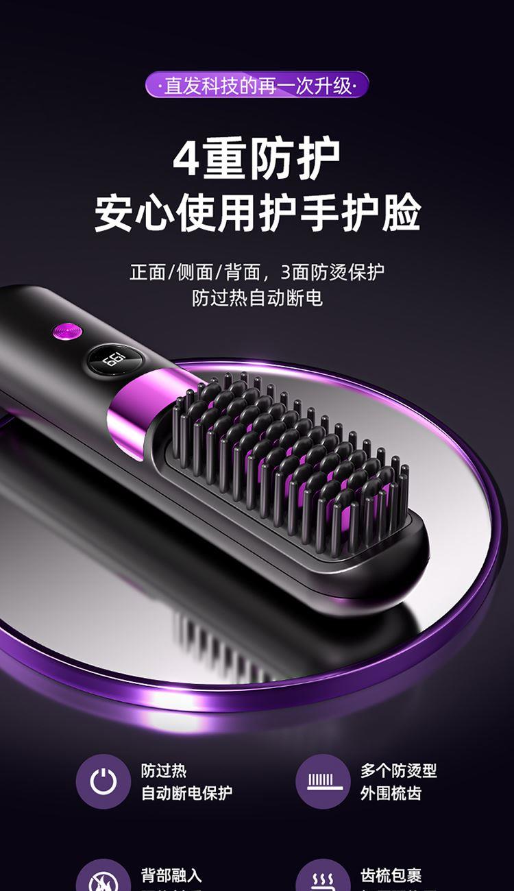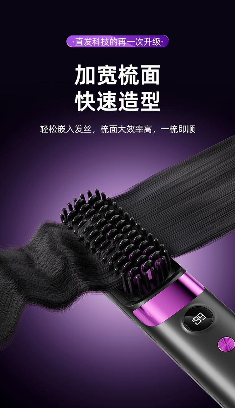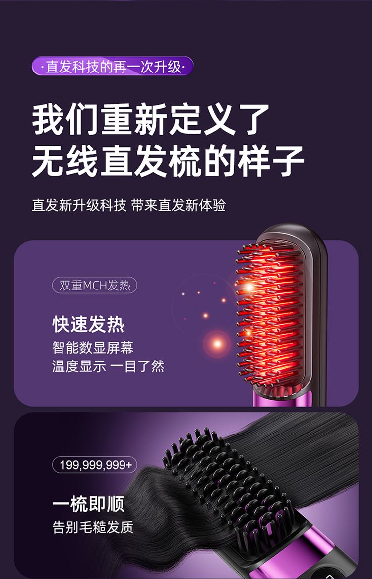 额定电压:3.7V 额定功率:35W 温度范围:35W 产品温度: 140℃-199℃ 重 量:0.28kg 颜 色:黑紫色 米白色 包装尺寸:490*445*365mm 包装清单:直发梳、说明书、充电线 主要材质:ABC+PA 1.4档调温数码温度屏显 2.3D陶瓷加宽防烫齿梳 3.陶瓷涂层齿梳改善受损发质 4.无线无束缚