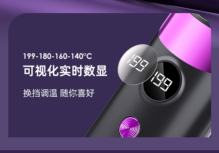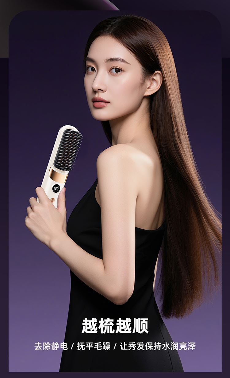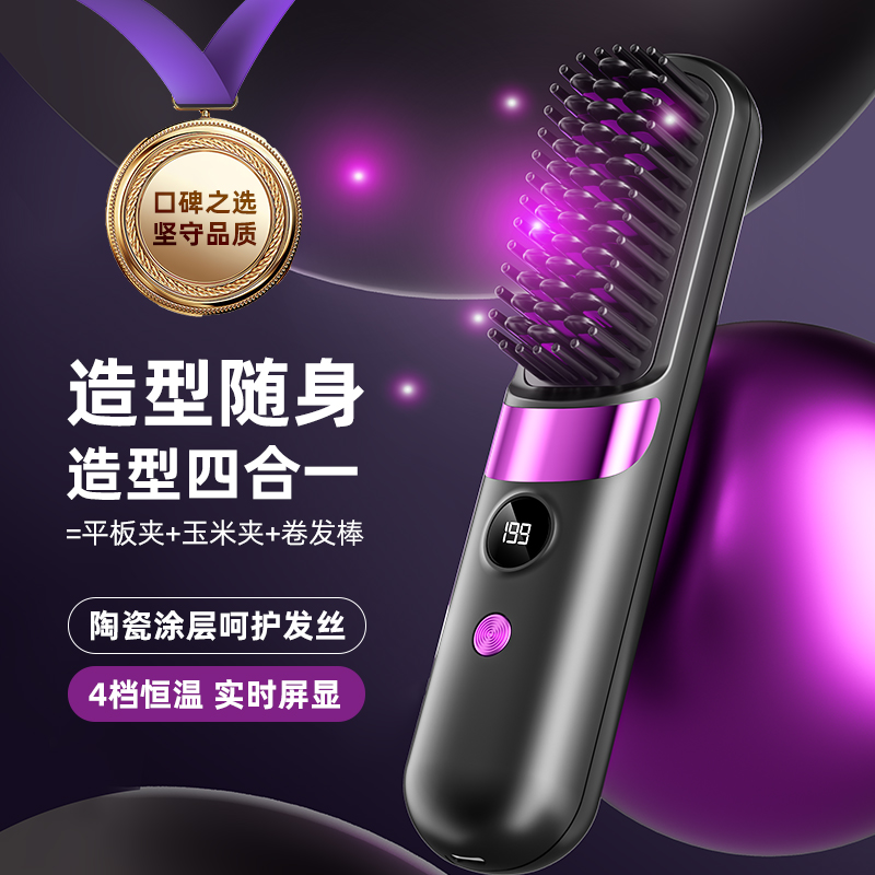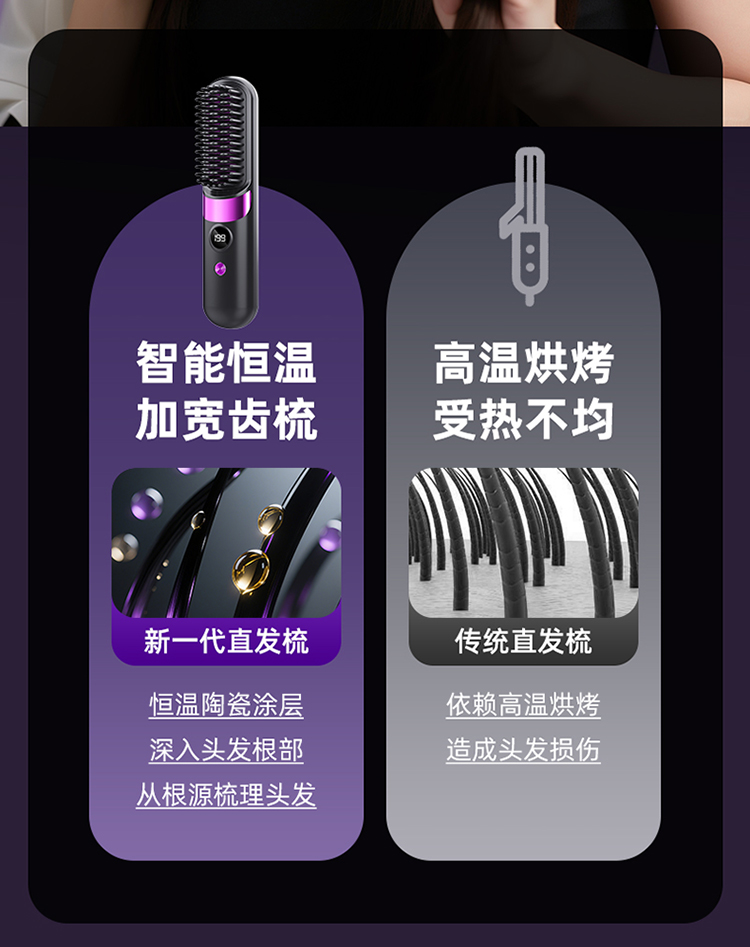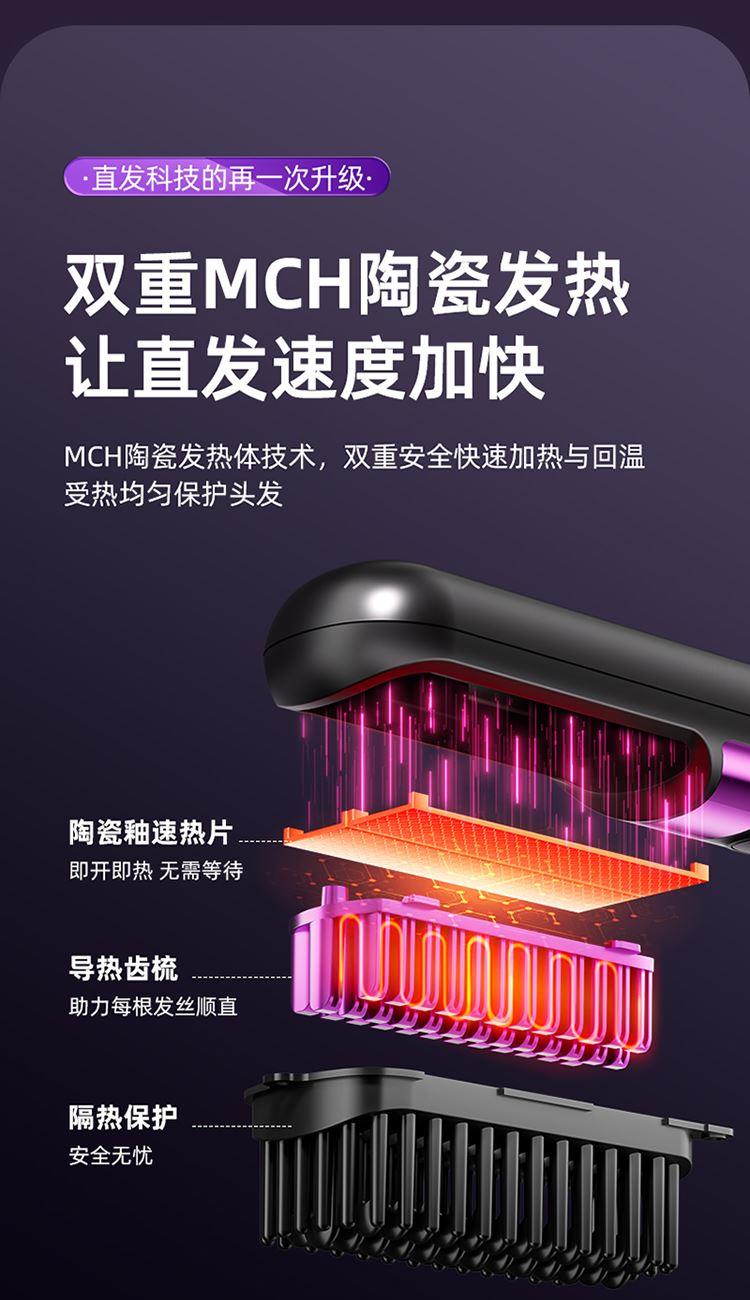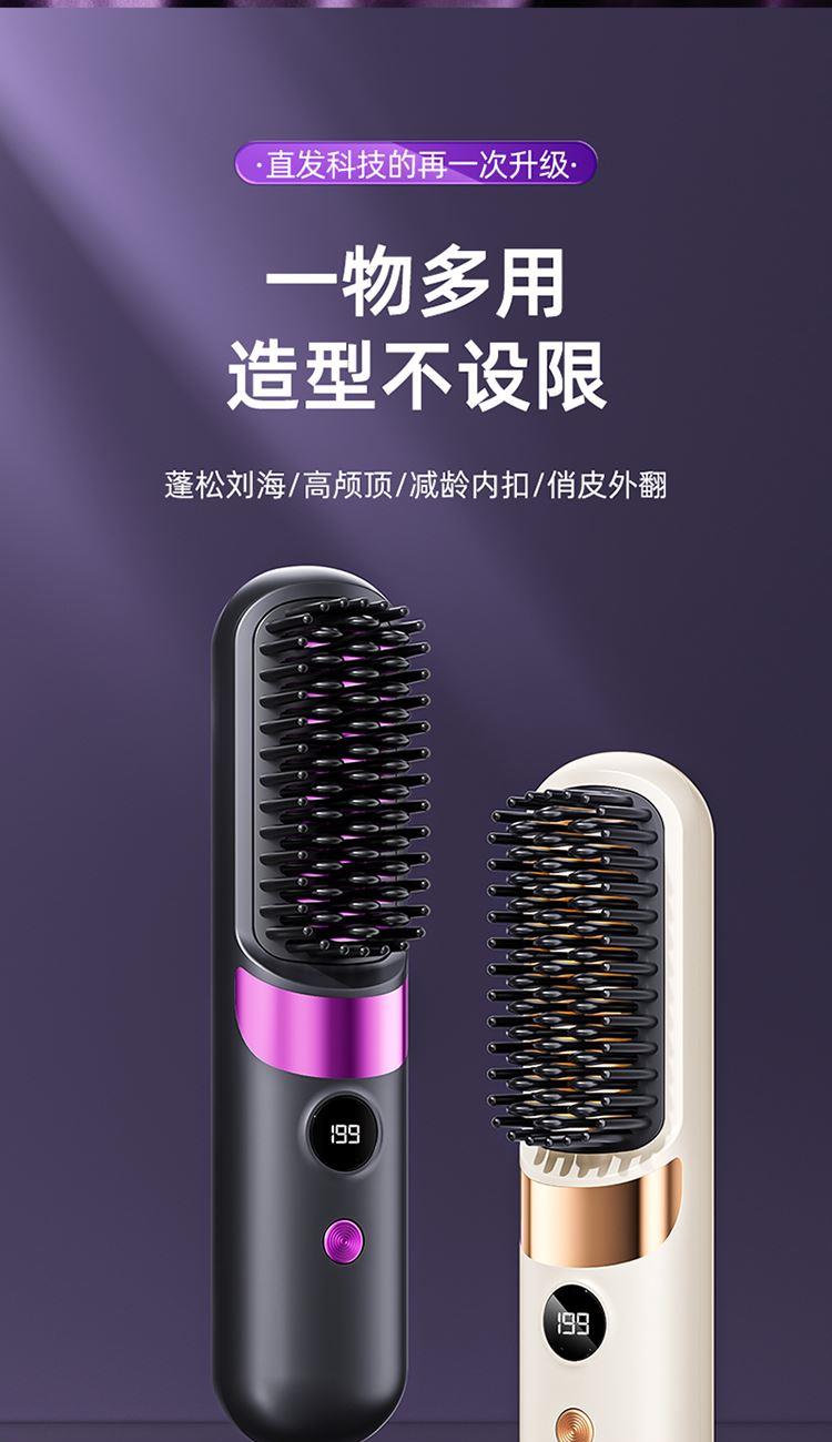 额定电压:3.7V 额定功率:35W 温度范围:35W 产品温度: 140℃-199℃ 重 量:0.28kg 颜 色:黑紫色 米白色 包装尺寸:490*445*365mm 包装清单:直发梳、说明书、充电线 主要材质:ABC+PA 1.4档调温数码温度屏显 2.3D陶瓷加宽防烫齿梳 3.陶瓷涂层齿梳改善受损发质 4.无线无束缚