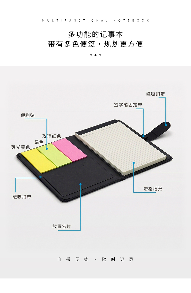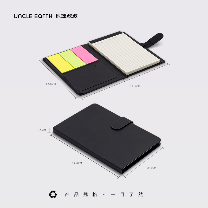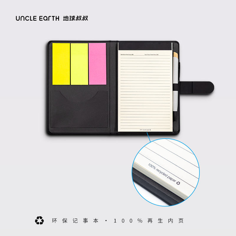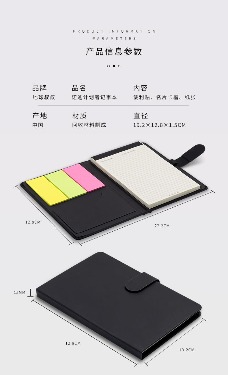 · 采用回收塑料瓶RPET材料制作,绿色环保拥抱未来 · 彩色便利贴,每种颜色各25张,随用随取 · 小身材大容量,自带名片夹 · 75克米色纸张,80张纸,FSC认证纸张,再生内页 · 自带笔插位,出差旅行会议记录,便利又实用 · 磁吸搭扣,内外兼具,简约大气 产品尺寸: 19.2 x 12.8 x 1.5CM ( 7.5 x 5 x 0.6 英寸 ) 含激光logo,标准OPP袋包装