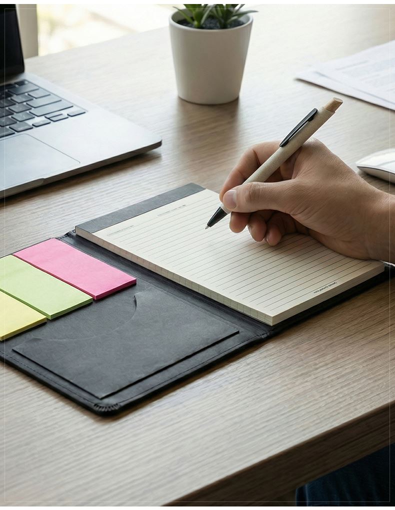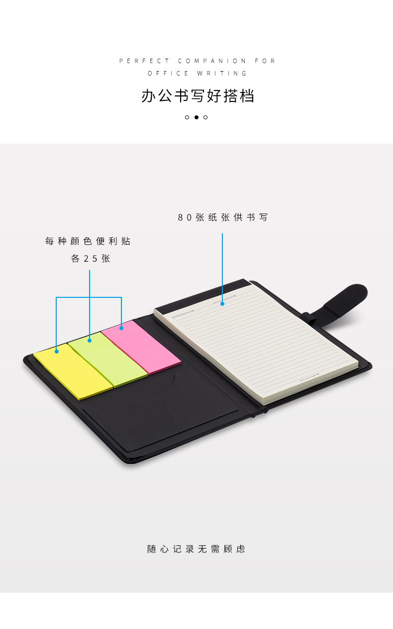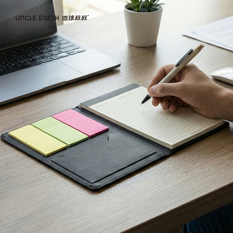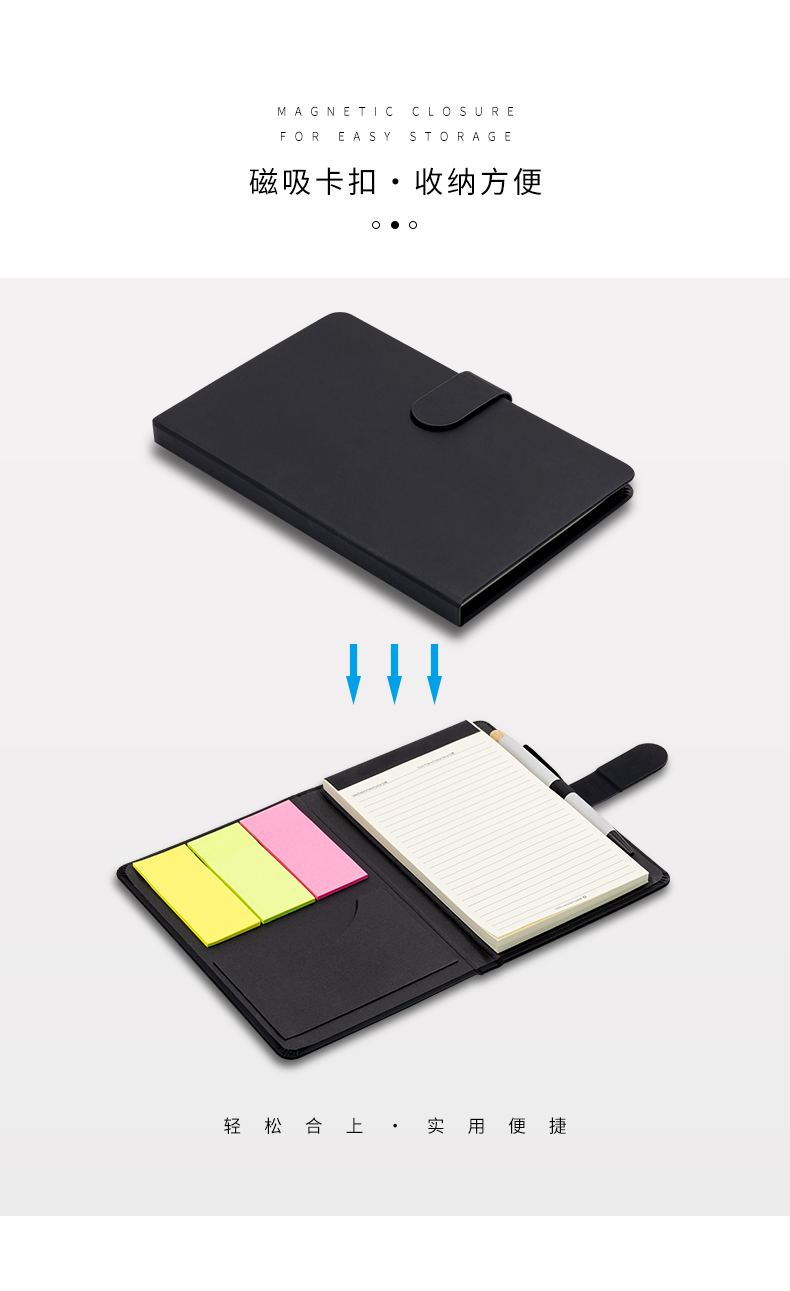 · 采用回收塑料瓶RPET材料制作,绿色环保拥抱未来 · 彩色便利贴,每种颜色各25张,随用随取 · 小身材大容量,自带名片夹 · 75克米色纸张,80张纸,FSC认证纸张,再生内页 · 自带笔插位,出差旅行会议记录,便利又实用 · 磁吸搭扣,内外兼具,简约大气 产品尺寸: 19.2 x 12.8 x 1.5CM ( 7.5 x 5 x 0.6 英寸 ) 含激光logo,标准OPP袋包装