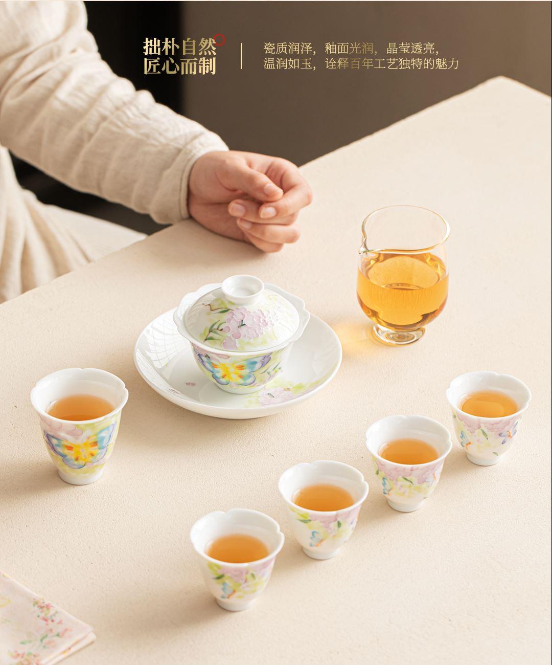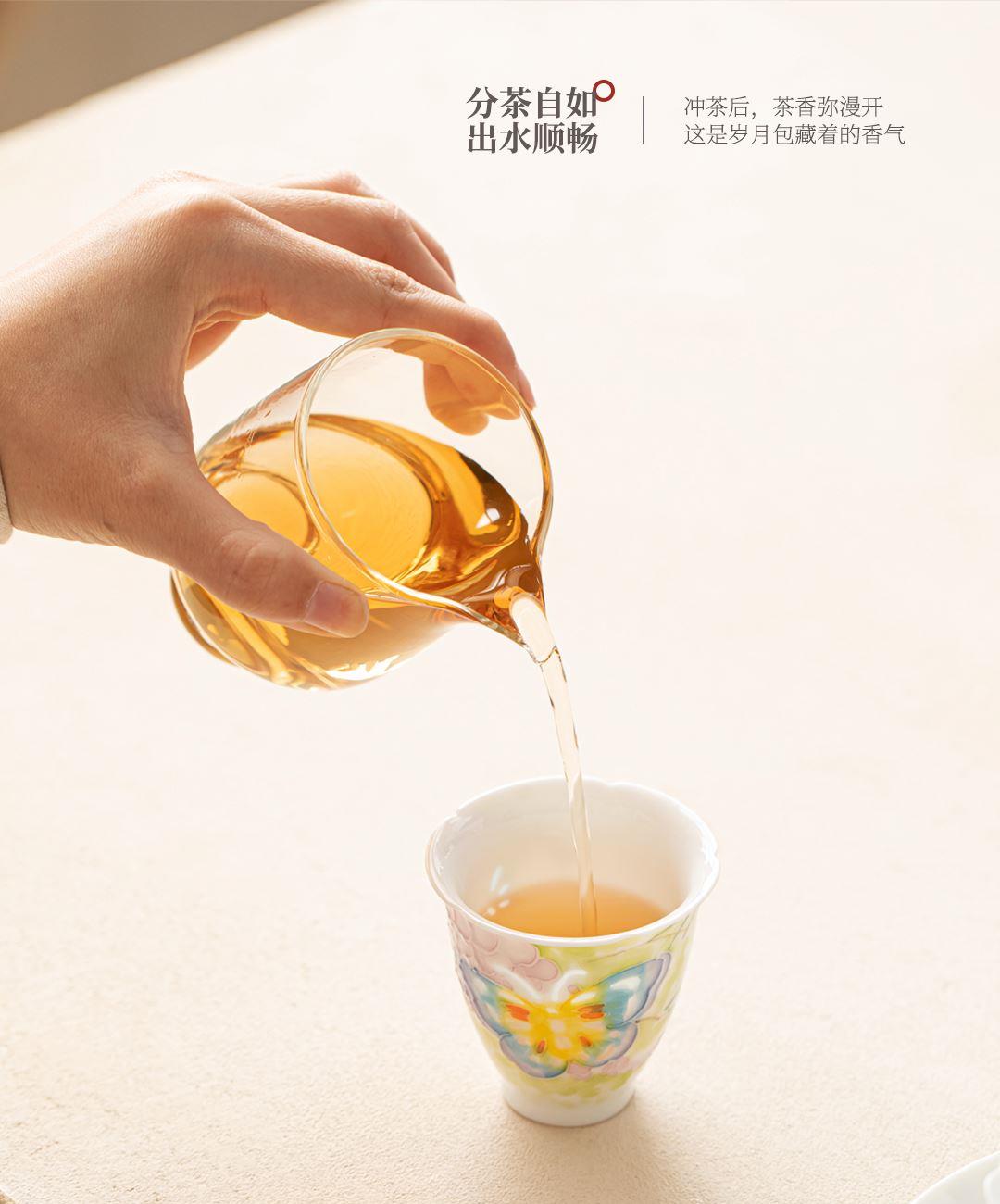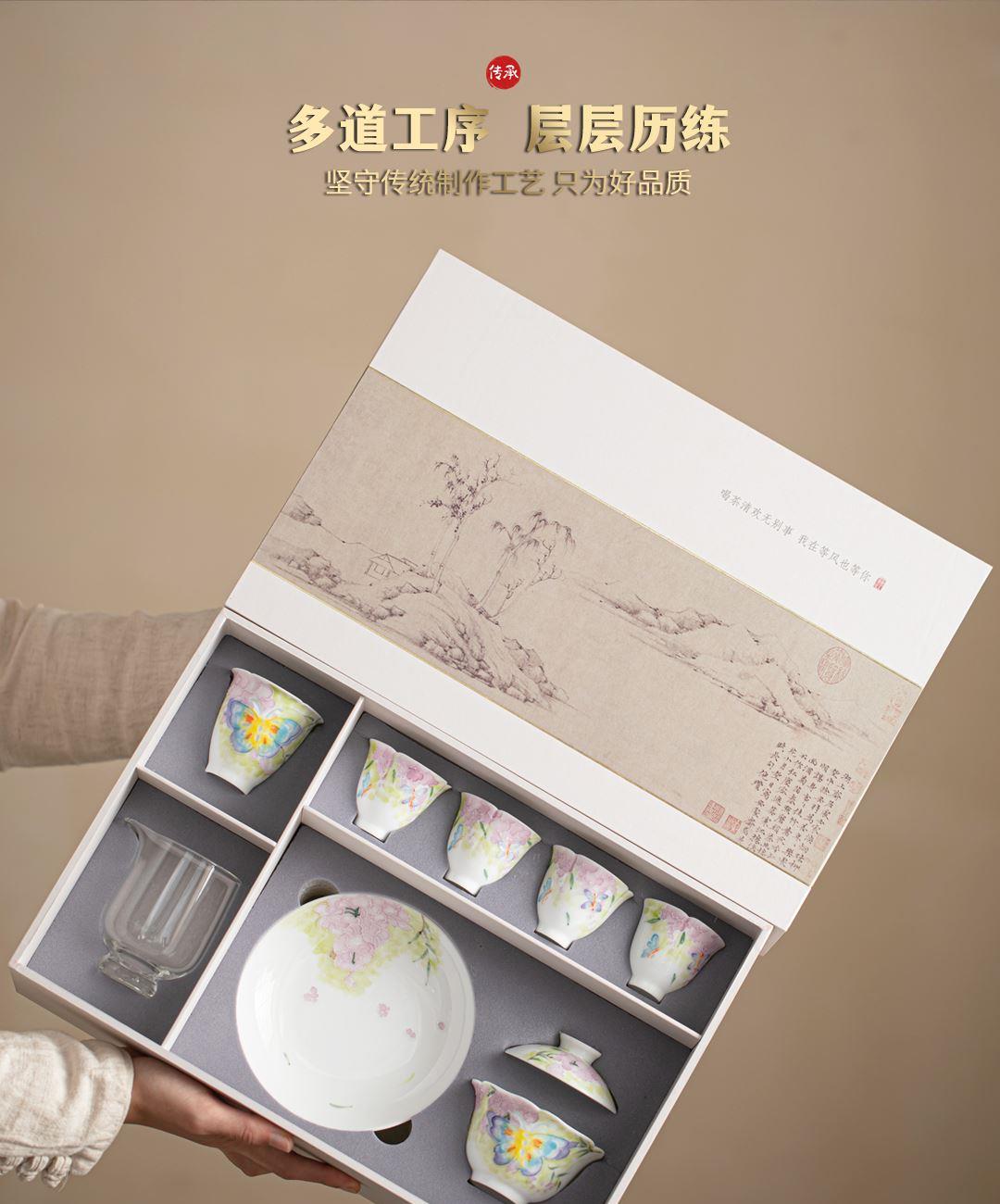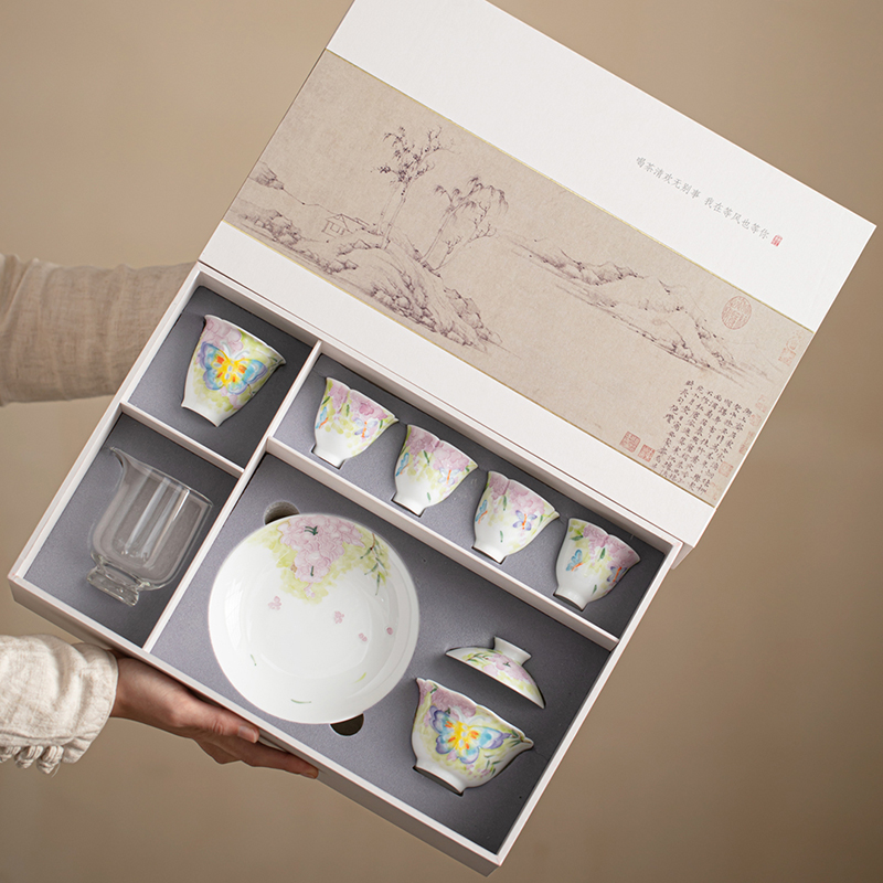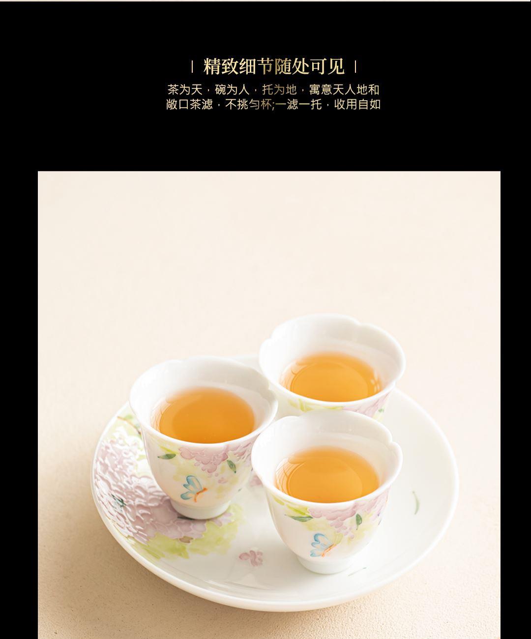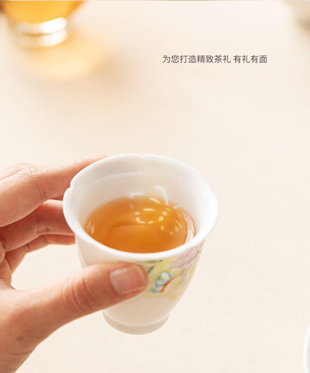 配置:茶碗*1,茶海*1,主人杯*1,茶杯*4. 尺寸:茶碗9.5*6cm 容量150ml, 茶海6.3*8.8cm 容量175ml, 主人杯6.4*6.5cm 容量70ml, 茶杯5.5*5.2cm 容量50ml, 茶碟14.2*3cm。 礼盒:38.5*25.5*12.5cm。