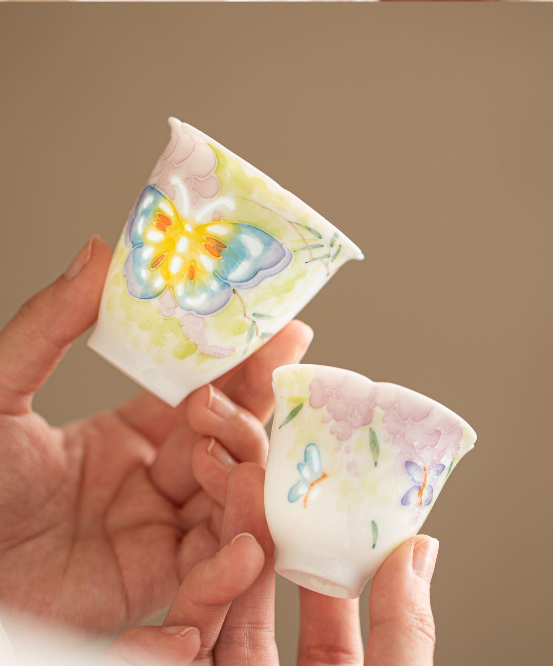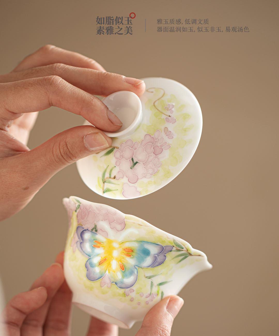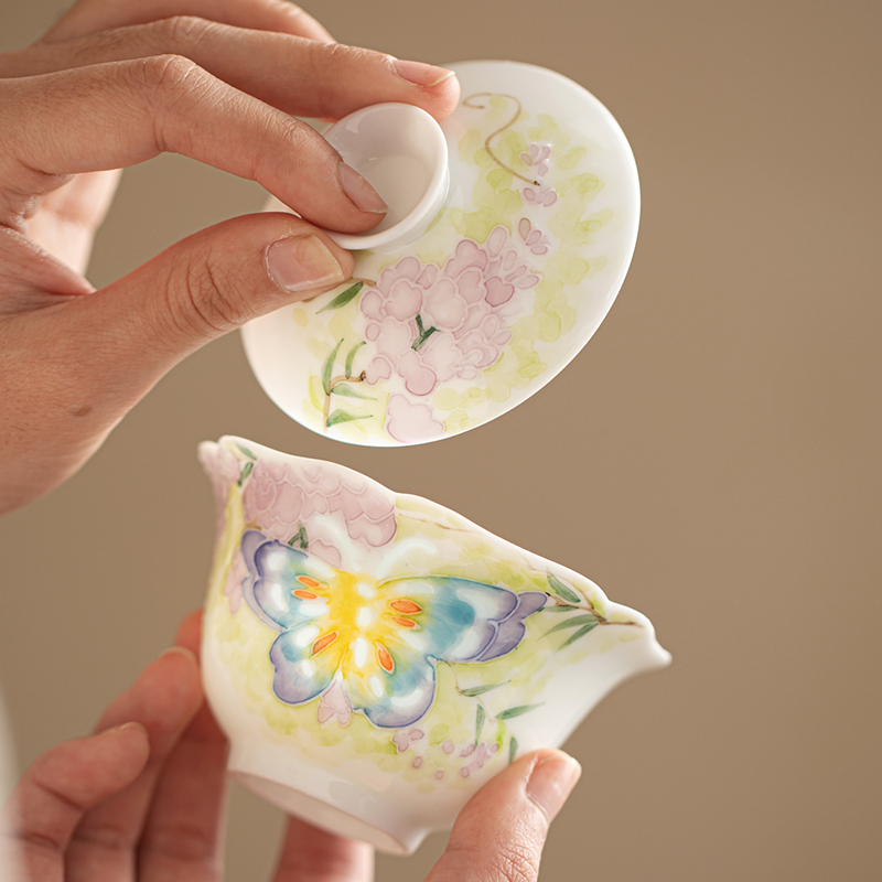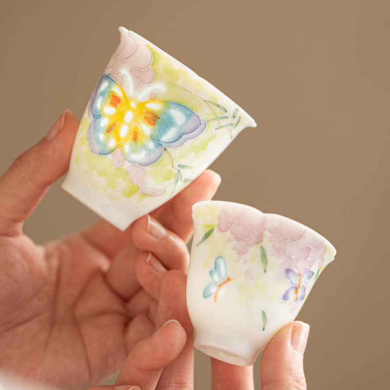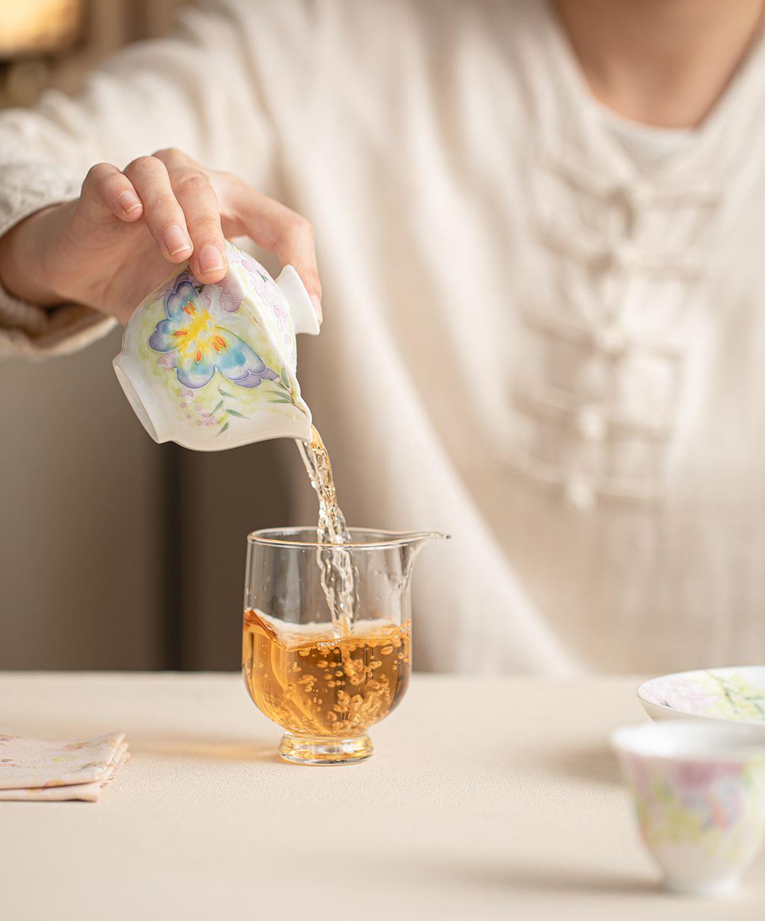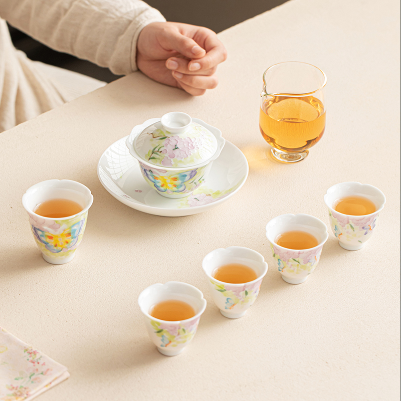 配置:茶碗*1,茶海*1,主人杯*1,茶杯*4. 尺寸:茶碗9.5*6cm 容量150ml, 茶海6.3*8.8cm 容量175ml, 主人杯6.4*6.5cm 容量70ml, 茶杯5.5*5.2cm 容量50ml, 茶碟14.2*3cm。 礼盒:38.5*25.5*12.5cm。