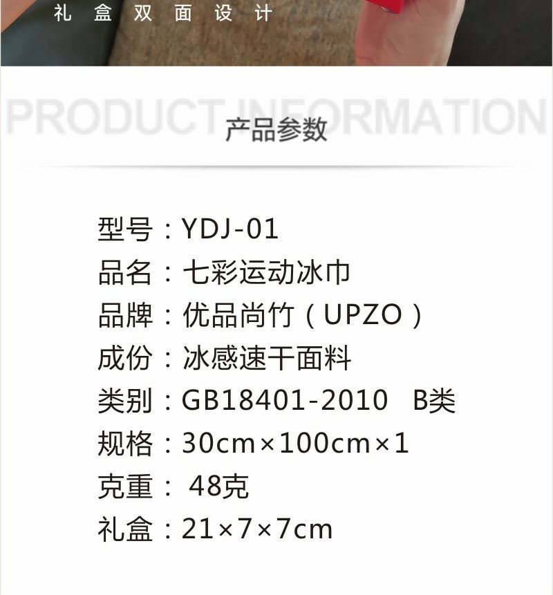 型号: YDJ-01 成份: 冰感速干面料 规格: 30cm×100cm 厚度标准: 48 克 类别: GB18401-2010 B类 礼盒:21*7*7CM 冰感面料 快速降温 精密走线 礼盒包装