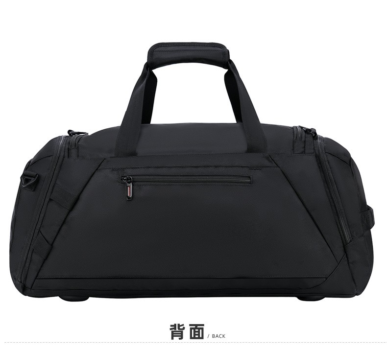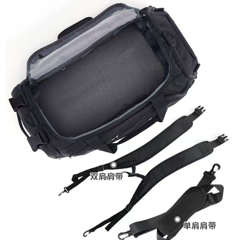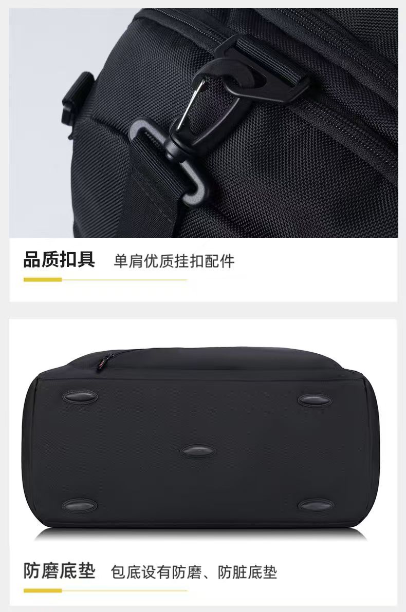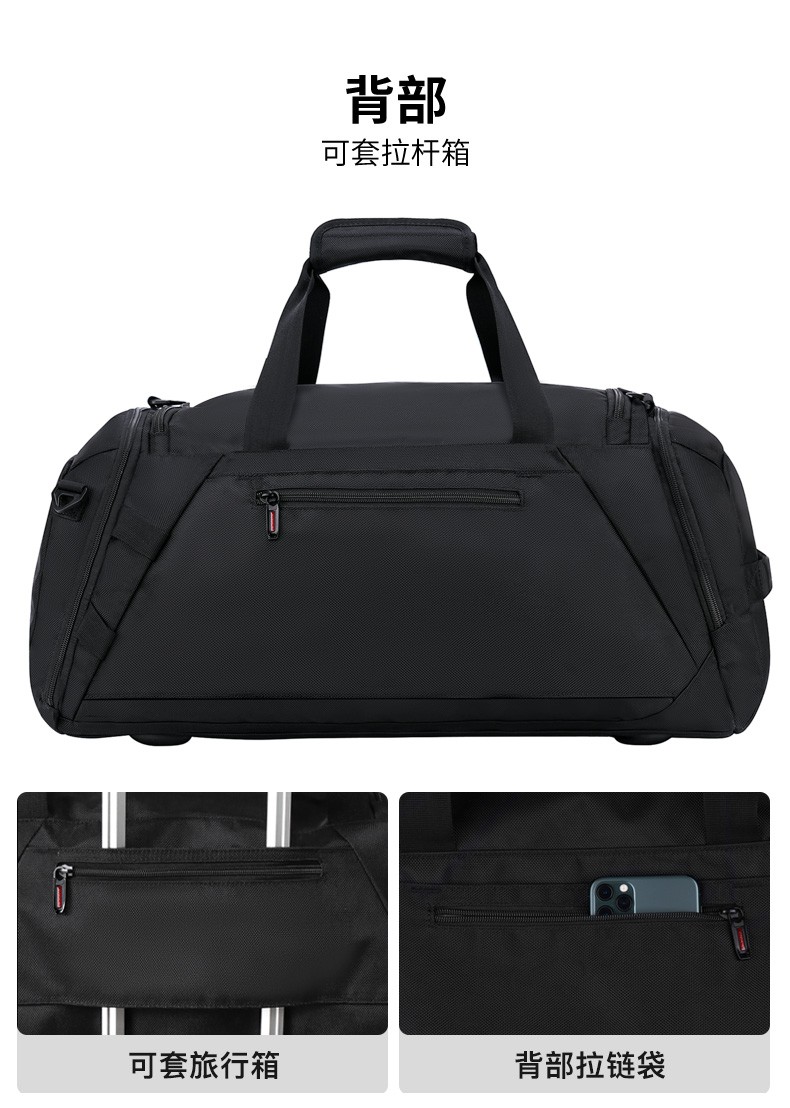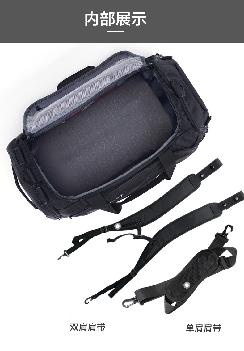 型 号:66001 尺 寸:28*26*57cm材 质:聚酯纤维 颜 色:黑色 重 量:1.0kg 旅行袋:可双肩背的旅行袋,独立鞋仓位、干湿分离储存。42升大容量,可单肩/可斜挎/可手提。
