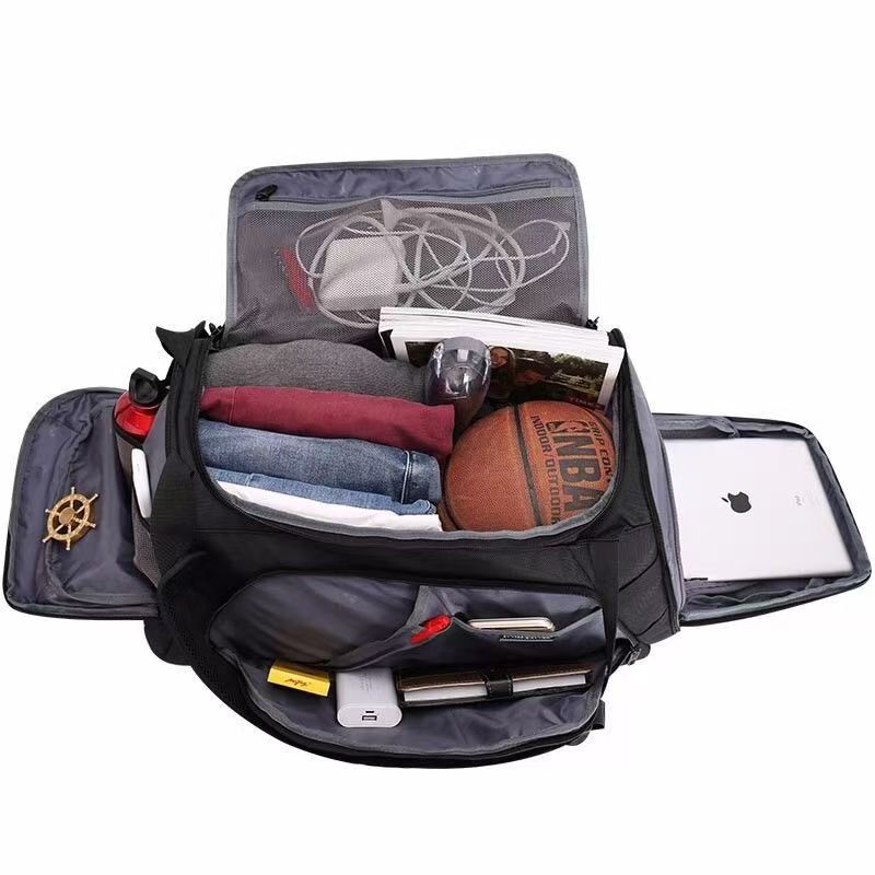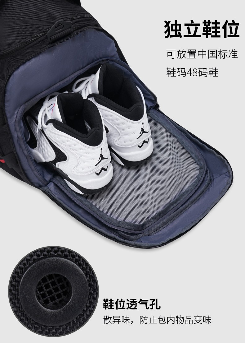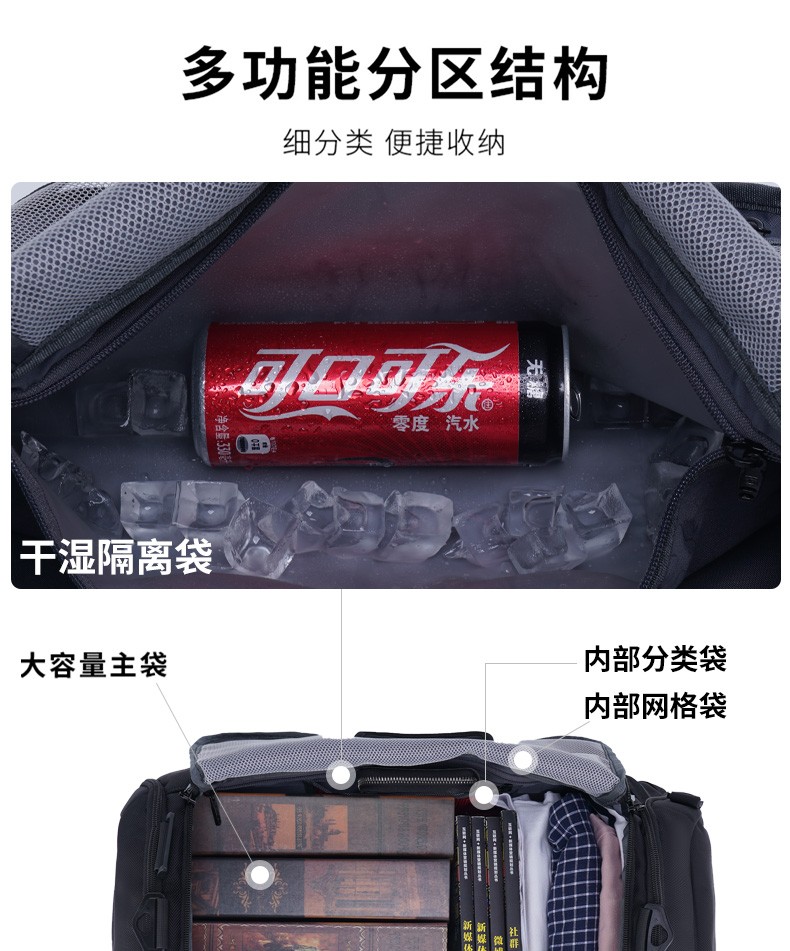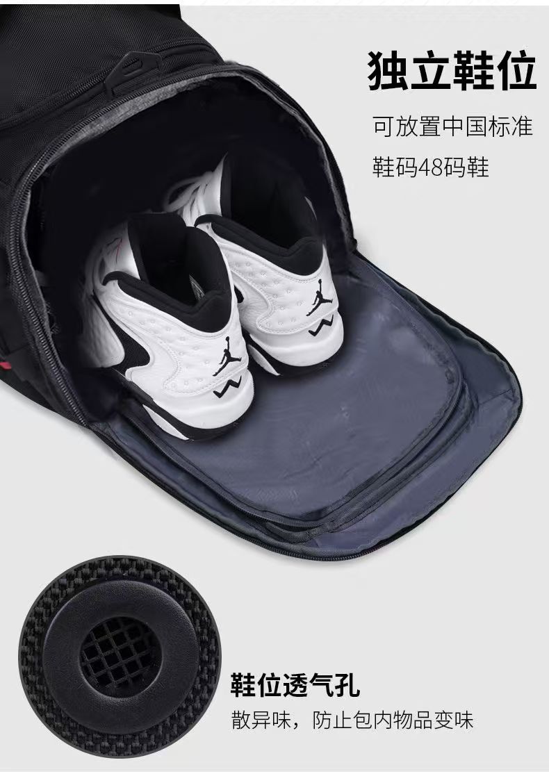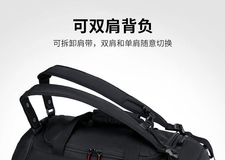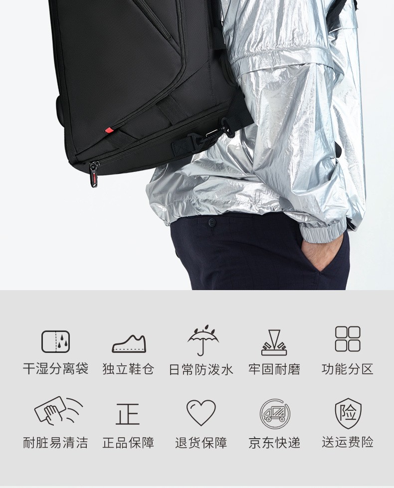 型 号:66001 尺 寸:28*26*57cm材 质:聚酯纤维 颜 色:黑色 重 量:1.0kg 旅行袋:可双肩背的旅行袋,独立鞋仓位、干湿分离储存。42升大容量,可单肩/可斜挎/可手提。