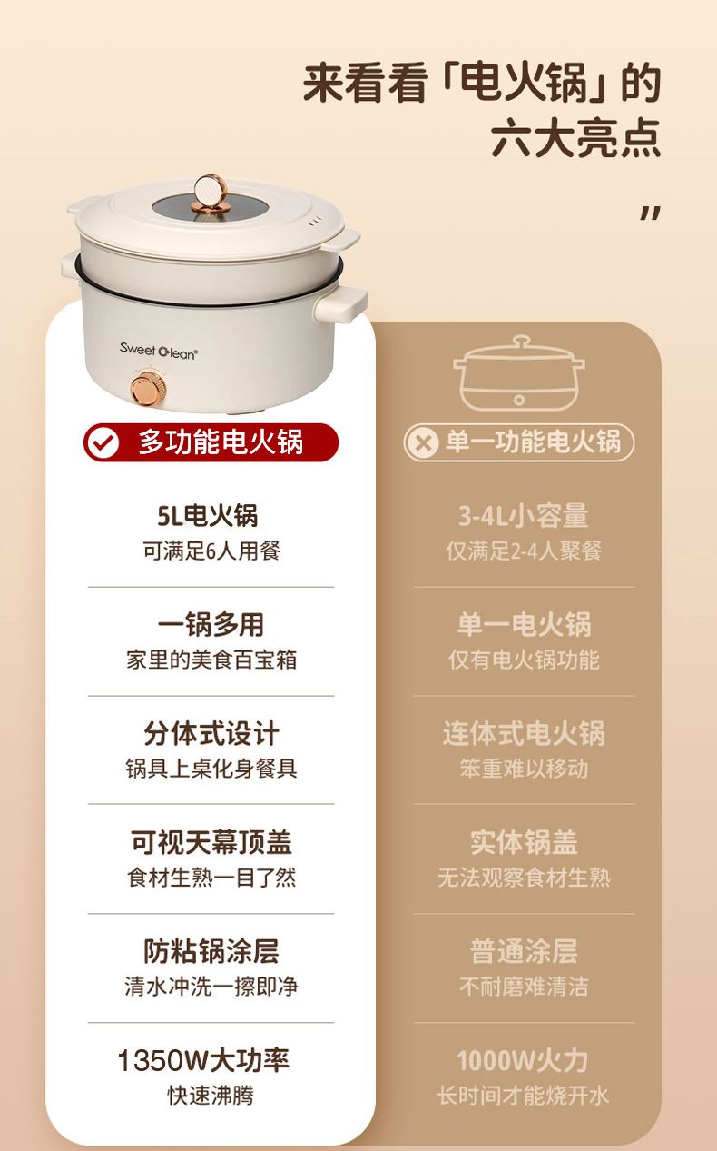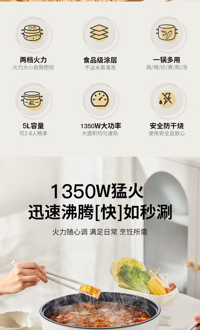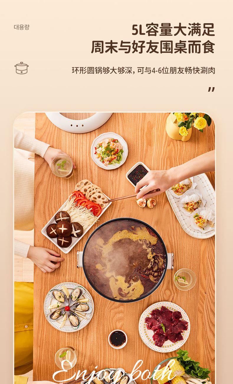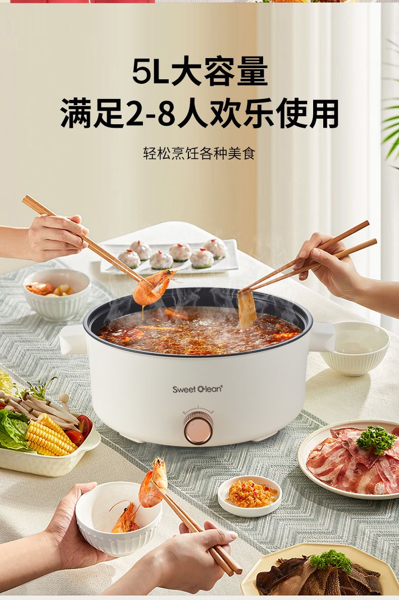 5L 大容量,3–6 人轻松开涮:家庭聚餐、朋友小聚一锅搞定,份量足不拥挤