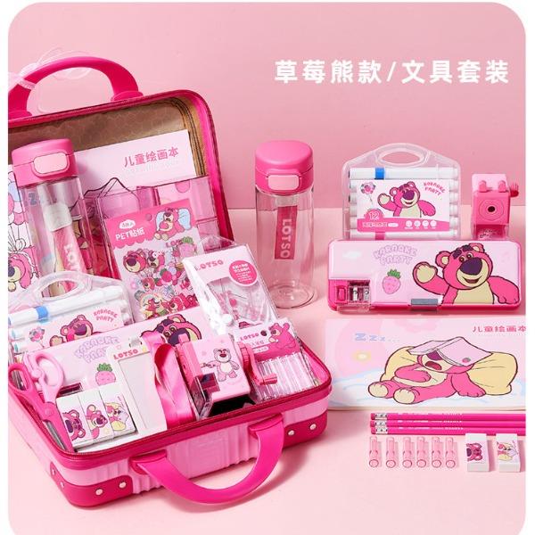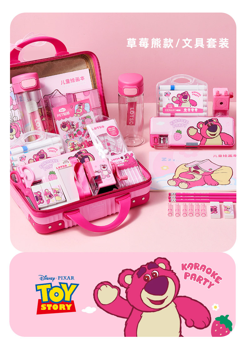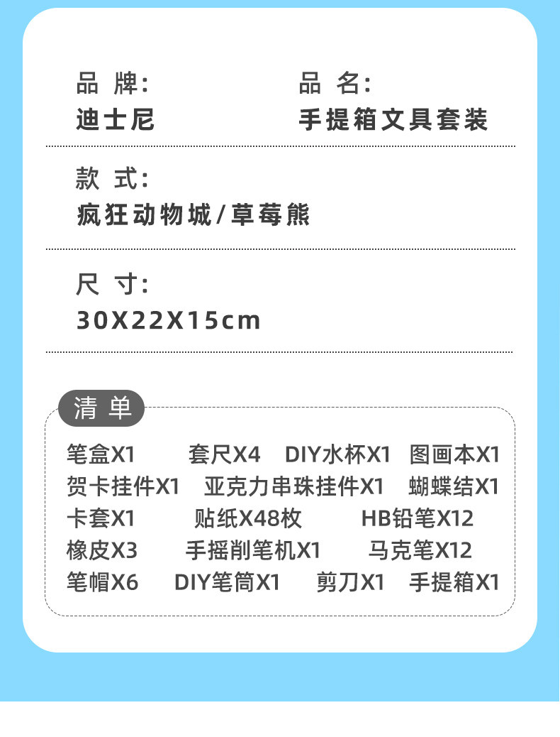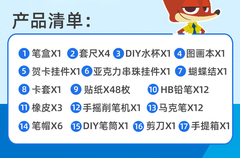 配置:笔盒*1、套尺*4、DIY水杯*1、图画本*1、贺卡挂件*1、亚克力串珠挂件*1、蝴蝶结X1、卡套*1、贴纸*48枚、HB铅笔*12、橡皮*3、手摇削笔机*1、马克笔*12、笔帽*6、DIY笔筒*1、剪刀*1、手提箱*1