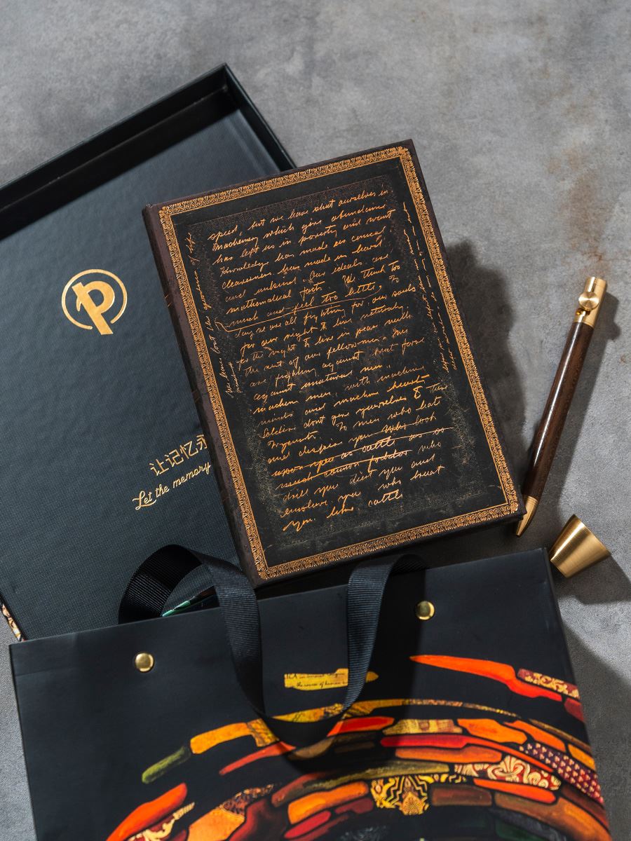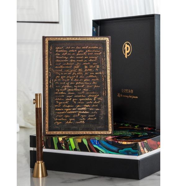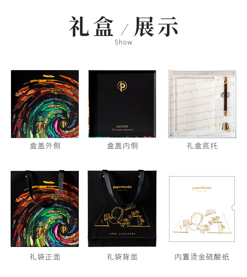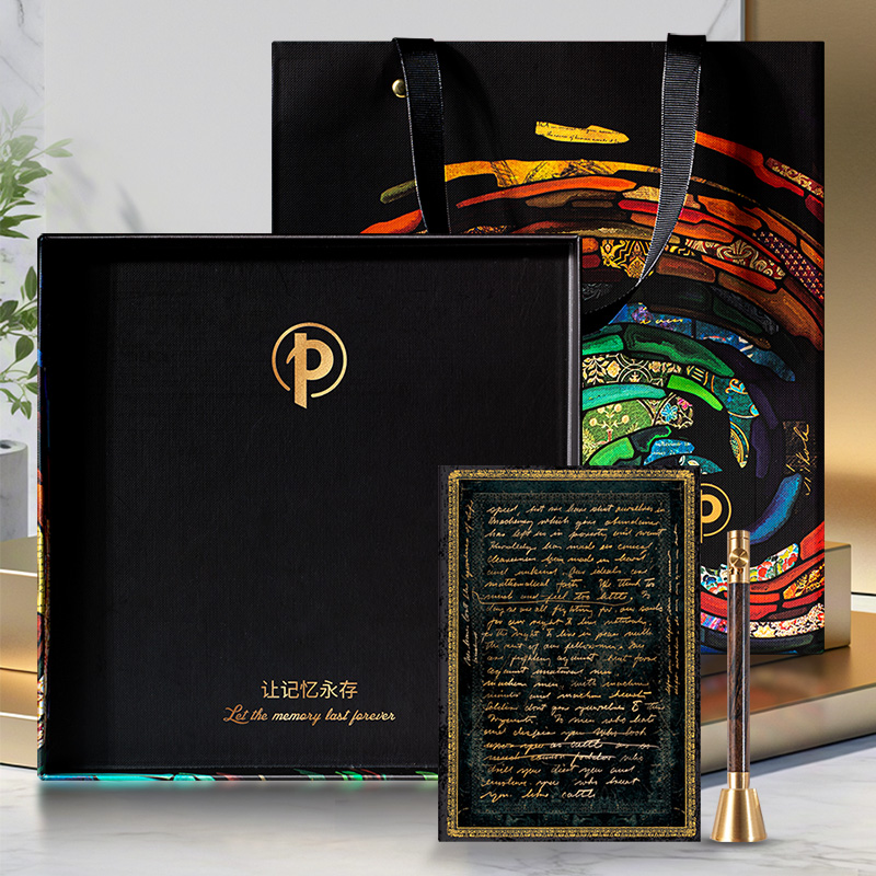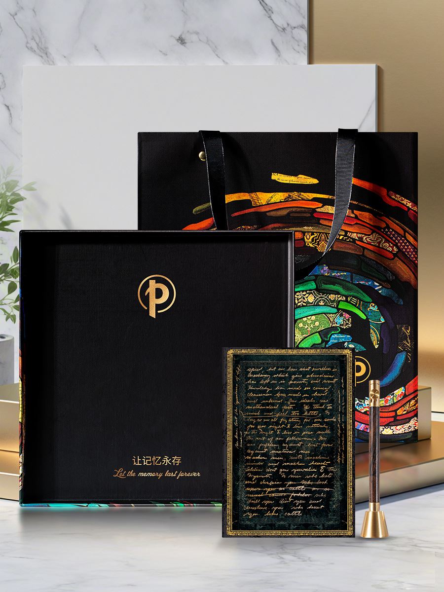 礼盒组件:黑柿木水性笔1只、黄铜笔座1个、中本笔记本、天地盖礼盒、彩色礼袋