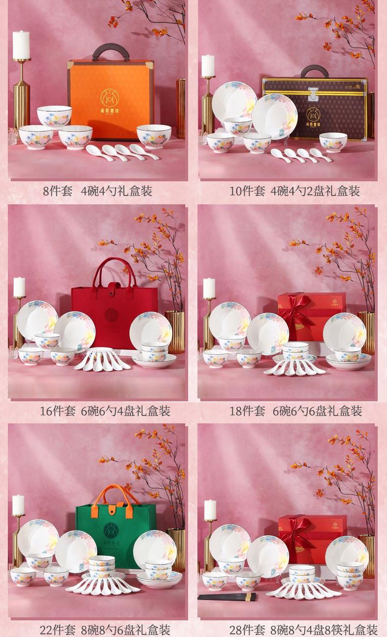 产品组成:8碗+8勺+4盘+8筷+礼盒 产品材质:低骨瓷 产品工艺:烤花+素烧 产品规格:4.5寸碗,三弯小勺,8寸盘 包装尺寸:32x23x9.2cm