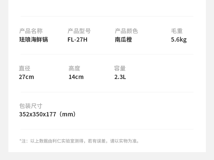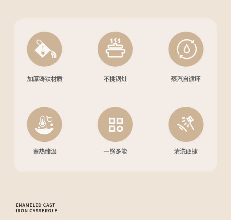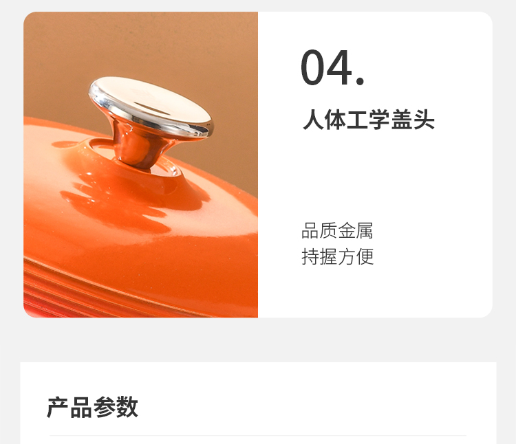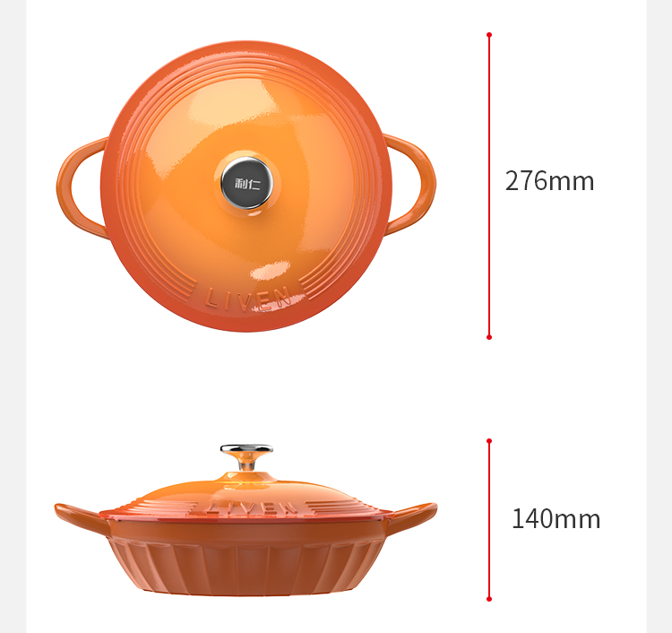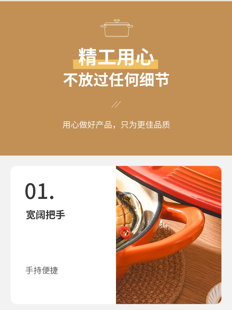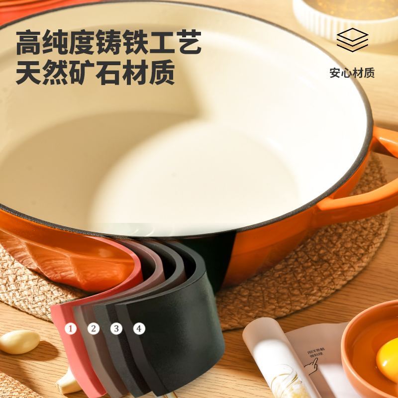 加厚铸铁材质,自循环炖煮 微压烹饪,均匀受热持久保温 27CM大口径细腻白色珐琅内壁 2.3L大容量一锅多能 煎炒煮炖焖 厚重珐琅锅体蓄热力强,持久保温慢烹饪 采用日本和土耳其进口珐琅釉