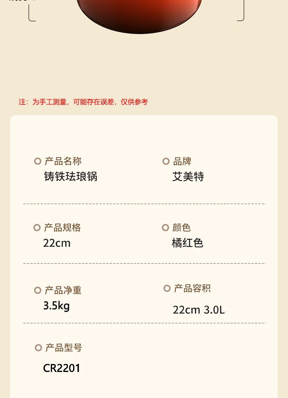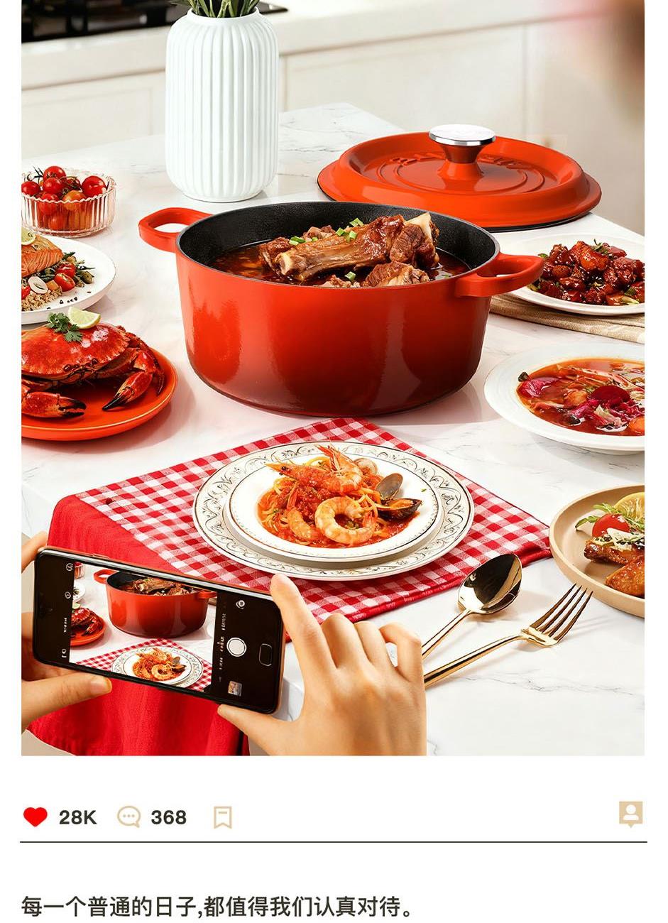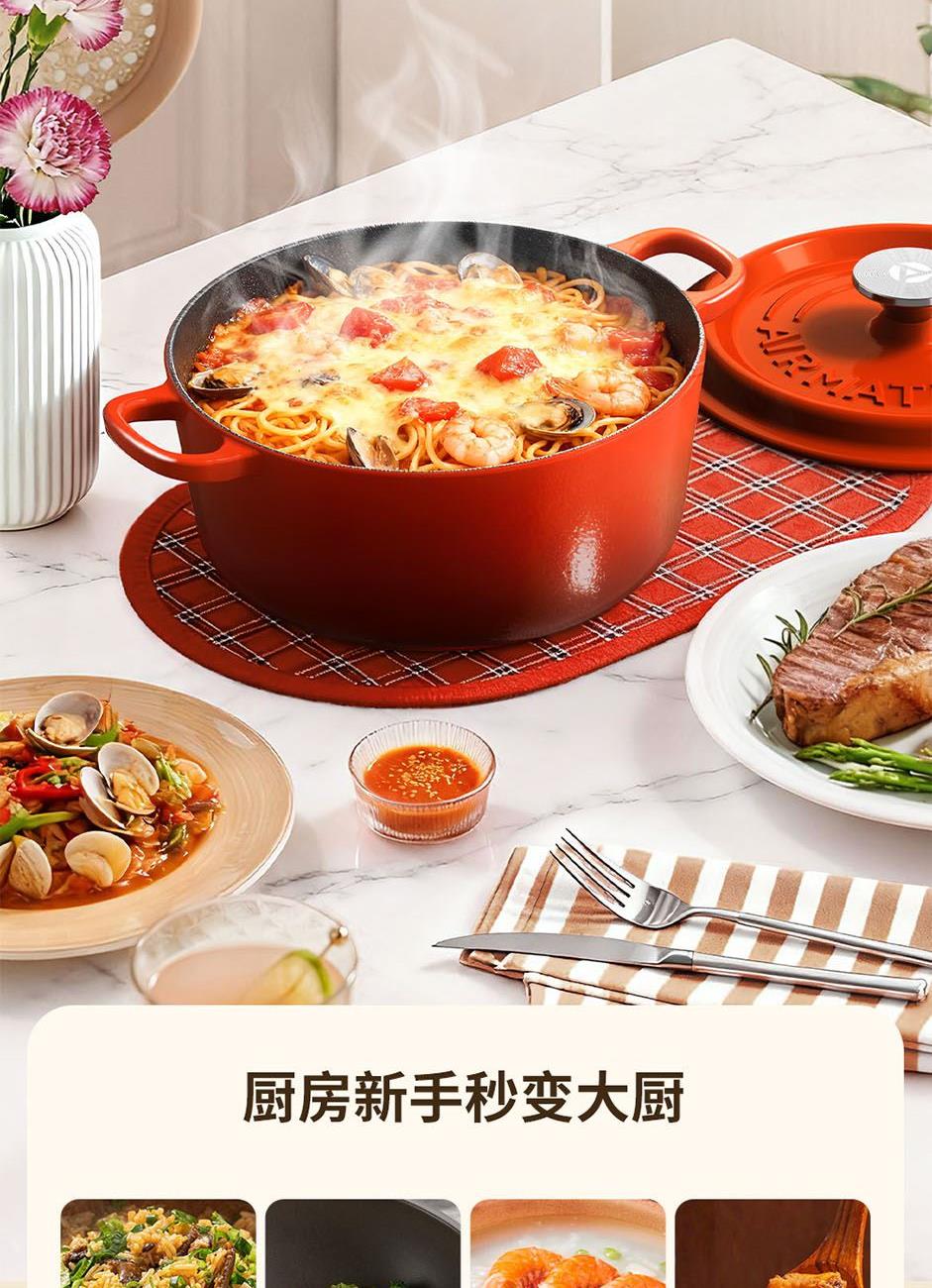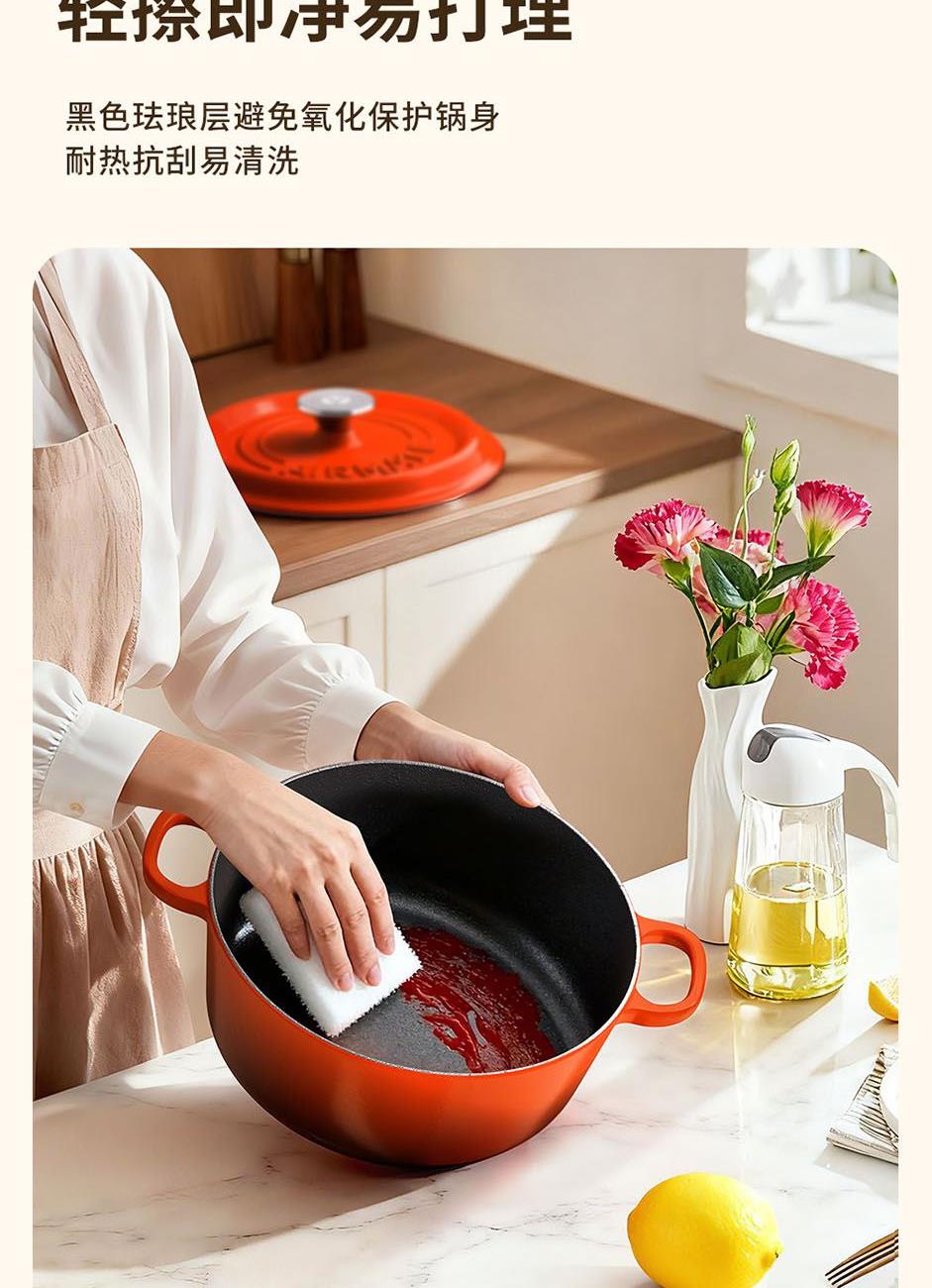 产品尺寸:22cm 产品净重:3.8kg 容量:3L 包装尺寸:295*295*150mm 1、铸铁材质,受热均匀,经久耐用 2、无机玻璃瓷釉,耐高温,不褪色,清洁方便 3、可用于炖、煲、焖、煎、炒、烤等多种烹饪方式 4、适用于多种炉灶,如电磁炉、电陶炉、明火、烤箱等,甚至还 能放在微波炉中使用
