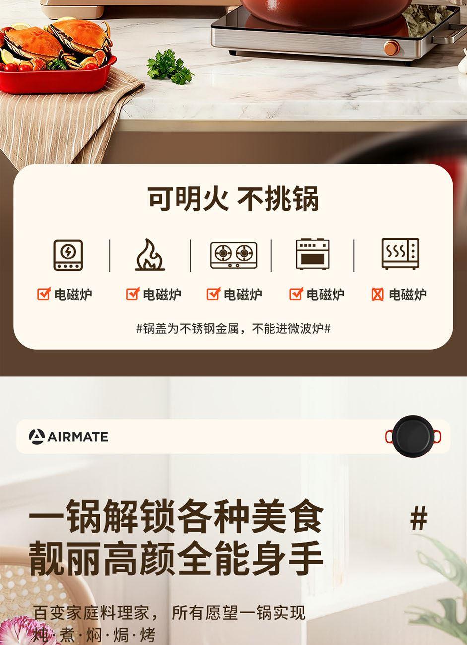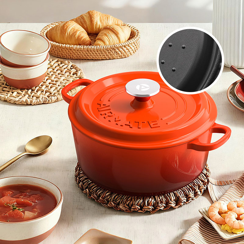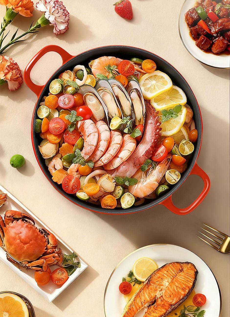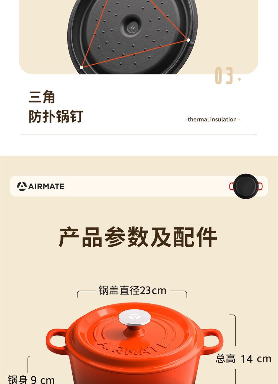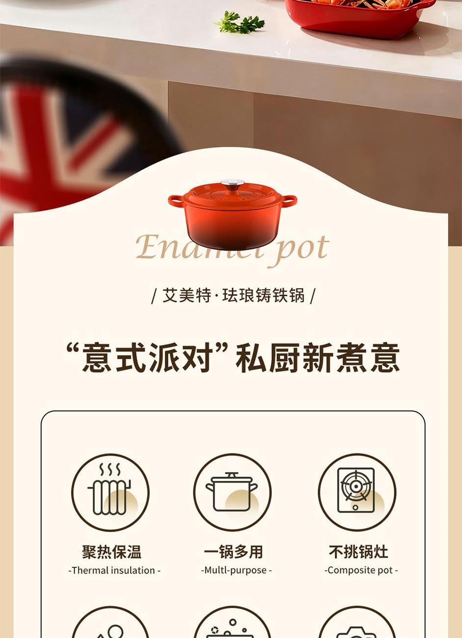 产品尺寸:22cm 产品净重:3.8kg 容量:3L 包装尺寸:295*295*150mm 1、铸铁材质,受热均匀,经久耐用 2、无机玻璃瓷釉,耐高温,不褪色,清洁方便 3、可用于炖、煲、焖、煎、炒、烤等多种烹饪方式 4、适用于多种炉灶,如电磁炉、电陶炉、明火、烤箱等,甚至还 能放在微波炉中使用