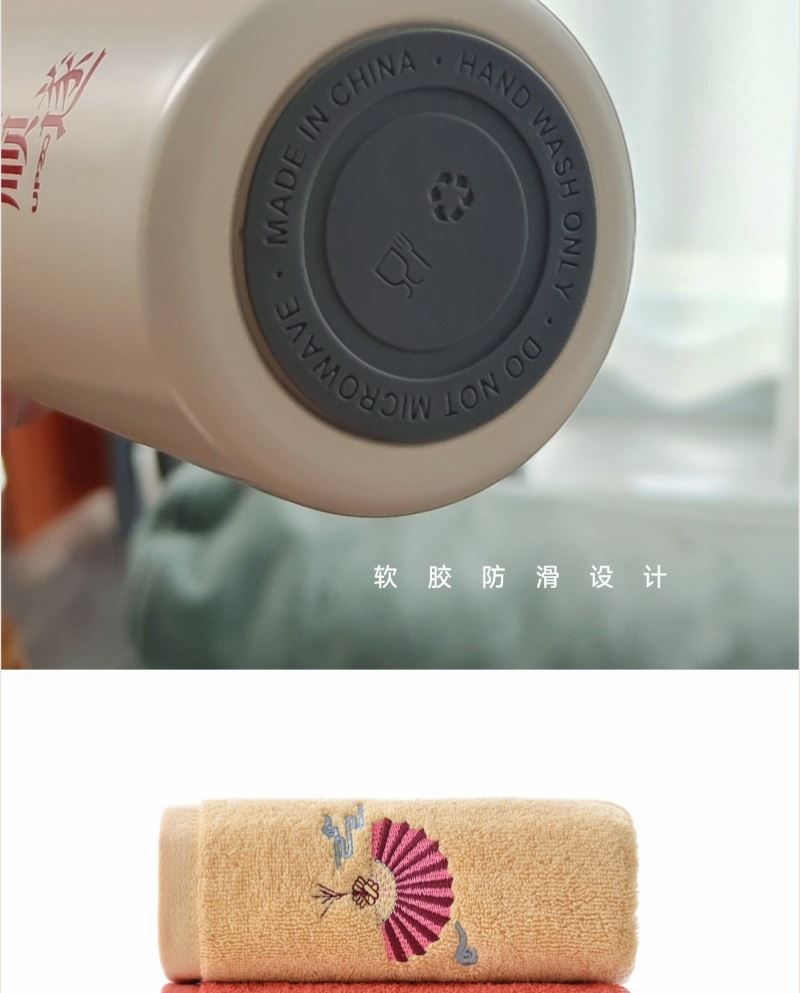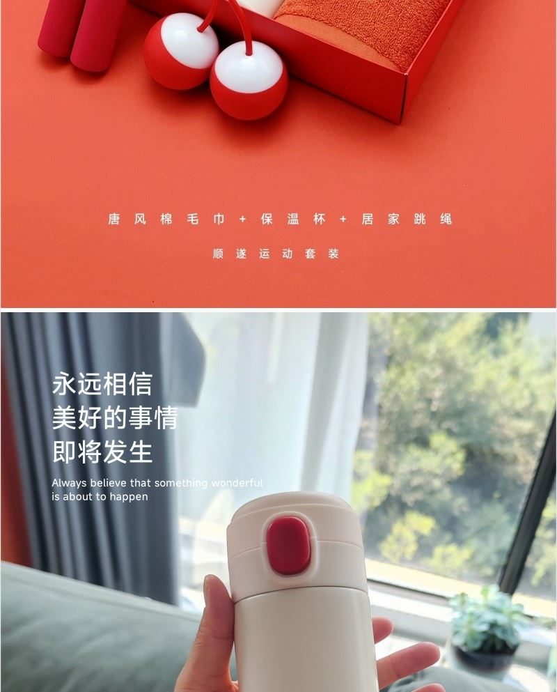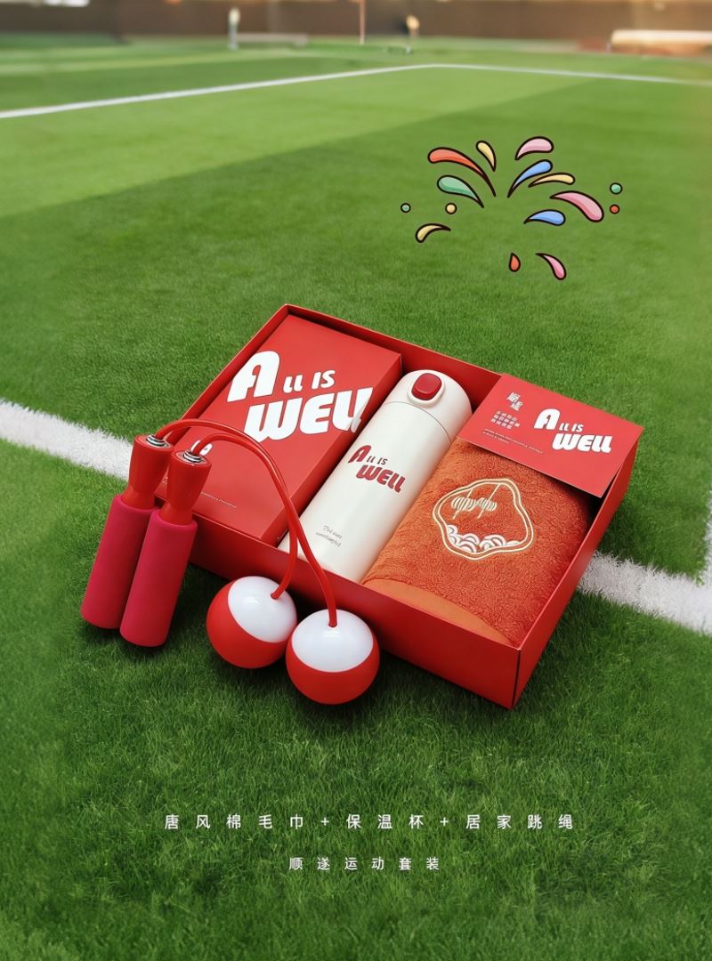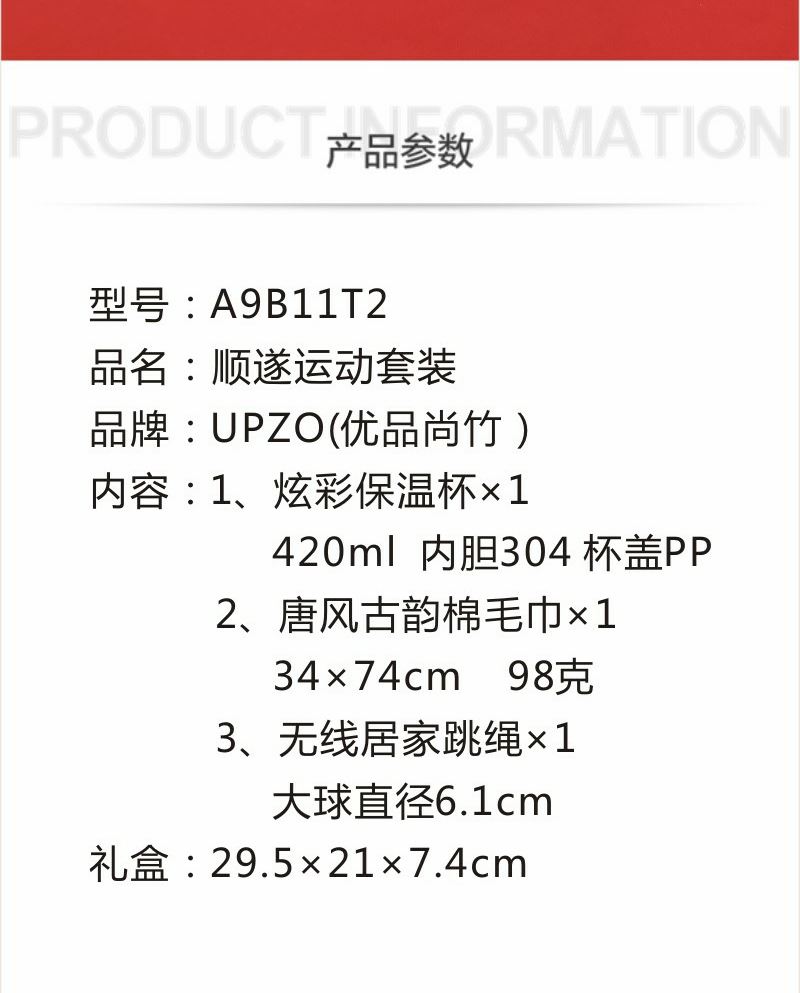 型号: A9B11T2 产品内容 1、唐风古韵大毛巾×1 克重98 克 34*74CM 2、无线居家跳绳×1 大球6.1CM 直径 软胶球面设计 3、炫彩保温杯 420毫升容量 内胆304 杯盖PP 外盒:29.5×21×7.4cm 天地盖+拎袋 唐风毛巾精选精梳棉材质 结合国风刺绣主题融入 品质好礼 420毫升高颜值保温杯 304内胆 精美设计文案 居家无线跳绳 采用大号球体 软胶设计 模拟真实跳绳感受