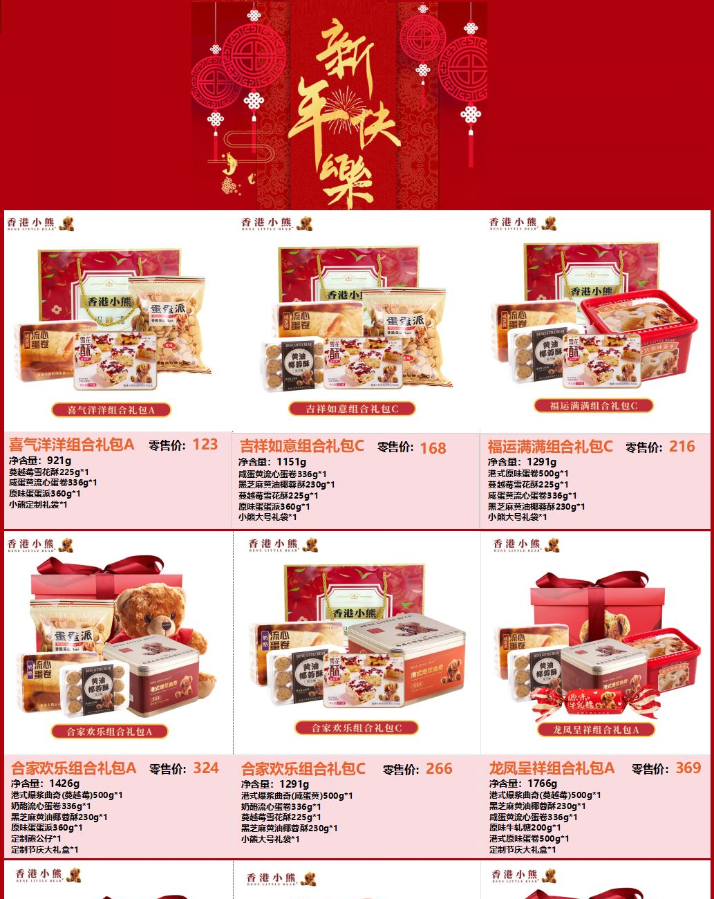 香港小熊,主打健康,美味,用心,产品覆盖了小熊曲奇,蛋卷王,凤梨酥,脆片,雪花酥,牛轧糖等40-50款。产品大多选用进口黄油,可可,抹茶粉等优质原材料,打造0添加健康食品,口感细腻浓郁,层次丰富回味无穷。包装方面,涵盖了铁盒,精致透明盒,节庆特色礼盒等多系列。