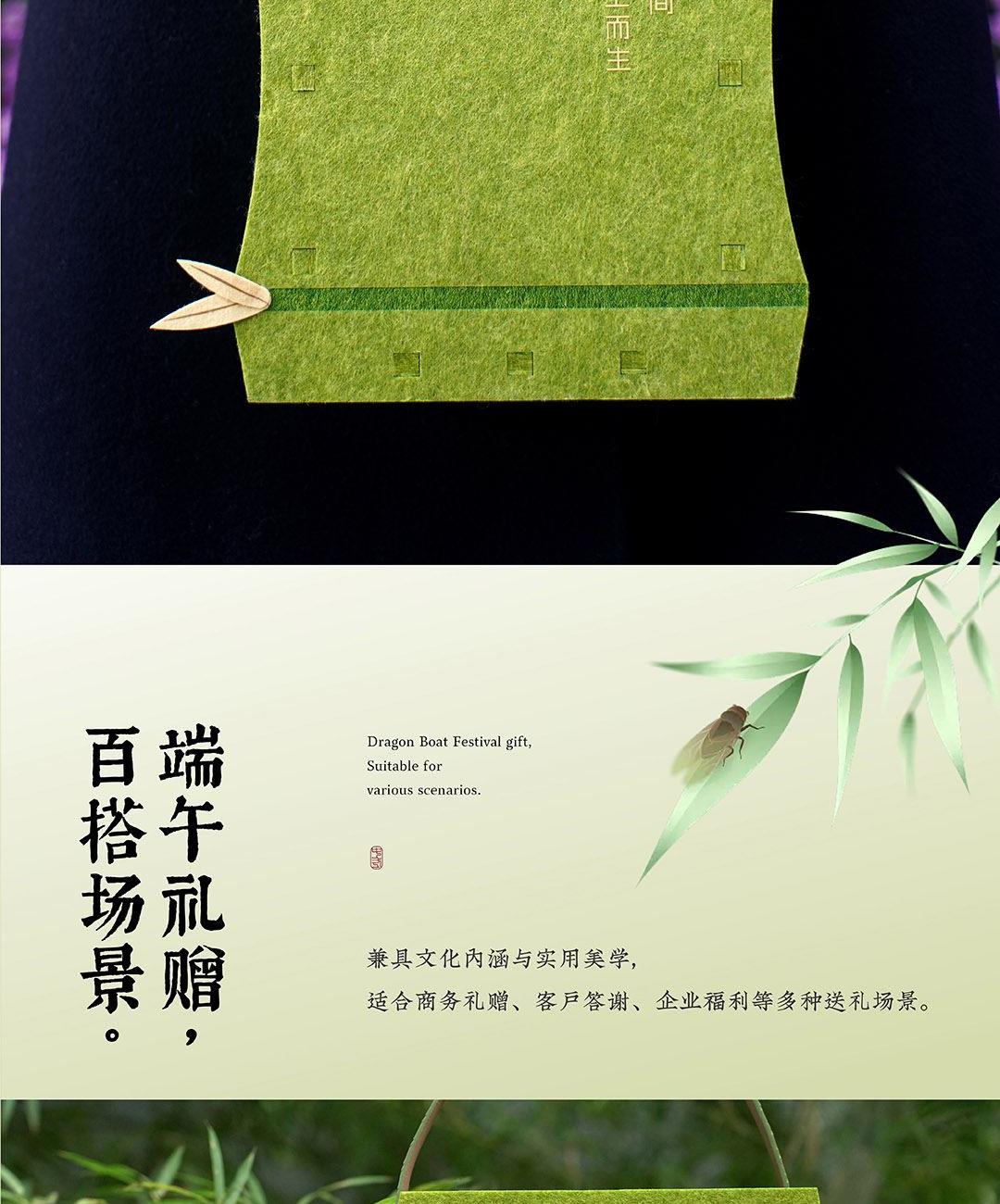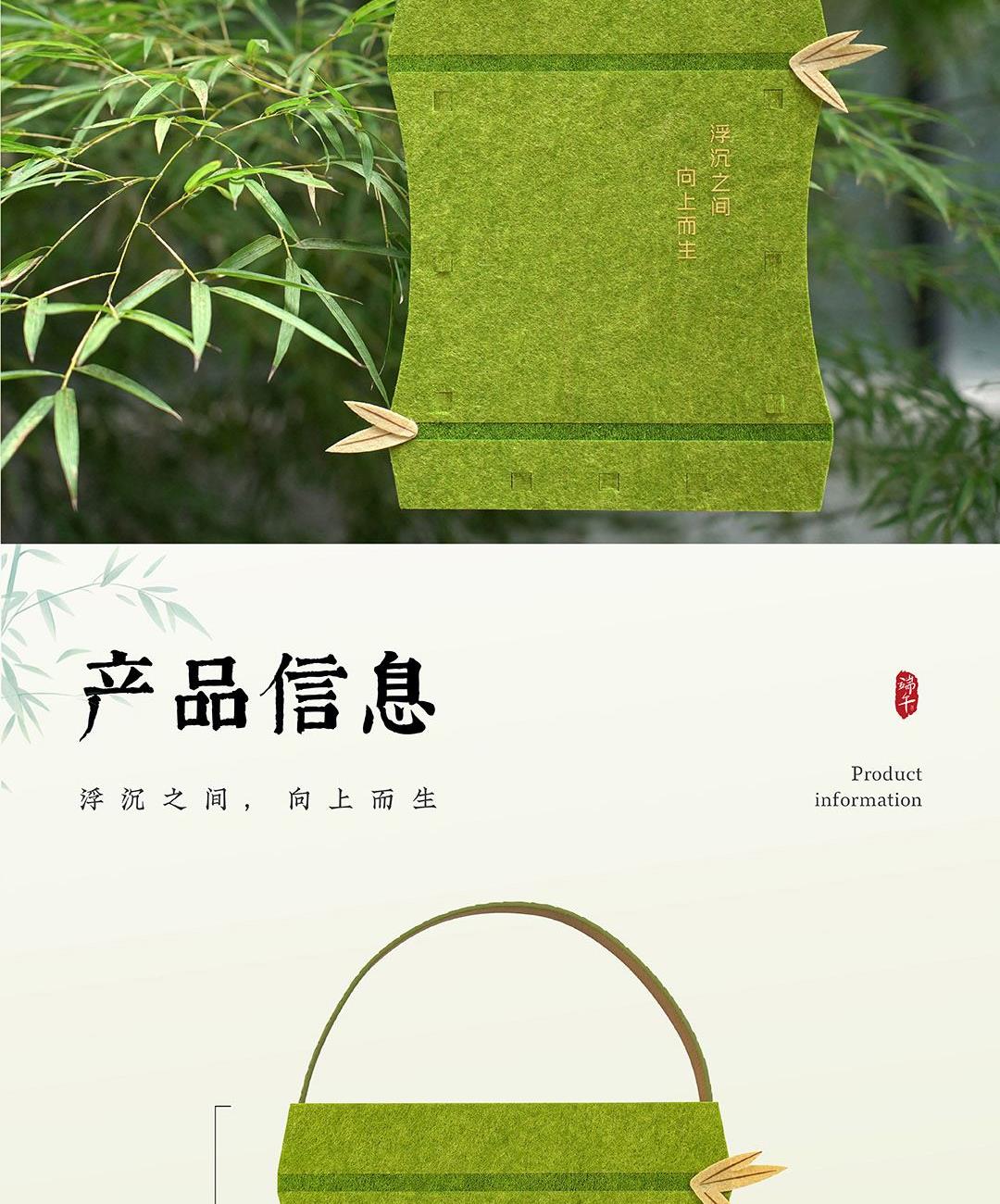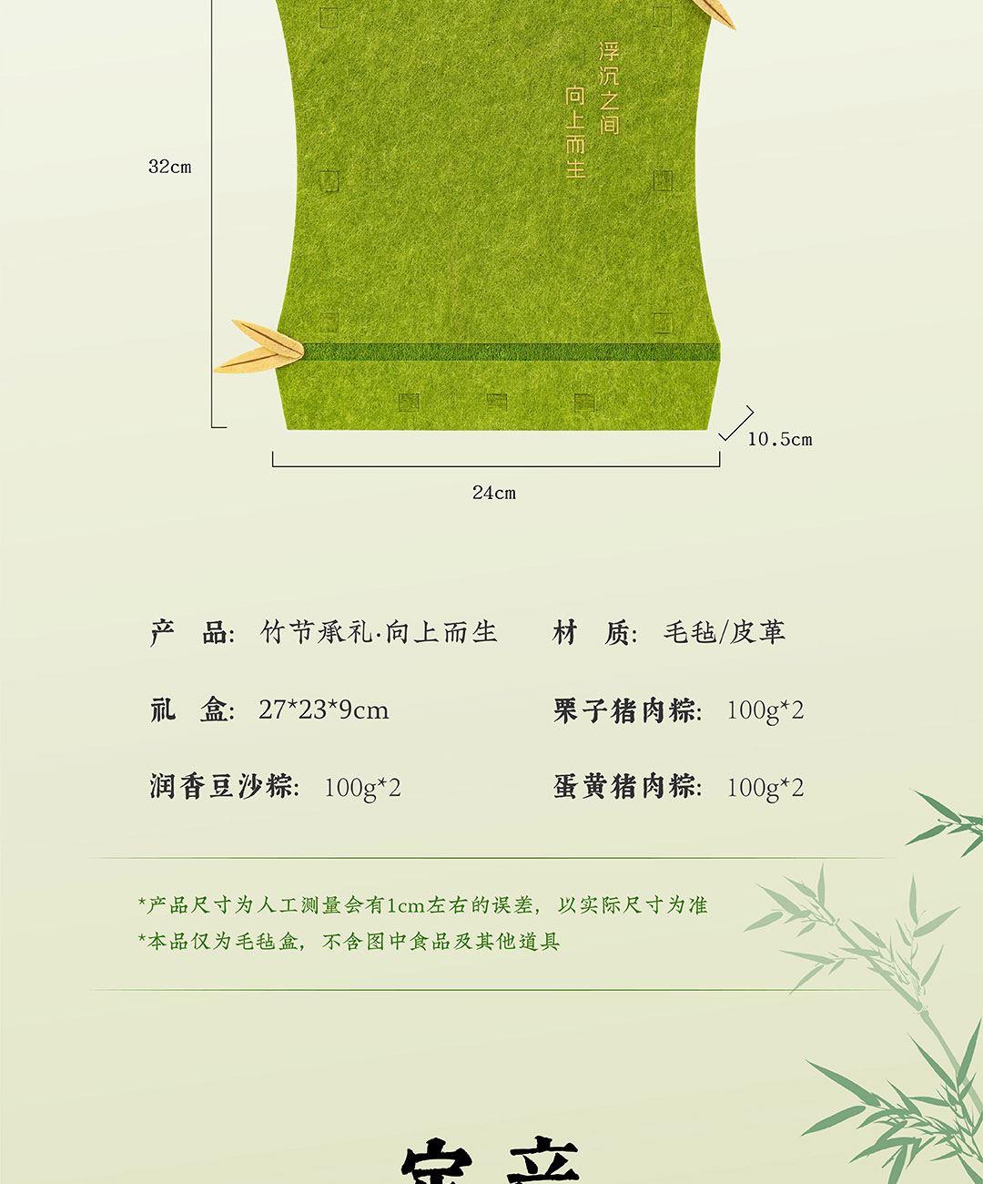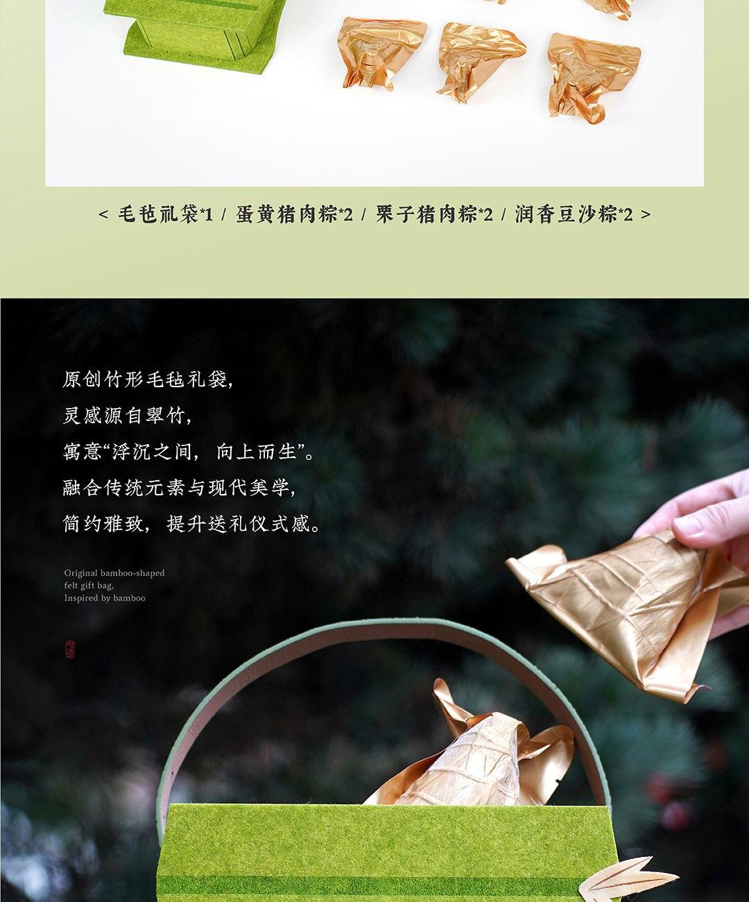 仲夏端午,以现代设计包裹传统滋味。 灵感取自竹——浮沉中向上,坚韧中生长。 将竹节形态化为雅致毛毡袋,配以清新绿色与烫金工艺, 让每一份粽礼,都承载向上的力量。 产品 / Product Mini 竹节承礼·向上而生 材质 / Material 毛毡 人造革 规格 / Size 礼盒:27*23*9cm 真空润香豆沙粽:2*100g 蛋黄猪肉粽:2*100g 栗子猪肉粽:2*100g
