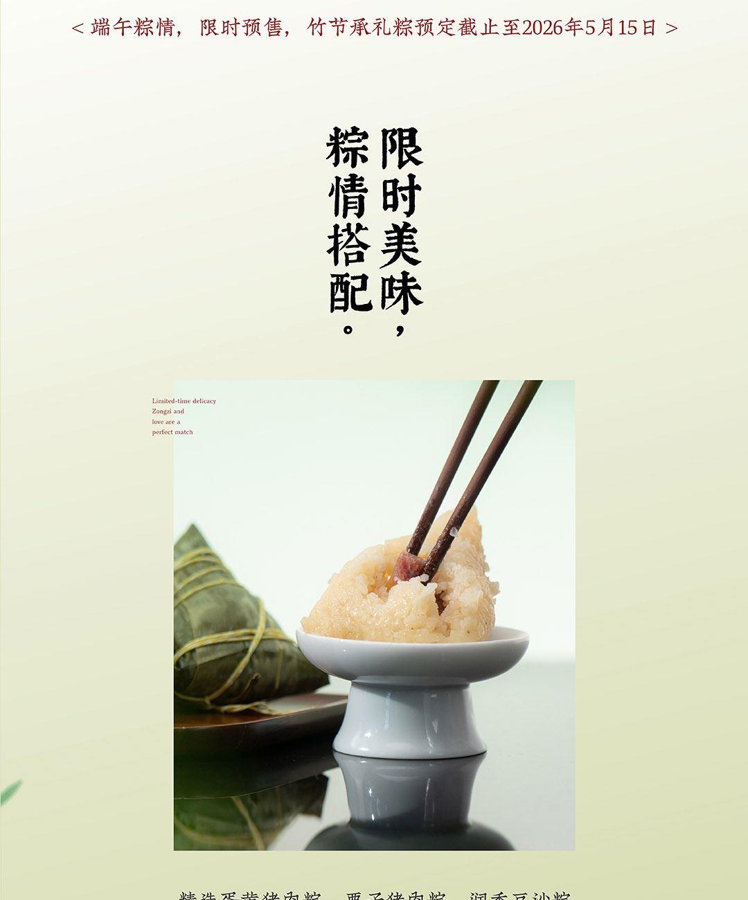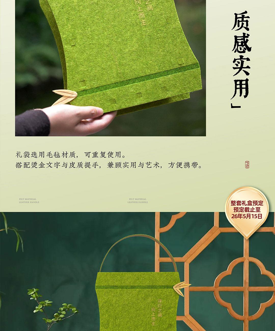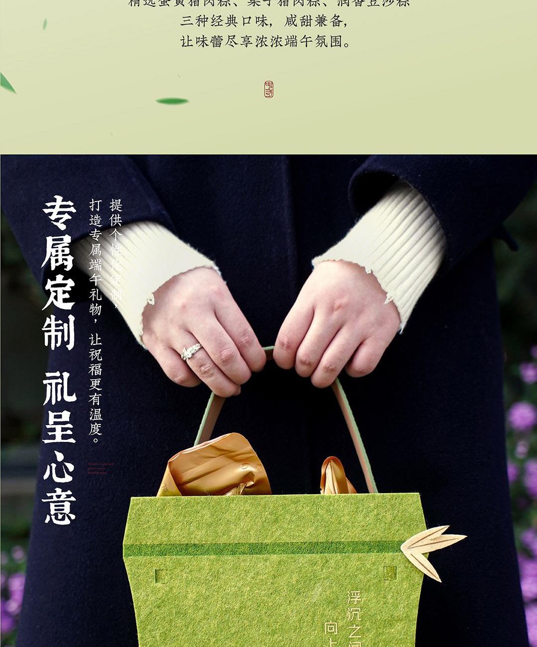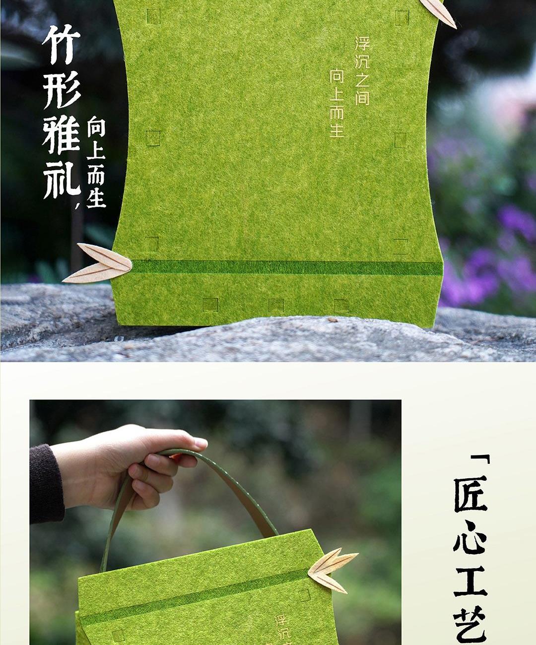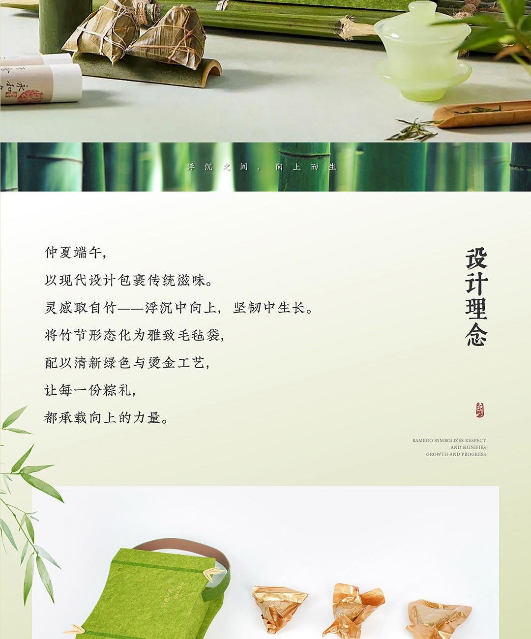 仲夏端午,以现代设计包裹传统滋味。 灵感取自竹——浮沉中向上,坚韧中生长。 将竹节形态化为雅致毛毡袋,配以清新绿色与烫金工艺, 让每一份粽礼,都承载向上的力量。 产品 / Product Mini 竹节承礼·向上而生 材质 / Material 毛毡 人造革 规格 / Size 礼盒:27*23*9cm 真空润香豆沙粽:2*100g 蛋黄猪肉粽:2*100g 栗子猪肉粽:2*100g