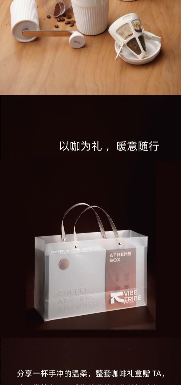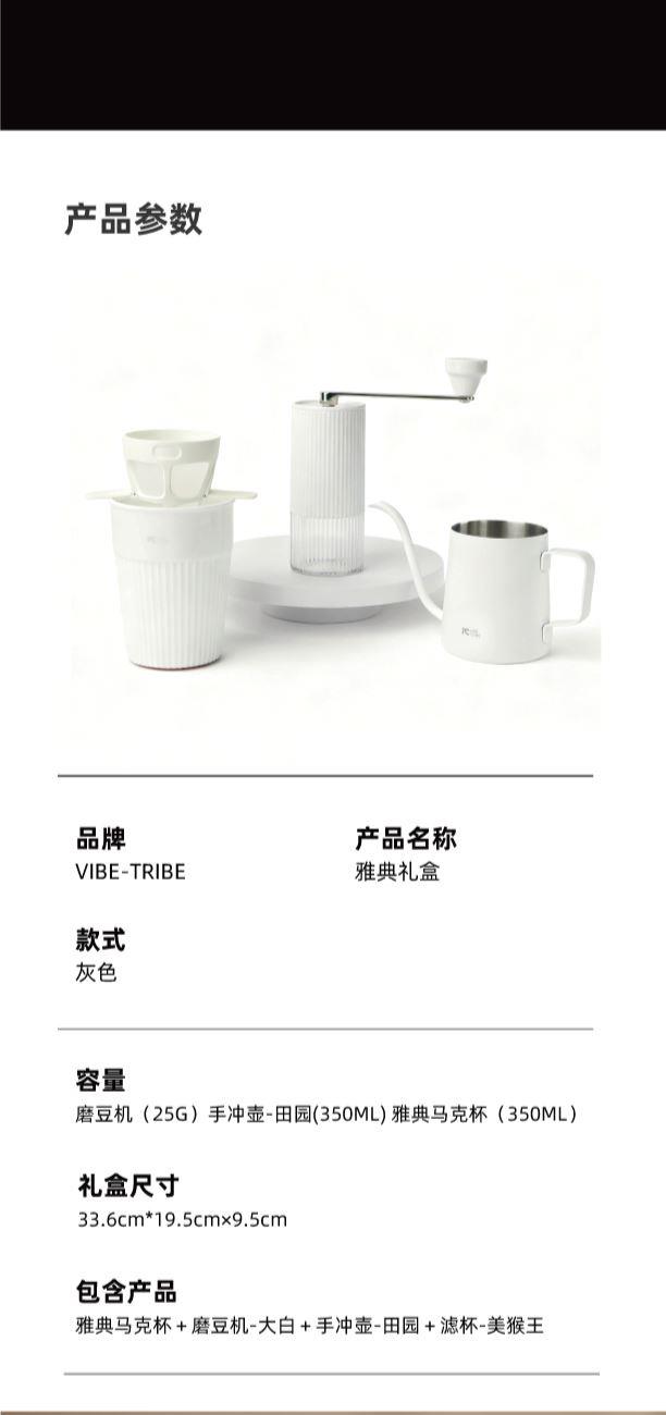 产品:VIBE-TRIBE雅典礼盒 彩盒尺寸:336*195×95mm 产品材质:304 不锈钢 、陶瓷(磨芯)、陶瓷、PP、PC 包含产品:雅典马克杯+磨豆机-大白+手冲壶-田园+滤杯-美猴王 核心卖点: 1.含超白玲珑瓷陶瓷杯安全耐热易清洁,耐高温无异味、0吸水性,不倒设计,有效避免倾倒; 2.采用简约便携磨豆机,细腻可循环使用滤网,90度稳定出水手冲壶; 3.一套满足手冲需求,赠送透明手提袋体面又实用,是商务往来、客户答谢的质感之选;